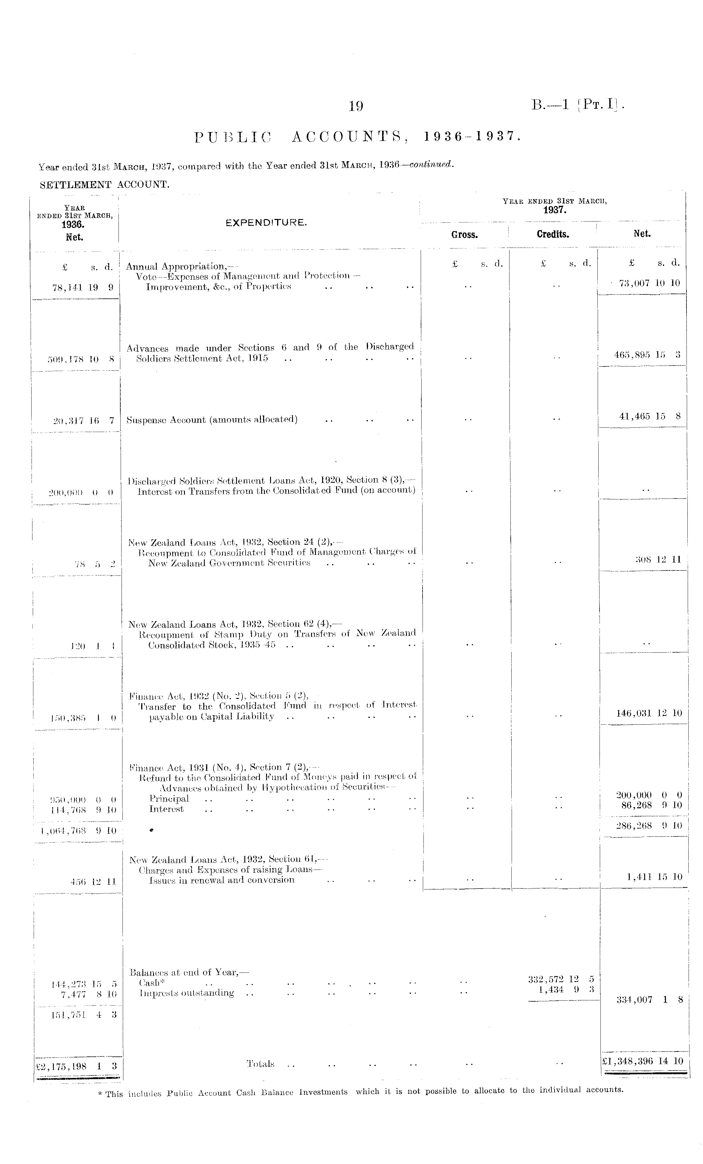 Year ended 31st MARCH, Year 1937 ended 81st March, 1936. EXPENDITURE. J p Ket. Gross. Credits. Net. £ s. d. Annual Appropriation,— £ s. d. £ s. d. £ s. d. Vote—Expenses of Management and Protection — 78,141 19 9 Improvement, &c., of Properties .. .. •• •• •• ' '3,007 10 10 Advances made under Sections 6 and 9 of the Discharged 509,178 10 8 Soldiers Settlement Act, 1915 .. .. •• •• •• 465,895 lo 20,317 16 7 Suspense Account (amounts allocated) .. .. .. •• 41,465 15 8 Discharged Soldiers Settlement Loans Act, 1920, Section 8 (3), 200,000 0 0 Interest on Transfers from the Consolidated Fund (on account) New Zealand Loans Act, 1932, Section 24 (2), — Recoupment to Consolidated Fund of Management Charges of 78 5 2 New Zealand Government Securities .. .. •• •• •• 3081-11 New Zealand Loans Act, 1932, Section 62 (4), — Recoupment of Stamp Duty on Transfers of New Zealand 120 1 1 Consolidated Stock, 1935-45 .. .. • • • • • • • • Finance Act, 1932 (No. 2), Section 5 (2),— — Transfer to the Consolidated Fund in respect of Interest . 150,385 1 0 payable on Capita] Liability .. .. •• •• •• 146,031 12 10 Finance Act, 1931 (No. 4), Section 7 (2), — Refund to the Consolidated Fund of Moneys paid in respect of Advances obtained by Hypothecation of Securities — 950,000 0 0 Principal .. .. •• •• •• •• •• 2 ofi'SfiS q in 114,768 9 10 Interest .. .. •• •• " 8b,-bb 9 1U 1,064,768 9 10 ♦ 286,268 9 10 New Zealand Loans Act, 1932, Section 61, — Charges and Expenses of raising Loans— 456 12 11 Issues in renewal and conversion .. •• •• •• 1,411 15 10 Balances at end of Year, — 144,273 15 5 Cash* .. .. ..... •• •• Mo! q f 7,477 8 10 Imprests outstanding .. .. •• •• •• 334 007 1 8 151,751 4 3 £2,175,198 I 3 Totals .. .. •• •• •• £1,348,396 14 10 * This includes Public Account Cash Balance Investments which it is not possible to allocate to the individual accounts.