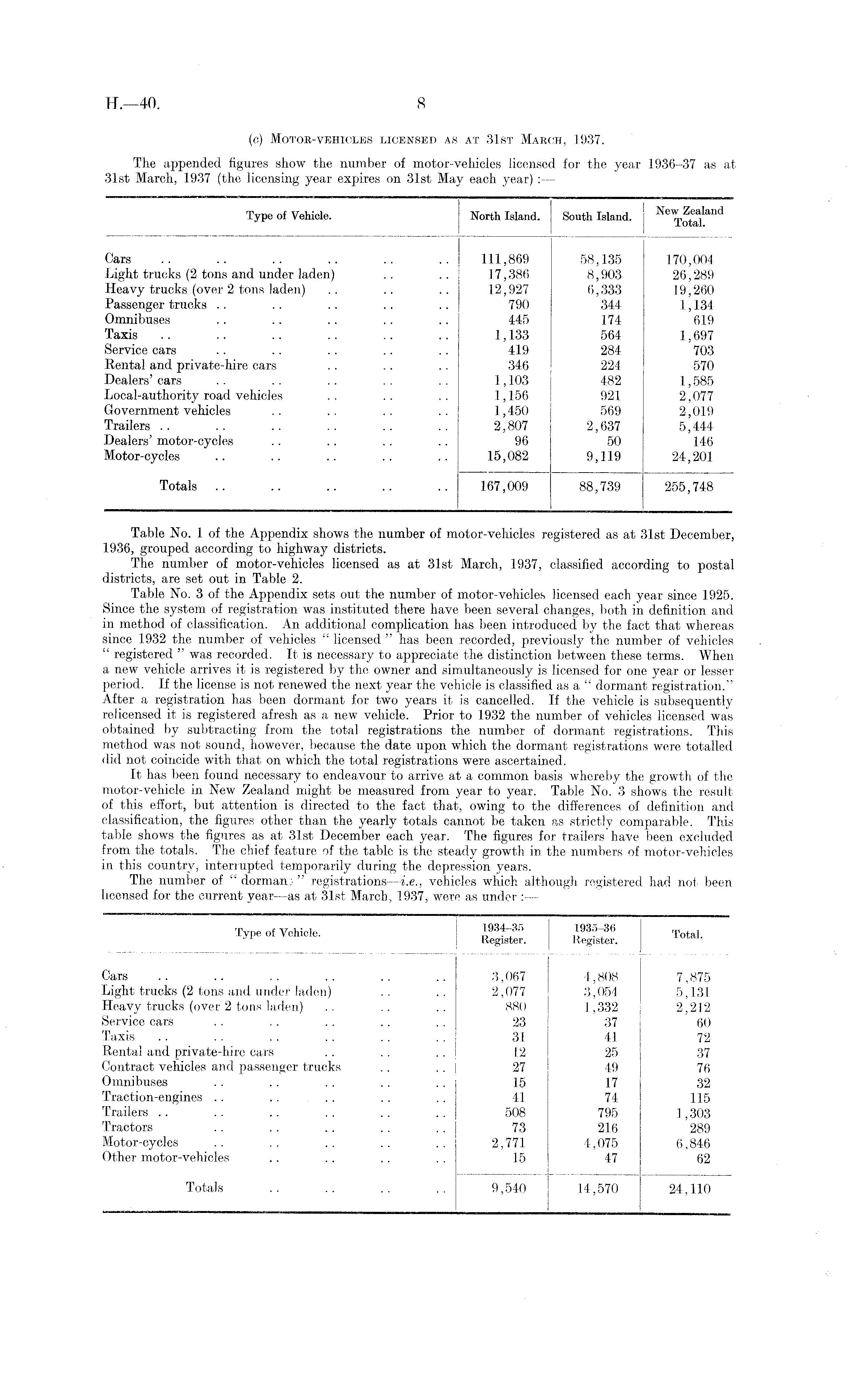 Table No. 1 of the Appendix shows the number of motor-vehicles registered as at 31st December, 1936, grouped according to highway districts. The number of motor-vehicles licensed as at 31st March, 1937, classified according to postal districts, are set out in Table 2. Table No. 3 of the Appendix sets out the number of motor-vehicles licensed each year since 1925. Since the system of registration was instituted there have been several changes, both in definition and in method of classification. An additional complication has been introduced by the fact that whereas since 1932 the number of vehicles " licensed " has been recorded, previously the number of vehicles " registered " was recorded. It is necessary to appreciate the distinction between these terms. When a new vehicle arrives it is registered by the owner and simultaneously is licensed for one year or lesser period. If the license is not renewed the next year the vehicle is classified as a " dormant registration." After a registration has been dormant for two years it is cancelled. If the vehicle is subsequently relicensed it is registered afresh as a new vehicle. Prior to 1932 the number of vehicles licensed was obtained by subtracting from the total registrations the number of dormant registrations. This method was not sound, however, because the date upon which the dormant registrations were totalled did not coincide with that on which the total registrations were ascertained. It has been found necessary to endeavour to arrive at a common basis whereby the growth of the motor-vehicle in New Zealand might be measured from year to year. Table No. 3 shows the result of this effort, but attention is directed to the fact that, owing to the differences of definition and classification, the figures other than the yearly totals cannot be taken as strictly comparable. This table shows the figures as at 31st December each year. The figures for trailers have been excluded from the totals. The chief feature of the table is the steady growth in the numbers of mot or-vehicles in this country, interrupted temporarily during the depression years. The number of " dorman; " registrations—i.e., vehicles which although registered had not been licensed for the current year—as at 31st March, 1937, were as under :—