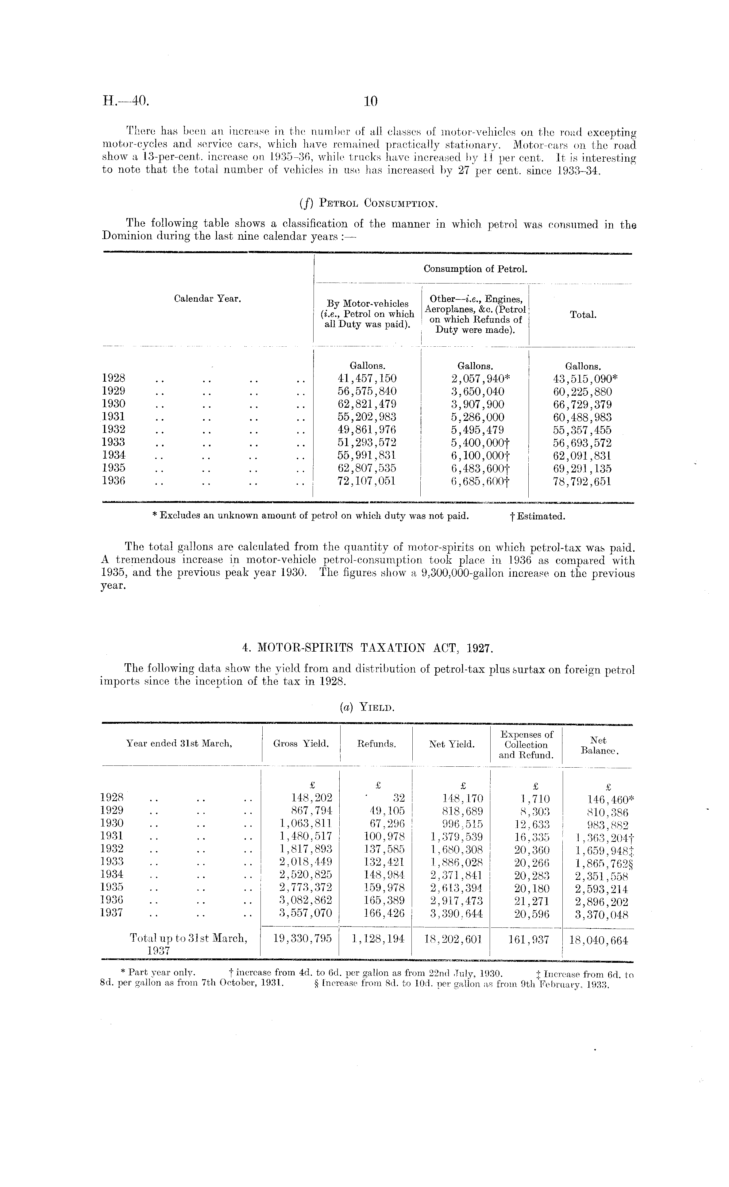 The total gallons are calculated from the quantity of motor-spirits on which petrol-tax was paid. A tremendous increase in motor-vehicle petrol-consumption took place in 1936 as compared with 1935, and the previous peak year 1930. The figures show a 9,300,000-gallon increase on the previous year. 4. MOTOR-SPIRITS TAXATION ACT, 1927. The following data show the yield from and distribution of petrol-tax plus surtax on foreign petrol imports since the inception of the tax in 1928.