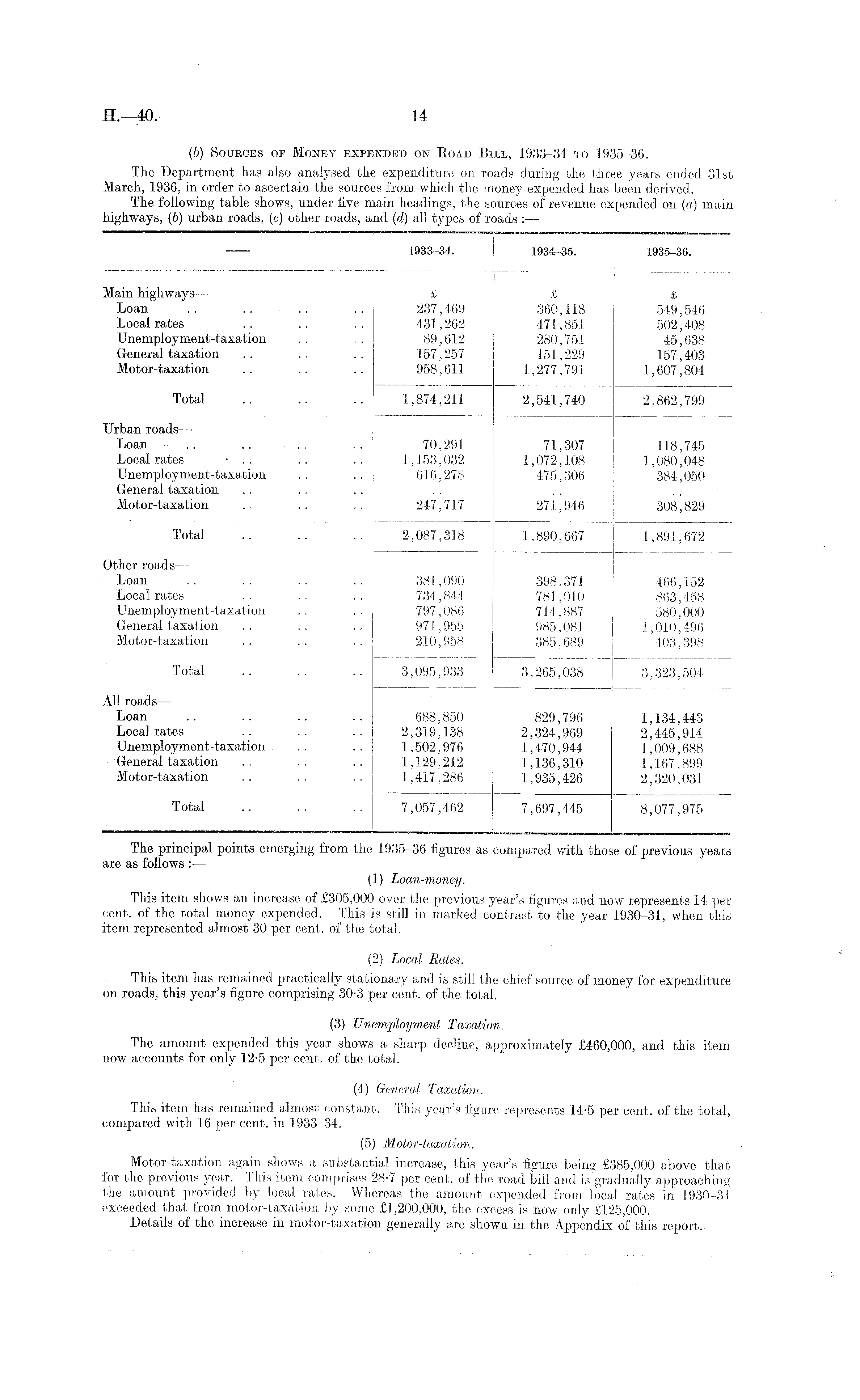 (b) Sources of Money expended on Road Bill, 1933-34 to 1935-36. The Department has also analysed the expenditure on roads during the three years ended 31st March, 1936, in order to ascertain the sources from which the money expended has been derived. The following table shows, under five main headings, the sources of revenue expended on (a) main highways, (6) urban roads, (c) other roads, and (d) all types of roads : —