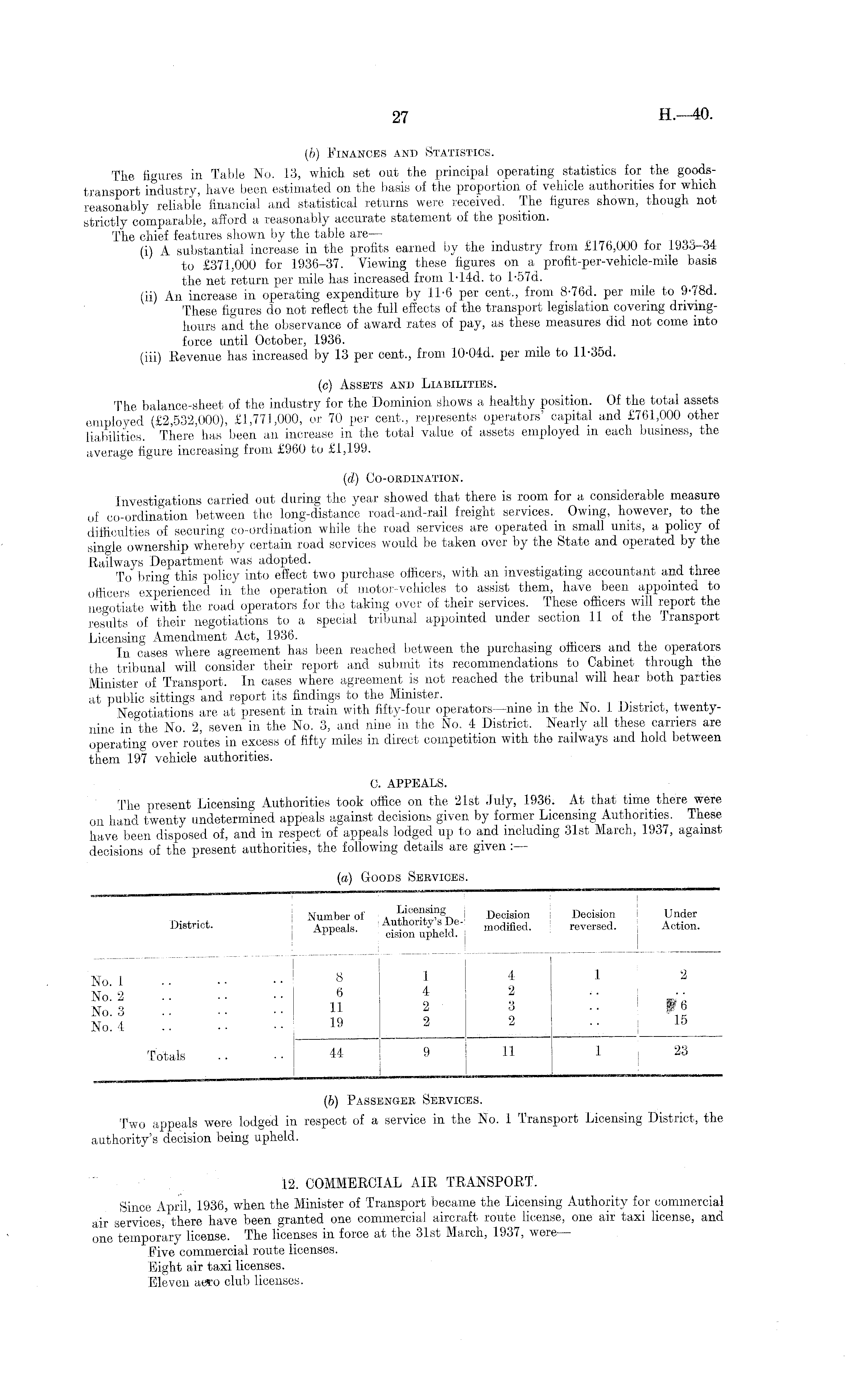 (b) Finances and Statistics. The figures in Table No. 13, which set out the principal operating statistics for the goodstransport industry, have been estimated on the basis of the proportion of vehicle authorities for which reasonably reliable financial and statistical returns were received. The figures shown, though not strictly comparable, afford a reasonably accurate statement of the position. The chief features shown by the table are — (i) A substantial increase in the profits earned by the industry from £176,000 for 1933-34 to £371,000 for 1936-37. Viewing these figures on a profit-per-vehicle-mile basis the net return per mile has increased from l-14d. to l-57d, (ii) An increase in operating expenditure by 11-6 per cent., from 8-76 d. per mile to 9-78 d. These figures do not reflect the full effects of the transport legislation covering drivinghours and the observance of award rates of pay, as these measures did not come into force until October, 1936. (iii) Revenue has increased by 13 per cent., from 10-04 d. per mile to 11-35 d. (c) Assets and Liabilities. The balance-sheet of the industry for the Dominion shows a healthy position. Of the total assets employed (£2,532,000), £1,771,000, or 70 per cent., represents operators' capital and £761,000 other liabilities. There has been an increase in the total value of assets employed m each business, the average figure increasing from £960 to £1,199. (d) Co-ordination. Investigations carried out during the year showed that there is room for a considerable measure of co-ordination between the long-distance road-and-rail freight services. Owing, however, to the difficulties of securing co-ordination while the road services are operated in small units, a policy of single ownership whereby certain road services would be taken over by the State and operated by the Railways Department was adopted. .... To bring this policy into effect two purchase officers, with an investigating accountant and three officers experienced in the operation of motor-vehicles to assist them, have been appointed to negotiate with the road operators for the taking over of their services. These officers will report the results of their negotiations to a special tribunal appointed under section 11 of the Transport Licensing Amendment Act, 1936. _ In cases where agreement has been reached between the purchasing omcers and the operators the tribunal will consider their report and submit its recommendations to Cabinet through the Minister of Transport. In cases where agreement is not reached the tribunal will hear both parties at public sittings and report its findings to the Minister. # 2 Negotiations are at present in train with fifty-four operators—nine m the No. 1 District, twentynine in the No. 2, seven in the No. 3, and nine in the No. 4 District. Nearly all these carriers are operating over routes in excess of fifty miles in direct competition with the railways and hold between them 197 vehicle authorities. C. APPEALS. The present Licensing Authorities took office on the 21st July, 1936. At that time there were on hand twenty undetermined appeals against decisions given by former Licensing Authorities. These have been disposed of, and in respect of appeals lodged up to and including 31st March, 1937, against decisions of the present authorities, the following details are given
