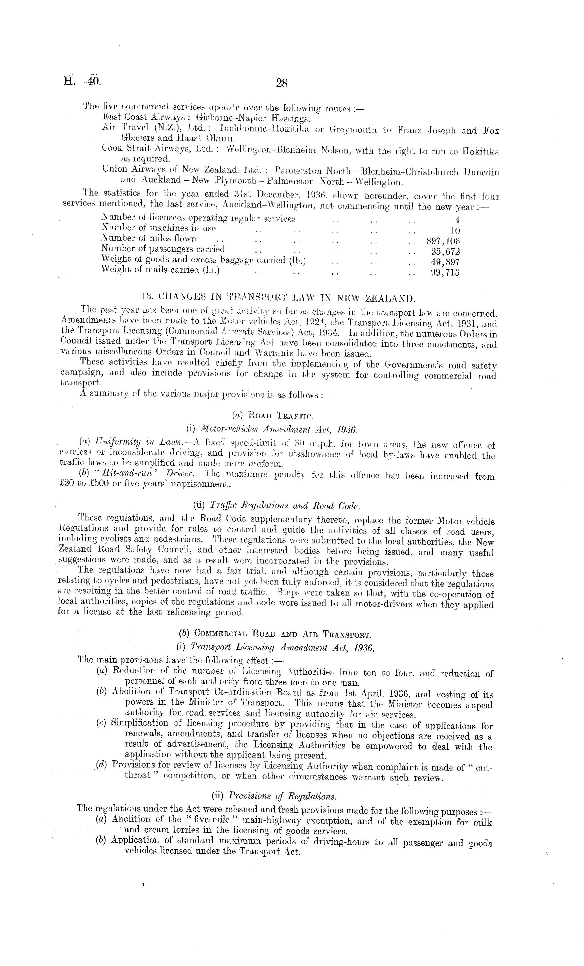 The five commercial services operate over the following routes : East Coast Airways : Gisborne-Napier-Hastings. Air Travel (N.Z.), Ltd. : Inchbonnie-Hokitika or Greymoutli to Franz Joseph and Fox Glaciers and Haast-Okuru. Look Strait Airways, Ltd. : Wellington-Blenheim-Nelson, with the right to run to Hokitika as required. Union Airways of New Zealand, Ltd. : Palmerston North - Blenheim-Christchurch-Dunedin and Auckland - New Plymouth - Palmerston North - Wellington. .(he statistics for the year ended 31st December, 1936, shown hereunder, cover the first four services mentioned, the last service, Auckland-Wellington, not commencing until the new year Number of licensees operating regular services .. .. .. 4 Number of machines in use .. . . , . ~ jq Number of miles flown .. .. .. .. ~ _ _ 897 |Qg Number of passengers carried .. .. .. ~ _, 25' 672 Weight of goods and excess baggage carried (lb.) .. .. 49|397 Weight of mails carried (lb.) .. .. .. . _ 99,'713 13. CHANGES IN TRANSPORT LAW IN NEW ZEALAND. The past year has been one of great activity so far as changes in the transport law are concerned. Amendments have been made to the Motor-vehicles Act, 1924, the Transport Licensing Act, 1931 and the Transport Licensing (Commercial Aircraft Services) Act, 1934. In addition, the numerous Orders in Council issued under the Transport Licensing Act have been consolidated into three enactments, and various miscellaneous Orders in Council and Warrants have been issued. These activities have resulted chiefly from the implementing of the Government's road safety campaign, and also include provisions for change in the system for controlling commercial road transport. A summary of the various major provisions is as follows :— (a) Road Traffic. (i) Motor-vehicles Amendment Act, 1936. (a) Uniformity in Laws. A fixed speed-limit of 30 m.p.h. for town areas, the new offence of careless or inconsiderate driving, and provision for disallowance of local by-laws have enabled the traffic laws to be simplified and made more uniform. (b) " Hit-and-run " Driver.—The maximum penalty for this offence has been increased from £20 to £500 or five years' imprisonment. (ii) Traffic Regulations and Road Code. These regulations, and the Road Code supplementary thereto, replace the former Motor-vehicle Regulations and provide for rules to control and guide the activities of all classes of road users, including cyclists and pedestrians. These regulations were submitted to the local authorities, the New Zealand Road Safety Council, and other interested bodies before being issued, and many useful suggestions were made, and as a result were incorporated in the provisions. The regulations have now had a fair trial, and although certain provisions, particularly those relating to cycles and pedestrians, have not yet been fully enforced, it is considered that the regulations are resulting in the better control of road traffic. Steps were taken so that, with the co-operation of local authorities, copies of the regulations and code were issued to all motor-drivers when they applied for a license at the last relicensing period. (b) Commercial Road and Air Transport. (i) Transport Licensing Amendment Act, 1936. The main provisions have the following effect:— (a) Reduction of the number of Licensing Authorities from ten to four, and reduction of personnel of each authority from three men to one man. (b) Abolition of Transport Co-ordination Board as from Ist April, 1936, and vesting of its powers in the Minister of Transport. This means that the Minister becomes appeal authority fox. road..services, .and licensing authority for air services. (c) Simplification of licensing procedure by providing that in the case of applications for renewals, amendments, and transfer of licenses when no objections are received as a result of advertisement, the Licensing Authorities be empowered to deal with the application without the applicant being present. (d) Provisions for review of licenses by Licensing Authority when complaint is made of " cutthroat competition, or when other circumstances warrant such review. (ii) Provisions of Regulations. The regulations under the Act were reissued and fresh provisions made for the following purposes : (a) Abolition of the " five-mile " main-highway exemption, and of the exemption for milk and cream lorries in the licensing of goods services. (b) Application of standard maximum periods of driving-hours to all passenger and goods vehicles licensed under the Transport Act. t