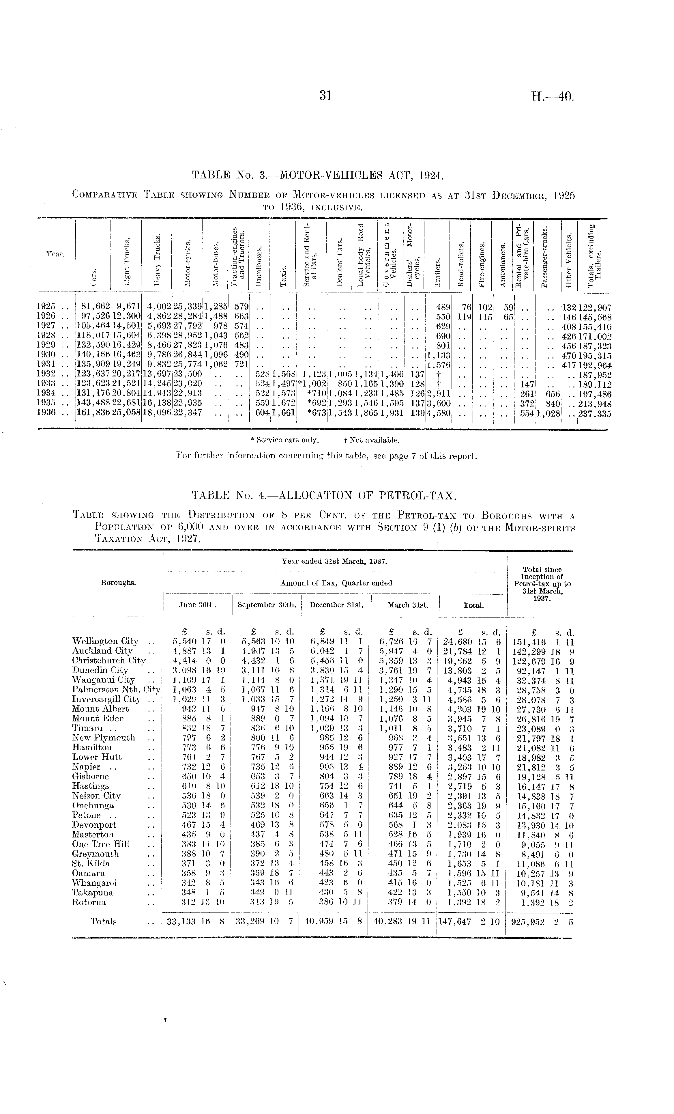 31 H.—40. TABLE No. 3.—MOTOR-VEHICLES ACT, 1924. Comparative Table showing Number op Motor-vehicles licensed as at 31st December, 1925 to 1936, inclusive. $ i 4 »• i! « e a s I ," • • :S 1 ■» * s { | I II I J ; 11 si >* i ! 1 i !i i I "J s > s a is s °° 1 •si *•§ s-3 j§ | 1 gj g s gs I | | J I gi I 3 P f §i> o> ji& | § ■ £ f g? I I |B . . . . 1925 .. 81,662 9,671 4,002 25,3391,285 579 489 76 102 59 .. .. 132122,907 1926 .. 97,52612,300 4,862 28,2841,488 663 • 550 119 115: 65 .. .. 146145,568 1927 .. 105,46414,501 5,69327,792 978 574 629 408155 410 1928 .. 118,01715,604 6,398 28,9521,043 562 690 .. 426171002 1929 .. 132,59016,429 8,466 27,8231,076 483 j 801 .. .. . 456187 323 1930 .. 140,16616,463 9,786 26,8441,096 490 I 1,133 .. .. 470195 315 1931 .. 135,90919,249 9,832 25,7741,062 721 j 1,576 417192 964 1932.. 123,637 20,21713,697 23,500 .. .. 5281,568 1,1231,005.1,1341,406 137 f 187,952 1933 .. 123,623 21,52114,245 23,020 .. .. 5241,497*1,002 850:1,1651,390 128 t 147 .. ..189,112 1934.. 131,176 20,80414,943 22,913 .. .. 5221,573 *7101,0841,2331,485 1262,911 261 656 ..197,486 1935 .. J143,48822,68116,138 22,935 .. .. 5591,672 *6921,2931,5461,595 1373,500 372 840 ..213,948 1936 .. 161,836 25,05818,096 22,347 .. .. 6041,661 *6731,5431,8651,931 1394,580 5541,028 ..237,335 * Service cars only. f Not available. For further information concerning this table, see page 7 of this report. TABLE No. 4.—ALLOCATION OF PETROL-TAX. Table showing the Distribution op 8 per Cent, op the Petrol-tax to Boroughs with a Population op 6,000 and over in accordance with Section 9 (1) (b) op the Motor-spirits Taxation Act, 1927. Year ended 31st March, 1937. Total since Inception of Boroughs. Amount of Tax, Quarter ended Petrol-tax up to | 31st March, 1937. June 30th. September 30th. December 31st. March 31st. Total. £ s. d. £ s. d. £ s. d. £ s. d. £ s. d. £ s. d. Wellington City .. 5,540 17 0 5,563 10 10 6,849 11 1 6,726 16 7 24,680 15 6 151,416 1 11 Auckland Citv .. 4,887 13 1 4,907 13 5 6,042 1 7 5,947 4 0 21,784 12 1 142,299 18 9 Christchurch Citv 4,414 0 0 4,432 1 6 5,456 11 0 5,359 13 3 19,662 5 9 122,679 16 9 DunedinCity ' .. 3,098 16 10 3,111 10 8 3,830 15 4 3,761 19 7 13,803 2 5 92,147 1 11 Wanganui City .. 1,109 17 1 1,114 8 0 1,37119 11 1,347 10 4 4,943 15 4 33,374 8 11 Palmerston Nth. Citv 1,063 4 5 J,067 11 6 1,314 6 11 1,290 15 5 4,735 18 3 28,758 3 0 Invercargill City . .* 1,029 11 3 1,033 15 7 1,272 14 9 1,250 3 11 4,588 5 6 28,078 7 3 Mount Albert .. 943 11 6 947 8 10 1,166 8 10 1,146 10 8 4,203 19 10 27,730 6 11 Mount Eden .. 885 8 1 889 0 7 1.094 10 7 1,076 8 5 3,945 7 8 26,816 19 7 Timaru .. .. . 832 18 7 836 6 10 1,029 13 3 1,011 8 5 3,710 7 1 23,089 0 3 New Plymouth .. 797 6 2 800 11 6 985 12 6 968 3 4 3,551 13 6 21,797 18 1 Hamilton .. 773 6 6 776 9 10 955 19 6 977 7 1 3,483 2 11 21,082 11 6 Lower Hutt .. 764 2 7 767 5 2 944 12 3 927 17 7 3,403 17 7 18,982 3 5 Nanier .. .. 732 12 6 735 12 6 905 13 4 889 12 6 3,263 10 10 21,812 3 5 Gisborne .. 650 10 4 653 3 7 804 3 3 789 18 4 2,897 15 6 19,128 5 11 Hastings .. 610 8 10 612 18 10 754 12 6 741 5 I 2,719 5 3 16,147 17 8 NebonCity .. 536 18 0 539 2 0 663 14 3 651 19 2 2,391 13 5 14,838 18 7 Onehunga .. 530 14 6 532 18 0 656 1 7 644 5 8 2,363 19 9 15,160 17 7 Petone .. .. 523 13 9 525 16 8 647 7 7 635 12 5 2,332 10 5 14,832 17 0 Devonport .. 467 15 4 469 13 8 578 5 0 568 I 3 2,083 15 3 13,930 14 10 Masterton .. 435 9 0 437 4 8 538 5 11 528 16 5 1,939 16 0 11,840 8 6 One Tree Hill .. 383 14 10 385 6 3 474 7 6 466 13 5 1,710 2 0 9,055 9 11 Greymouth .. 388 10 7 390 2 5 480 5 11 471 15 9 1,730 14 8 8,491 6 0 St. Kilda .. 371 3 0 372 13 4 458 16 3 450 12 6 1,653 5 1 11,086 6 11 Oamaru .. 358 9 3 359 18 7 443 2 6 435 5 7 1,596 15 11 10,257 13 9 Whangarei .. 342 8 5 343 16 6 423 6 0 415 16 0 1,525 6 11 10,181 II 3 Takapuna .. 348 1 5 349 9 11 430 5 8 422 13 3 1,550 10 3 9,541 14 8 Rotorua .. 312 13 10 313 19 5 386 10 11 379 14 0 1,392 18 2 1,392 18 2 Totals .. 33,133 16 8 33,269 10 7 40,959 15 8 40,283 19 11 147,647 2 10 925,952 2 5