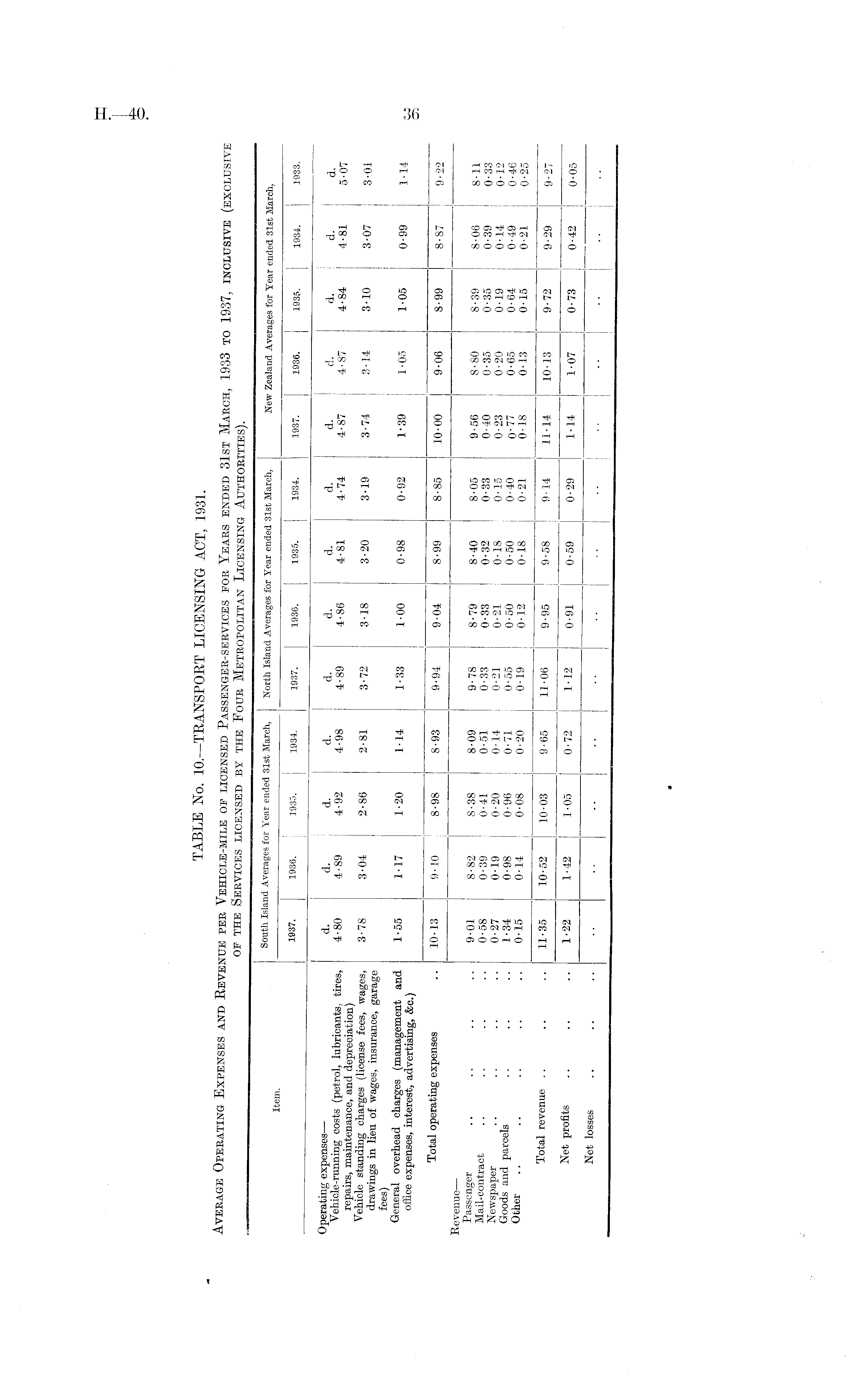 TABLE No. 10.— TRANSPORT LICENSING ACT, 1931. Average Operating Expenses and Revenue per Vehicle-mile of licensed Passenger-services for Years ended 31st March, 1933 to 1937, inclusive (exclusive of the Services licensed by the Four Metropolitan Licensing Authorities).