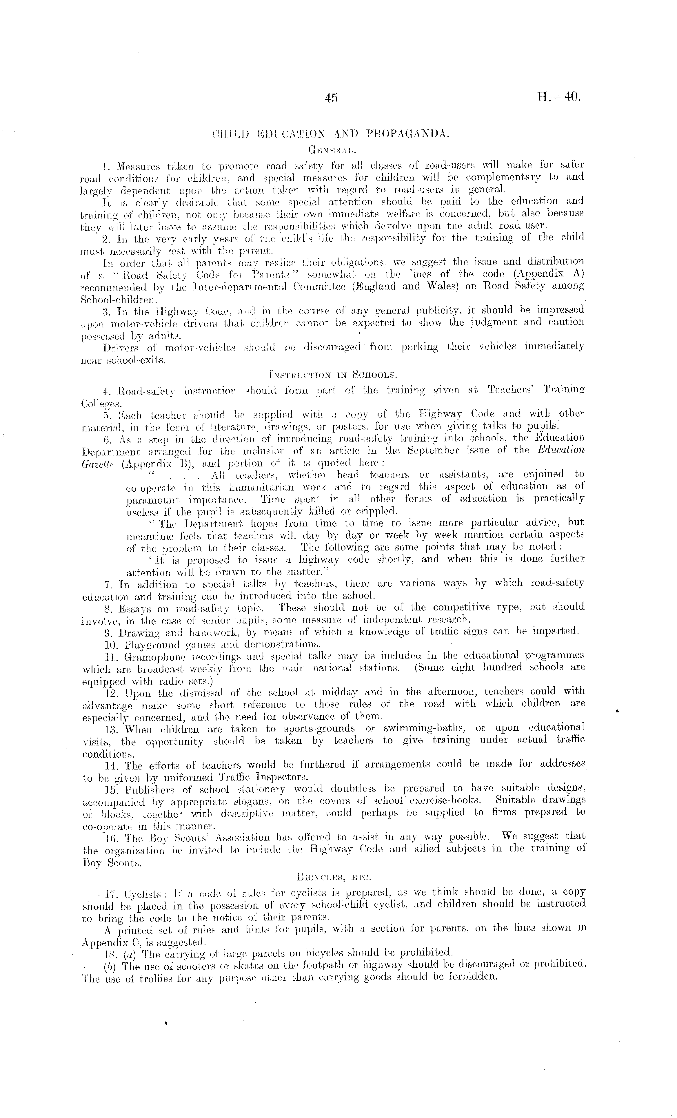 CHILD EDUCATION AND PROPAGANDA. General. 1. Measures taken to promote road safety for all classes of road-users will make for safer road conditions for children, and special measures for children will be complementary to and largely dependent upon the action taken with regard to road-users in general. It is clearly desirable that some special attention should be paid to the education and training of children, not only because their own immediate welfare is concerned, but also because they will later have to assume the responsibilities which devolve upon the adult road-user. 2. In the very early years of the child's life the responsibility for the training of the child must necessarily rest with the parent. In order that all parents may realize their obligations, we suggest the issue and distribution of a " Road Safety Code for Parents" somewhat on the lines of the code (Appendix A) recommended by the Inter-departmental Committee (England and Wales) on Road Safety among School-children. 3. In the Highway Code, and in the course of any general publicity, it should be impressed upon motor-vehicle drivers that children cannot be expected to show the judgment and caution possessed by adults. Drivers of motor-vehicles should be discouraged' from parking their vehicles immediately near school-exits. Instruction in Schools. 4. Road-safety instruction should form part of the training given at Teachers' Training Colleges. 5. Each teacher should be supplied with a copy of the Highway Code and with other material, in the form of literature, drawings, or posters, for use when giving talks to pupils. 6. As a step in the direction of introducing road-safety training into schools, the Education Department arranged for the inclusion of an article in the September issue of the Education Gazette (Appendix B), and portion of it is quoted here "... All teachers, whether head teachers or assistants, are enjoined to co-operate in this humanitarian work and to regard this aspect of education as of paramount importance. Time spent in all other forms of education is practically useless if the pupil is subsequently killed or crippled. " The Department hopes from time to time to issue more particular advice, but meantime feels that teachers will day by day or week by week mention certain aspects of the problem to their classes. The following are some points that may be noted : — 'It is proposed to issue a highway code shortly, and when this is done further attention will be drawn to the matter." 7. In addition to special talks by teachers, there are various ways by which road-safety education and training can be introduced into the school. 8. Essays on road-safety topic. These should not be of the competitive type, but should involve, in the ease of senior pupils, some measure of independent research. 9. Drawing and handwork, by means of which a knowledge of traffic signs can be imparted. 10. Playground games and demonstrations. 11. Gramophone recordings and special talks may be included in the educational programmes which are broadcast weekly from the main national stations. (Some eight hundred schools are equipped with radio sets.) 12. Upon the dismissal of the school at midday and in the afternoon, teachers could with advantage make some short reference to those rules of the road with which children are especially concerned, and the need for observance of them. 13. When children are taken to sports-grounds or swimming-baths, or upon educational visits, the opportunity should be taken by teachers to give training under actual traffic conditions. 14. The efforts of teachers would be furthered if arrangements could be made for addresses to be given by uniformed Traffic Inspectors. 15. Publishers of school stationery would doubtless be prepared to have suitable designs, accompanied by appropriate slogans, on the covers of school' exercise-books. Suitable drawings or blocks, together with descriptive matter, could perhaps be supplied to firms prepared to co-operate in this manner. 16. The Boy Scouts' Association has offered to assist in any way possible. We suggest that the organization be invited to include the Highway Code and allied subjects in the training of Boy Scouts. Bicycles, etc. • 17. Cyclists : If a code of rules for cyclists is prepared, as we think should be done, a copy should be placed in the possession of every cyclist, and children should be instructed to bring the code to the notice of their parents. A printed set of rules and hints for pupils, with a section for parents, on the lines shown in Appendix C, is suggested. 18. (a) The carrying of large parcels on bicycles should be prohibited. (b) The use of scooters or skates on the footpath or highway should be discouraged or prohibited. The use of trollies for any purpose other than carrying goods should be forbidden. t