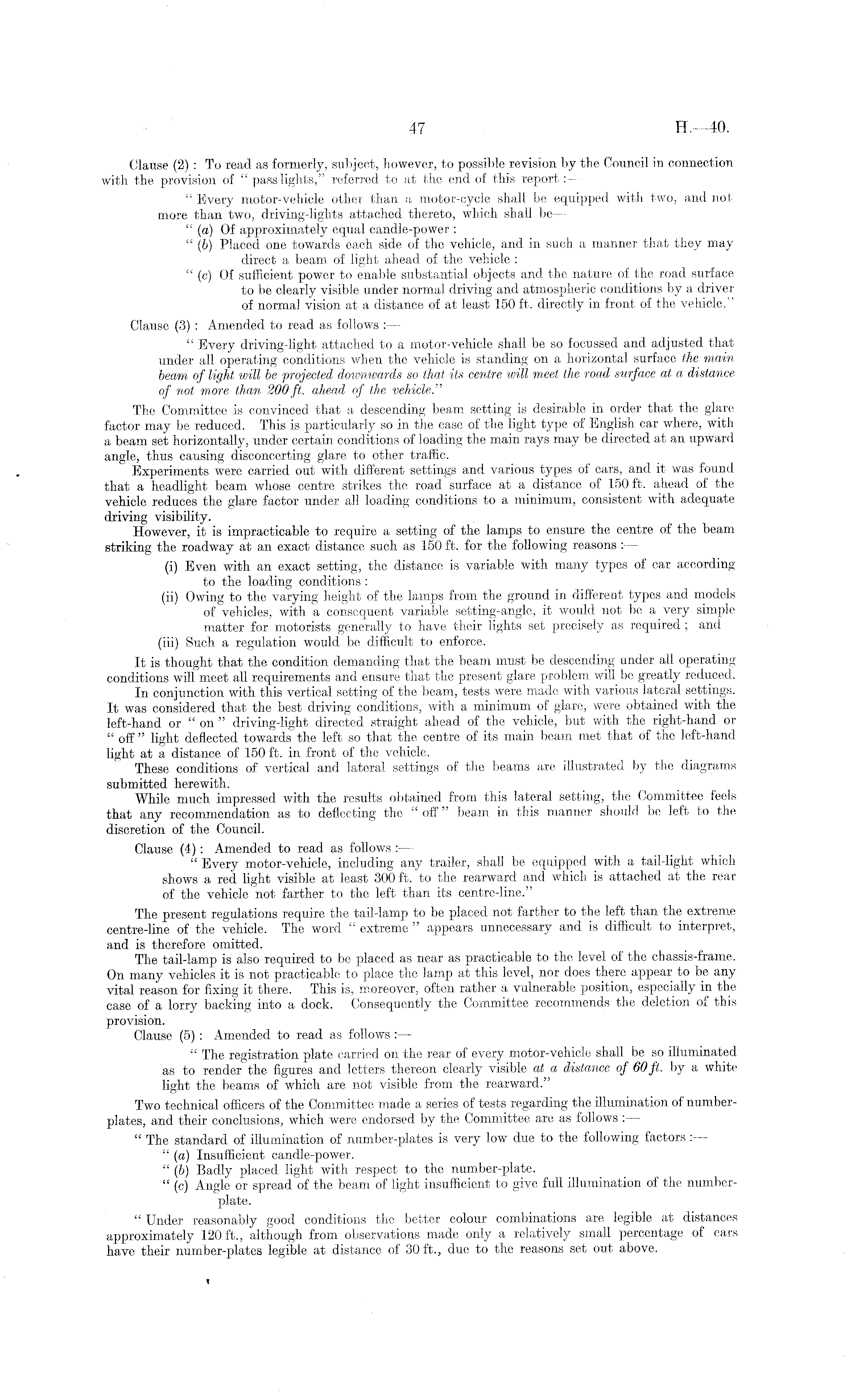Clause (2) : To read as formerly, subject, however, to possible revision by the Council in connection with the provision of " pass lights," referred to at the end of this report: — " Every motor-vehicle other than a motor-cycle shall be equipped with two, and not more than two, driving-lights attached thereto, which shall be — " (a) Of approximately equal candle-power : " (b) Placed one towards each side of the vehicle, and in such a manner that they may direct a beam of light ahead of the vehicle : " (c) Of sufficient power to enable substantial objects and the nature of the road surface to be clearly visible under normal driving and atmospheric conditions by a driver of normal vision at a distance of at least 150 ft. directly in front of the vehicle.'' Clause (3) : Amended to read as follows : — " Every driving-light attached to a motor-vehicle shall be so focussed and adjusted that under all operating conditions when the vehicle is standing on a horizontal surface the main beam of light, will be projected downwards so that its centre will meet the road surface at a distance of not more than 200 ft. qhead of the vehicle." The Committee is convinced that a descending beam setting is desirable in order that the glare factor may be reduced. This is particularly so in the case of the light type of English car where, with a beam set horizontally, under certain conditions of loading the main rays may be directed at an upward angle, thus causing disconcerting glare to other traffic. Experiments were carried out with different settings and various types of cars, and it was found that a headlight beam whose centre strikes the road surface at a distance of 150 ft. ahead of the vehicle reduces the glare factor under all loading conditions to a minimum, consistent with adequate driving visibility. However, it is impracticable to require a setting of the lamps to ensure the centre of the beam striking the roadway at an exact distance such as 150 ft. for the following reasons : — (i) Even with an exact setting, the distance is variable with many types of car according to the loading conditions : (ii) Owing to the varying height of the lamps from the ground in different types and models of vehicles, with a consequent variable setting-angle, it would not be a very simple matter for motorists generally to have their lights set precisely as required ; and (iii) Such a regulation would be difficult to enforce. It is thought that the condition demanding that the beam must be descending under all operating conditions will meet all requirements and ensure that the present glare problem will be greatly reduced. In conjunction with this vertical setting of the beam, tests were made with various lateral settings. It was considered that the best driving conditions, with a minimum of glare, were obtained with the left-hand or " on " driving-light directed straight ahead of the vehicle, but with the right-hand or " off " light deflected towards the left so that the centre of its main beam met that of the left-hand light at a distance of 150 ft. in front of the vehicle. These conditions of vertical and lateral settings of the beams are illustrated by the diagrams submitted herewith. While much impressed with the results obtained from this lateral setting, the Committee feels that any recommendation as to deflecting the " off" beam in this manner should be left to the discretion of the Council. Clause (4): Amended to read as follows : — " Every motor-vehicle, including any trailer, shall be equipped with a tail-light which shows a red light visible at least 300 ft. to the rearward and which is attached at the rear of the vehicle not farther to the left than its centre-line." The present regulations require the tail-lamp to be placed not farther to the left than the extreme centre-line of the vehicle. The word " extreme " appears unnecessary and is difficult to interpret, and is therefore omitted. The tail-lamp is also required to be placed as near as practicable to the level of the chassis-frame. On many vehicles it is not practicable to place the lamp at this level, nor does there appear to be any vital reason for fixing it there. This is, moreover, often rather a vulnerable position, especially in the case of a lorry backing into a dock. Consequently the Committee recommends the deletion of this provision. Clause (5) : Amended to read as follows : — " The registration plate carried on the rear of every motor-vehicle shall be so illuminated as to render the figures and letters thereon clearly visible at a distance of 60ft. by a white light the beams of which are not visible from the rearward." Two technical officers of the Committee made a series of tests regarding the illumination of numberplates, and their conclusions, which were endorsed by the Committee are as follows : — " The standard of illumination of number-plates is very low due to the following factors : — " (a) Insufficient candle-power. " (&) Badly placed light with respect to the number-plate. " (c) Angle or spread of the beam of light insufficient to give full illumination of the numberplate. " Under reasonably good conditions the better colour combinations are legible at distances approximately 120 ft., although from observations made only a relatively small percentage of cars have their number-plates legible at distance of 30 ft., due to the reasons set out above.
