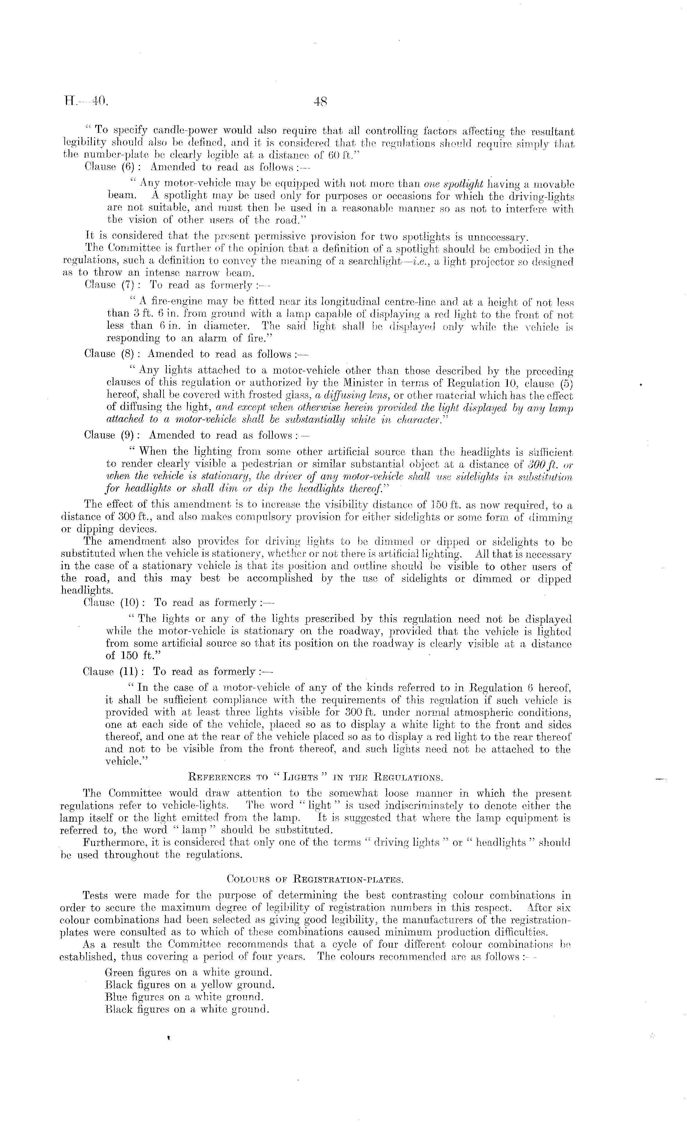 To specify candle-power would also require that all controlling factors affecting the resultant legibility should also be defined, and it is considered that the regulations should require simply that the number-plate be clearly legible at a distance of 60 ft." Clause (6): Amended to read as follows :—• " Any motor-vehicle may be equipped with not more than one spotlight having a movable beam. A spotlight may be used only for purposes or occasions for which the driving-lights are not suitable, and must then be used in a reasonable manner so as not to interfere with the vision of other users of the road." It is considered that the present permissive provision for two spotlights is unnecessary. The Committee is further of the opinion that a definition of a spotlight should be embodied in the regulations, such a definition to convey the meaning of a searchlight—i.e., a light projector so designed as to throw an intense narrow beam. Clause (7): To read as formerly :— " A fire-engine may be fitted near its longitudinal centre-line and at a height of not less than 3 ft. 6 in. from ground with a lamp capable of displaying a red light to the front of not less than 6 in. in diameter. The said light shall be displayed only while the vehicle is responding to an alarm of fire." Clause (8) : Amended to read as follows : — " Any lights attached to a motor-vehicle other than those described by the preceding clauses of this regulation or authorized by the Minister in terms of Regulation 10, clause (5) hereof, shall be covered with frosted glass, a diffusing lens, or other material which has the effect of diffusing the light, and except when otherwise herein provided the light displayed by any lamp attached to a motor-vehicle shall be substantially white in character." Clause (9): Amended to read as follows :— " When the lighting from some other artificial source than the headlights is sufficient to render clearly visible a pedestrian or similar substantial object at a distance of 300 ft. or when the vehicle is stationary, the driver of any motor-vehicle shall use sidelights in substitution for headlights or shall dim or dip the headlights thereof. The effect of this amendment is to increase the visibility distance of 150 ft. as now required, to a distance of 300 ft., and also makes compulsory provision for either sidelights or some form of dimming or dipping devices. The amendment also provides for driving lights to be dimmed or dipped or sidelights to be substituted when the vehicle is stationery, whether or not there is artificial lighting. All that is necessary in the case of a stationary vehicle is that its position and outline should be visible to other users of the road, and this may best be accomplished by the use of sidelights or dimmed or dipped headlights. Clause (10): To read as formerly : — " The lights or any of the lights prescribed by this regulation need not be displayed while the motor-vehicle is stationary on the roadway, provided that the vehicle is lighted from some artificial source so that its position on the roadway is clearly visible at a distance of 150 ft." Clause (11) : To read as formerly : — " In the case of a motor-vehicle of any of the kinds referred to in Regulation 6 hereof, it shall be sufficient compliance with the requirements of this regulation if such vehicle is provided with at least three lights visible for 300 ft. under normal atmospheric conditions, one at each side of the vehicle, placed so as to display a white light to the front and sides thereof, and one at the rear of the vehicle placed so as to display a red light to the rear thereof and not to be visible from the front thereof, and such lights need not be attached to the vehicle." References to " Lights " in the Regulations. The Committee would draw attention to the somewhat loose manner in which the present regulations refer to vehicle-lights. The word " light "is used indiscriminately to denote either the lamp itself or the light emitted from the lamp. It is suggested that where the lamp equipment is referred to, the word " lamp " should be substituted. Furthermore, it is considered that only one of the terms " driving lights " or " headlights " should be used throughout the regulations. Colours of Registration-plates. Tests were made for the purpose of determining the best contrasting colour combinations in order to secure the maximum degree of legibility of registration numbers in this respect. After six colour combinations had been selected as giving good legibility, the manufacturers of the registrationplates were consulted as to which of these combinations caused minimum production difficulties. As a result the Committee recommends that a cycle of four different colour combinations be established, thus covering a period of four years. The colours recommended are as follows : — Green figures on a white ground. Black figures on a yellow ground. Blue figures on a white ground. Black figures on a white ground. i