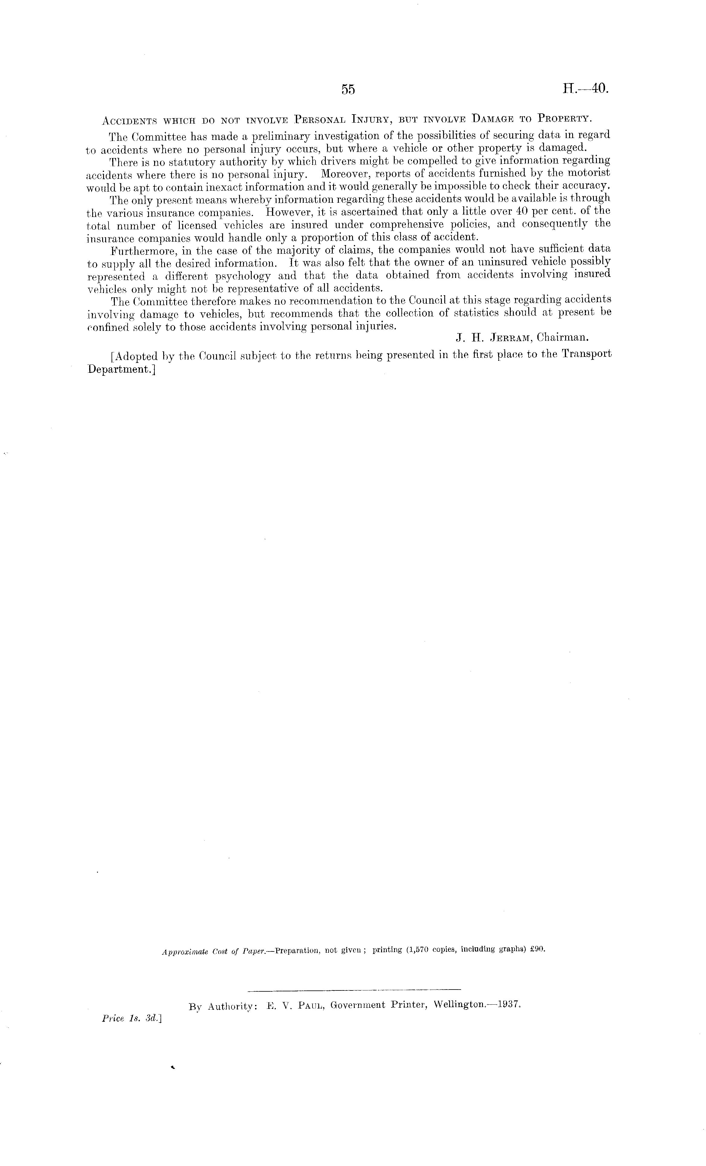 Accidents which do not involve Personal Injury, but involve Damage to Property. The Committee has made a preliminary investigation of the possibilities of securing data in regard to accidents where no personal injury occurs, but where a vehicle or other property is damaged. There is no statutory authority by which drivers might be compelled to give information regarding accidents where there is no personal injury. Moreover, reports of accidents furnished by the motorist would be apt to contain inexact information and it would generally be impossible to check their accuracy. The only present means whereby information regarding these accidents would be available is through the various insurance companies. However, it is ascertained that only a little over 40 per cent, of the total number of licensed vehicles are insured under comprehensive policies, and consequently the insurance companies would handle only a proportion of this class of accident. Furthermore, in the case of the majority of claims, the companies would not have sufficient data to supply all the desired information. It was also felt that the owner of an uninsured vehicle possibly represented a different psychology and that the data obtained from accidents involving insured vehicles only might not be representative of all accidents. The Committee therefore makes no recommendation to the Council at this stage regarding accidents involving damage to vehicles, but recommends that the collection of statistics should at present be confined solely to those accidents involving personal injuries. J. EL Jerram, Chairman. [Adopted by tbe Council subject to the returns being presented in the first place to the Transport Department.]