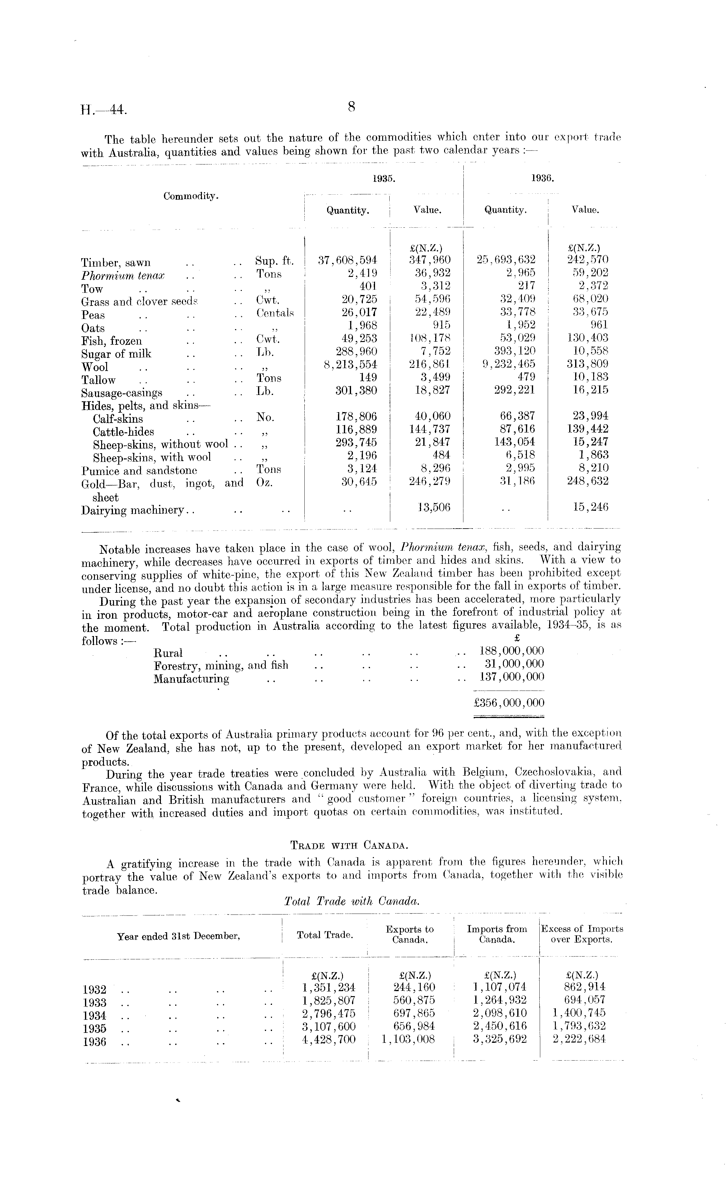 Notable increases have taken place in the case of wool, Phormium tenax, fish, seeds, and dairying machinery, while decreases have occurred in exports of timber and hides and skins. With a view to conserving supplies of white-pine, the export of this New Zealand timber has been prohibited except under license, and no doubt this action is in a large measure responsible for the fall in exports of timber. During the past year the expansion of secondary industries has been accelerated, more particularly in iron products, motor-car and aeroplane construction being in the forefront of industrial policy at the moment. Total production in Australia according to the latest figures available, 1934-35, is as follows £ Rural .. .. • • • • • • • • 188,000,000 Forestry, mining, and fish .. .. .. .. 31,000, 000 Manufacturing .. .. • ■ • ■ .. 137,000,000 £356,000,000 Of the total exports of Australia primary products account for 96 per cent., and, with the exception of New Zealand, she has not, up to the present, developed an export market for her manufactured products. During the year trade treaties were concluded by Australia with Belgium, Czechoslovakia, and France, while discussions with Canada and Germany were held. With the object of diverting trade to Australian and British manufacturers and " good customer " foreign countries, a licensing system, together with increased duties and import quotas on certain commodities, was instituted. Trade with Canada. A gratifying increase in the trade with Canada is apparent from the figures hereunder, which portray the value of New Zealand's exports to and imports from Canada, together with the visible trade balance.