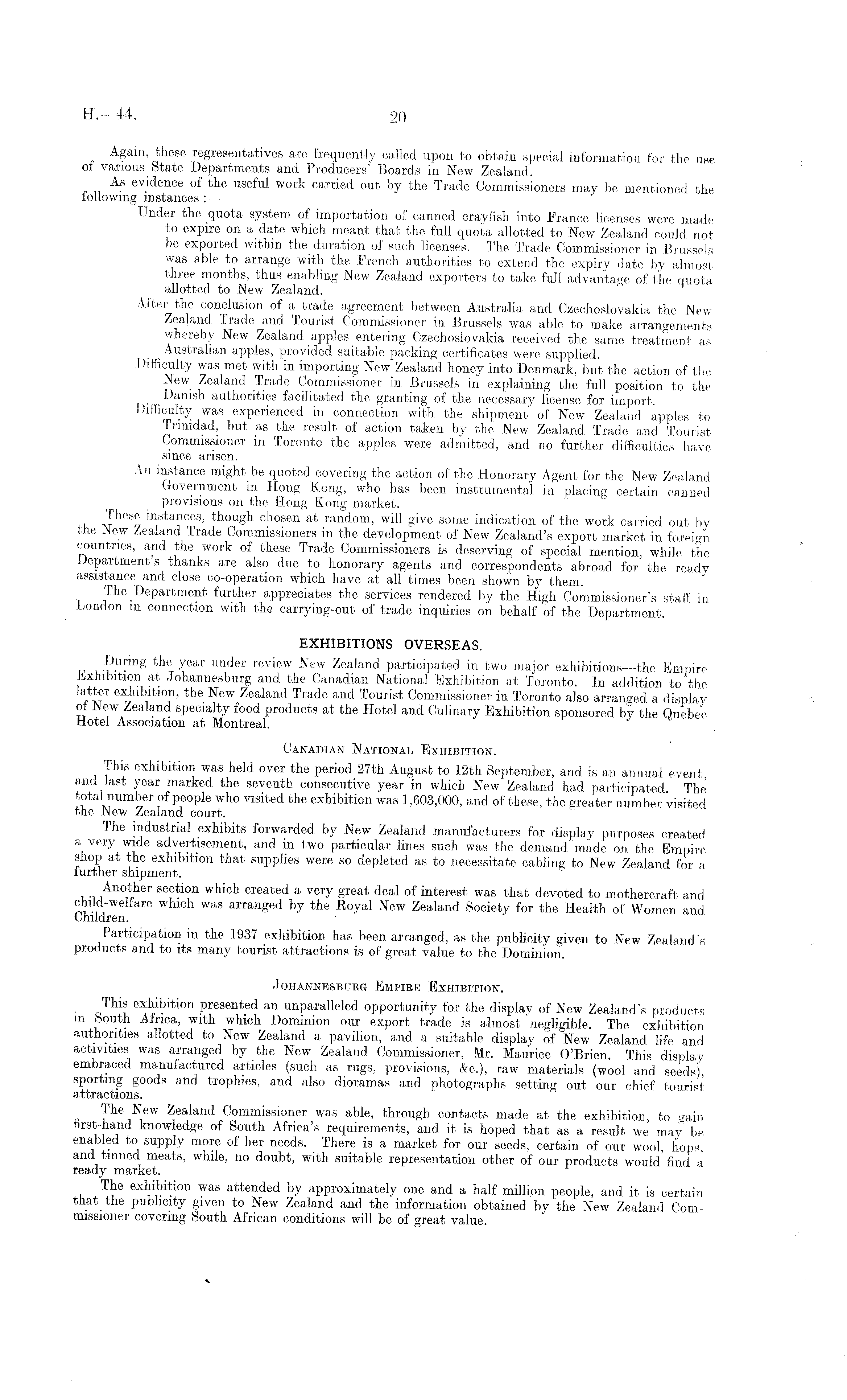 Again these representatives are frequently called upon to obtain special information for the use ot various State Departments and Producers' Boards in New Zealand. As evidence of the useful work carried out by the Trade Commissioners may be mentioned the following instances : — Under the quota system of importation of canned crayfish into France licenses were made to expire 011 a date which meant that the full quota allotted to New Zealand could not be exported within the duration of such licenses. The Trade Commissioner in Brussels was able to arrange with the French authorities to extend the expiry date by almost three months, thus enabling New Zealand exporters to take full advantage of the quota allotted to New Zealand. After the conclusion of a trade agreement between Australia and Czechoslovakia the New Zealand Trade and Tourist Commissioner in Brussels was able to make arrangements whereby New Zealand apples entering Czechoslovakia received the same treatment as Australian apples, provided suitable packing certificates were supplied. Difficulty was met with in importing New Zealand honey into Denmark, but the action of the New Zealand Trade Commissioner in Brussels in explaining the full position to the Danish authorities facilitated the granting of the necessary license for import. Difficulty was experienced in connection with the shipment of New Zealand apples to Trinidad, but as the result of action taken by the New Zealand Trade and. Tourist Commissioner in Toronto the apples were admitted, and no further difficulties have since arisen. An instance might be quoted covering the action of the Honorary Agent for the New Zealand Government in Hong Kong, who has been instrumental in placing certain canned provisions on the Hong Kong market. Jk eS ® though chosen at random, will give some indication of the work carried out by the New Zealand Trade Commissioners in the development of New Zealand's export market in foreign countries, and the work of these Trade Commissioners is deserving of special mention, while the Departments thanks are also due to honorary agents and correspondents abroad for the readv assistance and close co-operation which have at all times been shown by them. The Department further appreciates the services rendered by the High Commissioner's staff in -London m connection with the carrying-out of trade inquiries on behalf of the Department. EXHIBITIONS OVERSEAS. urm g the year under review New Zealand participated in two major exhibitions—-the Empire Exhibition at Johannesburg and the Canadian National Exhibition at Toronto. In addition to the latter exhibition, the New Zealand Trade and Tourist Commissioner in Toronto also arranged a display of New Zealand specialty food products at the Hotel and Culinary Exhibition sponsored by the Quebec Hotel Association at Montreal. Canadian National Exhibition. This exhibition was held over the period 27th August to 12th September, and. is an annual event, and last year marked the seventh consecutive year in which New Zealand had participated The total number of people who visited the exhibition was 1,603,000, and of these, the greater number visited the New Zealand court. The industrial exhibits forwarded by New Zealand manufacturers for display purposes created a very wide advertisement, and in two particular lines such was the demand made on the Empire shop at the exhibition that supplies were so depleted as to necessitate cabling to New Zealand for a turther shipment. . .. Another section which created a very great deal of interest was that devoted to mothercraft and child-welfare which was arranged by the Royal New Zealand Society for the Health of Women and Children. Participation in the 1937 exhibition has been arranged, as the publicity given to New Zealand's products and to its many tourist attractions is of great value to the Dominion. Johannesburg Empire Exhibition. • e^ lbltlon presented an unparalleled opportunity for the display of New Zealand's products m South Africa, with which Dominion our export trade is almost negligible. The exhibition authorities allotted to New Zealand a pavilion, and a suitable display of New Zealand life and activities was arranged by the New Zealand Commissioner, Mr. Maurice O'Brien. This display embraced manufactured articles (such as rugs, provisions, &c.), raw materials (wool and seeds), sporting goods and trophies, and also dioramas and photographs setting out our chief tourist attractions. The New Zealand Commissioner was able, through contacts made at the exhibition, to gain nrst-hand knowledge of South Africa's requirements, and it is hoped that as a result we may be enabled to supply more of her needs. There is a market for our seeds, certain of our wool, hops, and tinned meats, while, no doubt, with suitable representation other of our products would find a ready market. Tk e exhibition was attended by approximately one and a half million people, and it is certain that the publicity given to New Zealand and the information obtained by the New Zealand Commissioner covering South African conditions will be of great value.