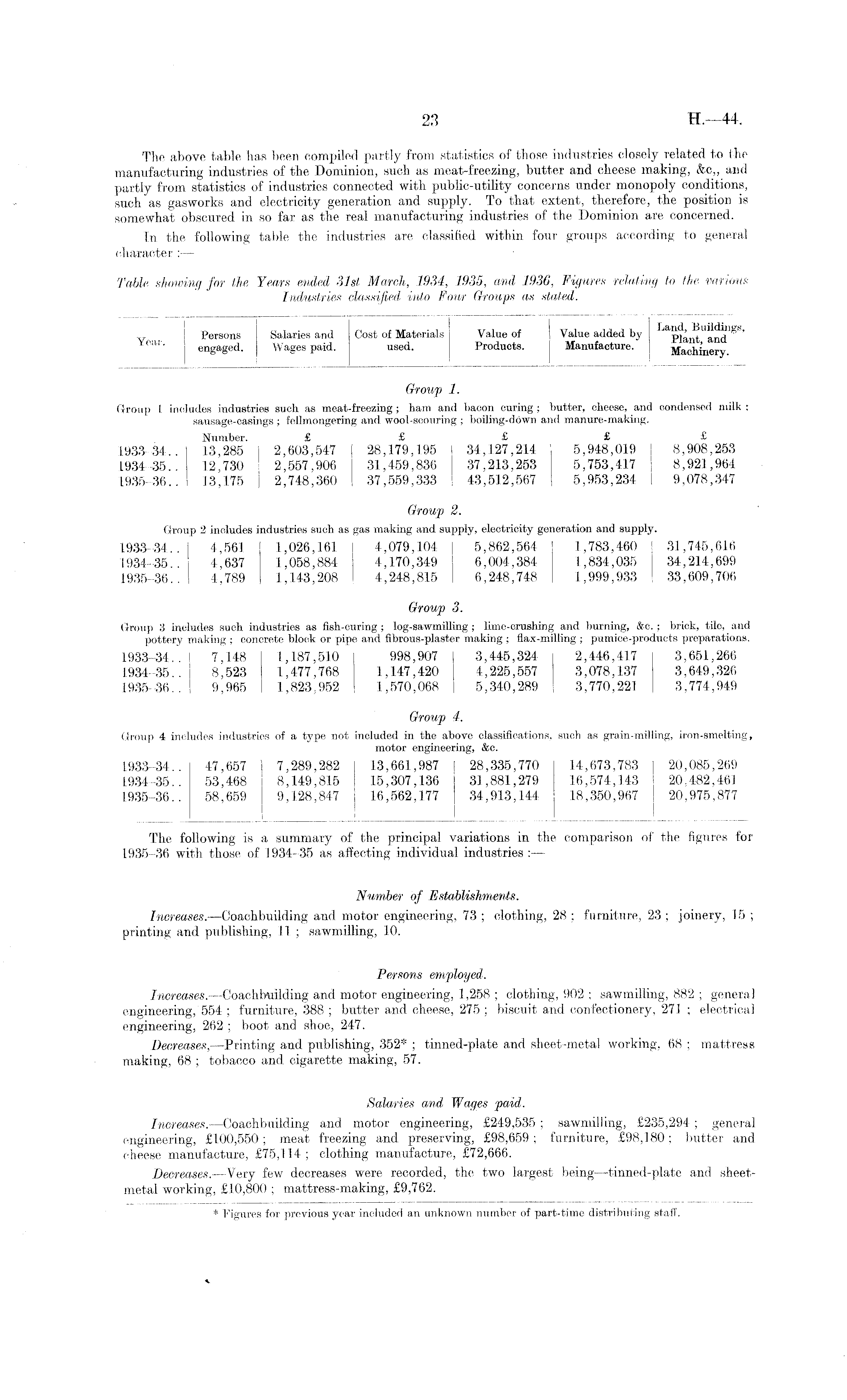 Group 1. Group I includes industries such as meat-freezing ; ham and bacon curing ; butter, cheese, and condensed milk : sausage-casings ; fellmongering and wool-scouring ; boiling-down and manure-making. Number. £ £ £ £ £ 1933-34.. 13,285 I 2,603,547 28,179,195 34,127,214 5,948,019 8,908,253 1934-35.. 12,730 ! 2,557,906 31,459,836 37,213,253 5,753,417 8,921,964 1935-36.. 13,175 | 2,748,360 37,559,333 43,512,567 5,953,234 9,078,347 Group 2. Group 2 includes industries such as gas making and supply, electricity generation and supply. 1933-34.. 4,561 1,026,161 4,079,104 5,862,564 1,783,460 31,745,616 1934-35.. 4,637 1,058,884 4,170,349 6,004,384 1,834,035 34,214,699 1935-36.. 4,789 1,143,208 4,248,815 6,248,748 1,999,933 33,609,706 Group 3. Group 3 includes such industries as fish-curing ; log-sawmilling ; lime-crushing and burning, &c. ; brick, tile, and pottery making ; concrete block or pipe and fibrous-plaster making : flax-milling ; pumice-products preparations. 1933-34.. 7,148 1,187,510 998,907 3,445,324- 2,446,417 3,651,266 1934-35.. 8,523 1,477,768 1,147,420 4,225,557 3,078,137 3,649,326 1935-36.. 9,965 1,823,952 1,570,068 5,340,289 3,770,221 3,774,949 Group 4. Group 4 includes industries of a type not included in the above classifications, such as grain-milling, iron-smelting, motor engineering, &c. 1933-34.. 47,657 7,289,282 13,661,987 28,335,770 14,673,783 20,085,269 1934-35.. 53,468 8,149,815 15,307,136 31,881,279 16,574,143 20,482,461 1935-36.. 58,659 9,128,847 16,562,177 34,913,144 18,350,967 20,975,877 The following is a summary of the principal variations in the comparison of the figures for 1935-36 with those of 1934-35 as affecting individual industries : — Number of Establishments. Increases.—Coachbuildihg and motor engineering, 73 ; clothing, 28 ; furniture, 23; joinery, 15 ; printing and publishing, 11 ; sawmilling, 10. Persons employed. Increases. —Coachbuildiilg and motor engineering, 1,258 ; clothing, 902 ; sawmilling, 882 ; general engineering, 554 ; furniture, 388 ; butter and cheese, 275 ; biscuit and confectionery, 271 ; electrical engineering, 262 ; boot and shoe, 247. Decreases, —Printing and publishing, 352* ; tinned-plate and sheet-metal working, 68 ; mattress making, 68 ; tobacco and cigarette making, 57. Salaries and Wages paid. Increases.—Coachbuilding and motor engineering, £249,535 ; sawmilling, £235,294 ; general engineering, £100,550; meat freezing and. preserving, £98,659 ; furniture, £98,180; butter and cheese manufacture, £75,114 ; clothing manufacture, £72,666. Decreases. —Very few decreases were recorded, the two largest being —tinned-plate and sheetmetal working, £10,800 ; mattress-making, £9,762.