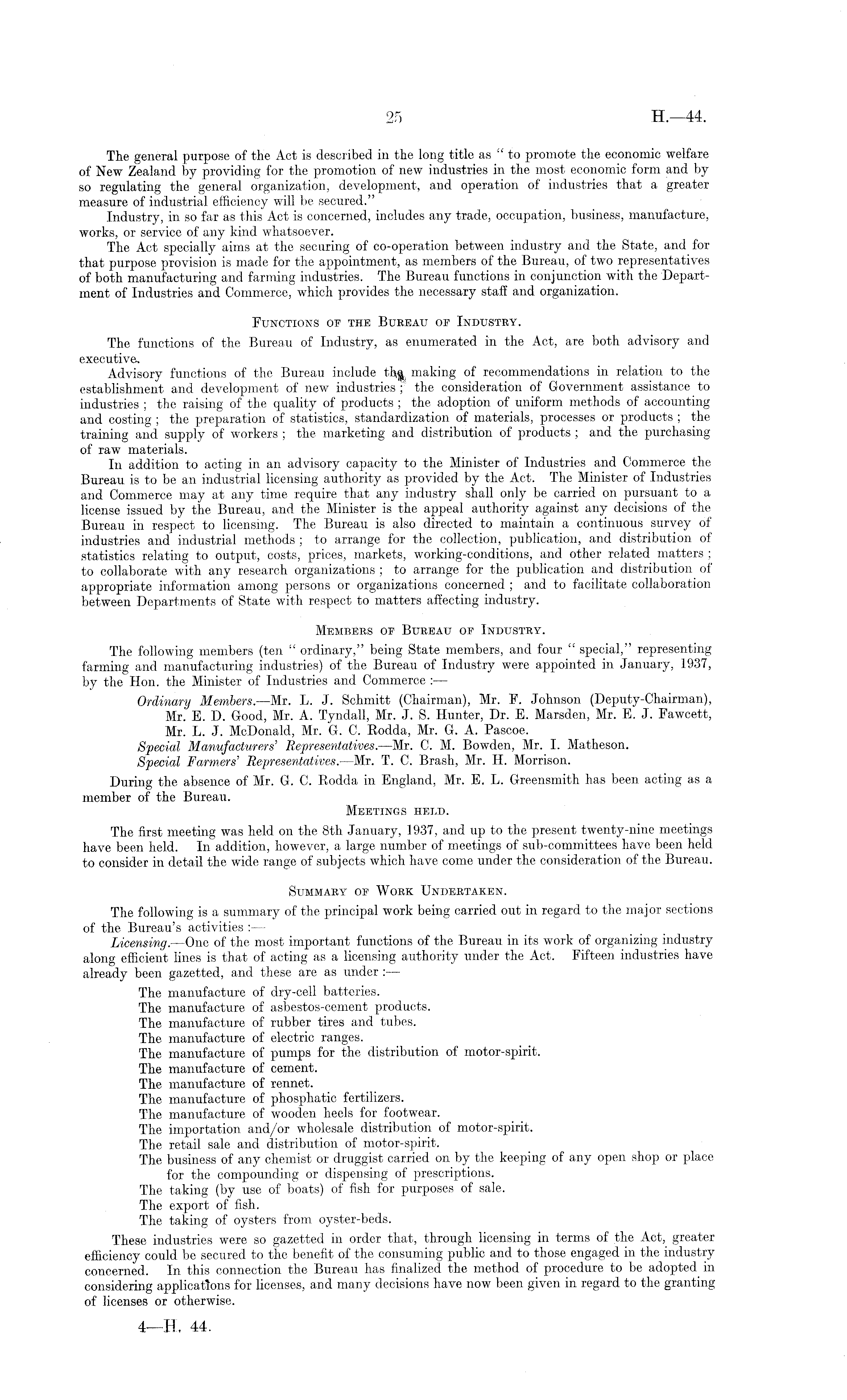 The general purpose of the Act is described in the long title as "to promote the economic welfare of New Zealand by providing for the promotion of new industries in the most economic form and by so regulating the general organization, development, and operation of industries that a greater measure of industrial efficiency will be secured." Industry, in so far as this Act is concerned, includes any trade, occupation, business, manufacture, works, or service of any kind whatsoever. The Act specially aims at the securing of co-operation between industry and the State, and for that purpose provision is made for the appointment, as members of the Bureau, of two representatives of both manufacturing and farming industries. The Bureau functions in conjunction with the Department of Industries and Commerce, which provides the necessary staff and organization. Functions of the Bureau or Industry. The functions of the Bureau of Industry, as enumerated in the Act, are both advisory and executive. Advisory functions of the Bureau include th& making of recommendations in relation to the establishment and development of new industries ; the consideration of Government assistance to industries ; the raising of the quality of products ; the adoption of uniform methods of accounting and costing ; the preparation of statistics, standardization of materials, processes or products ; the training and supply of workers ; the marketing and distribution of products ; and the purchasing of raw materials. In addition to acting in an advisory capacity to the Minister of Industries and Commerce the Bureau is to be an industrial licensing authority as provided by the Act. The Minister of Industries and Commerce may at any time require that any industry shall only be carried on pursuant to a license issued by the Bureau, and. the Minister is the appeal authority against any decisions of the Bureau in respect to licensing. The Bureau is also directed to maintain a continuous survey of industries and industrial methods ; to arrange for the collection, publication, and distribution of statistics relating to output, costs, prices, markets, working-conditions, and other related matters ; to collaborate with any research organizations ; to arrange for the publication and distribution of appropriate information among persons or organizations concerned ; and to facilitate collaboration between Departments of State with respect to matters affecting industry. Members op Bureau of Industry. The following members (ten " ordinary," being State members, and four " special," representing farming and manufacturing industries) of the Bureau of Industry were appointed in January, 1937, by the Hon. the Minister of Industries and Commerce : — Ordinary Members. —Mr. L. J. Schmitt (Chairman), Mr. F. Johnson (Deputy-Chairman), Mr. E. D. Good, Mr. A. Tyndall, Mr. J. S. Hunter, Dr. E. Marsden, Mr. E. J. Fawcett, Mr. L. J. McDonald, Mr. G. C. Rodda, Mr. G. A. Pascoe. Special Manufacturers' Representatives. —Mr. C. M. Bowden, Mr. I. Matheson. Special Farmers' Representatives. —Mr. T. C. Brash, Mr. H. Morrison. During the absence of Mr. G. C. Rodda in England, Mr. E. L. Greensmith has been acting as a member of the Bureau. Meetings held. The first meeting was held on the Bth January, 1937, and up to the present twenty-nine meetings have been held. In addition, however, a large number of meetings of sub-committees have been held to consider in detail the wide range of subjects which have come under the consideration of the Bureau. Summary op Work Undertaken. The following is a summary of the principal work being carried out in regard to the major sections of the Bureau's activities : — Licensing.—One of the most important functions of the Bureau in its work of organizing industry along efficient lines is that of acting as a licensing authority under the Act. Fifteen industries have already been gazetted, and these are as under : — The manufacture of dry-cell batteries. The manufacture of asbestos-cement products. The manufacture of rubber tires and tubes. The manufacture of electric ranges. The manufacture of pumps for the distribution of motor-spirit. The manufacture of cement. The manufacture of rennet. The manufacture of phosphatic fertilizers. The manufacture of wooden heels for footwear. The importation and/or wholesale distribution of motor-spirit. The retail sale and distribution of motor-spirit. The business of any chemist or druggist carried on by the keeping of any open shop or place for the compounding or dispensing of prescriptions. The taking (by use of boats) of fish for purposes of sale. The export of fish. The taking of oysters from oyster-beds. These industries were so gazetted in order that, through licensing in terms of the Act, greater efficiency could be secured to the benefit of the consuming public and to those engaged in the industry concerned. In this connection the Bureau has finalized the method of procedure to be adopted_ in considering applications for licenses, and many decisions have now been given in regard to the granting of licenses or otherwise.