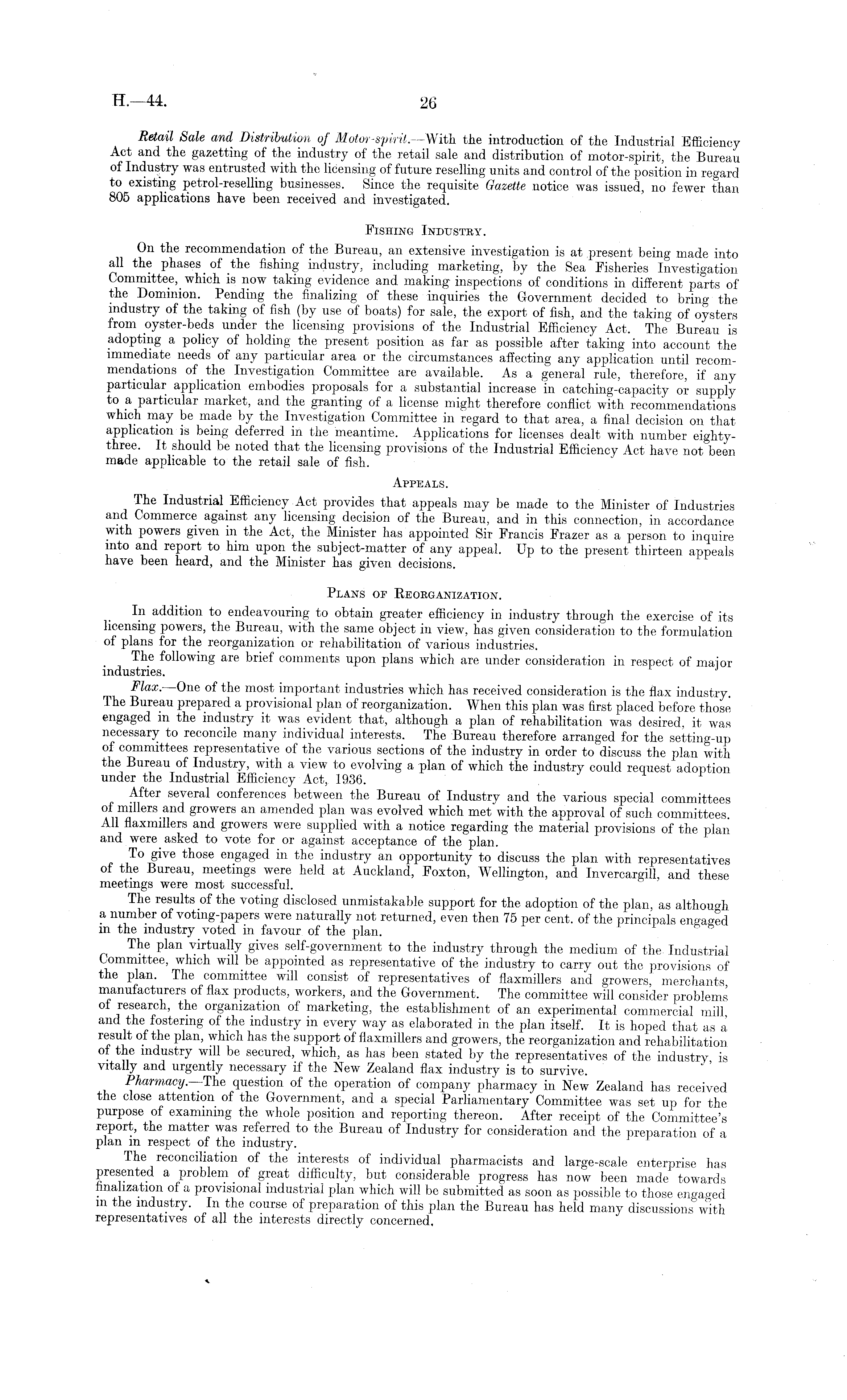 Retail Sale and Distribution of Motor-spirit— With the introduction of the Industrial Efficiency Act and the gazetting of the industry of the retail sale and distribution of motor-spirit, the Bureau of Industry was entrusted with the licensing of future reselling units and control of the position in regard to existing petrol-reselling businesses. Since the requisite Gazette notice was issued, no fewer than 805 applications have been received and investigated. Fishing Industry. On the recommendation of the Bureau, an extensive investigation is at present being made into all the phases of the fishing industry, including marketing, by the Sea Fisheries Investigation Committee, which is now taking evidence and making inspections of conditions in different parts of the Dominion. Pending the finalizing of these inquiries the Government decided to bring the industry of the taking of fish (by use of boats) for sale, the export of fish, and the taking of oysters from oyster-beds under the licensing provisions of the Industrial Efficiency Act. The Bureau is adopting a policy of the present position as far as possible after taking into account the immediate needs of any particular area or the circumstances affecting any application until recommendations of the Investigation Committee are available. As a general rule, therefore, if any particular application embodies proposals for a substantial increase in catching-capacity or supply to a particular market, and the granting of a license might therefore conflict with recommendations which may be made by the Investigation Committee in regard to that area, a final decision on that application is being deferred in the meantime. Applications for licenses dealt with number eightythree. It should be noted that the licensing provisions of the Industrial Efficiency Act have not been made applicable to the retail sale of fish. Appeals. The Industrial Efficiency Act provides that appeals may be made to the Minister of Industries and Commerce against any licensing decision of the Bureau, and in this connection, in accordance with powers given in the Act, the Minister has appointed Sir Francis Frazer as a person to inquire into and report to him upon the subject-matter of any appeal. Up to the present thirteen appeals have been heard, and the Minister has given decisions. Plans or Reorganization. In addition to endeavouring to obtain greater efficiency in industry through the exercise of its licensing powers, the Bureau, with the same object in view, has given consideration to the formulation of plans for the reorganization or rehabilitation of various industries. The following are brief comments upon plans which are under consideration in respect of maior industries. Flax. One of the most important industries which has received consideration is the flax industry. The Bureau prepared a provisional plan of reorganization. When this plan was first placed before those engaged in the industry it was evident that, although a plan of rehabilitation was desired, it was necessary to reconcile many individual interests. The Bureau therefore arranged for the setting-up of committees representative of the various sections of the industry in order to discuss the plan with the Bureau of Industry, with a view to evolving a plan of which the industry could request adoption under the Industrial Efficiency Act, 1936. After several conferences between the Bureau of Industry and the various special committees of millers and growers an amended plan was evolved which met "with the approval of such committees. All flaxmillers and growers were supplied with a notice regarding the material provisions of the plan and were asked to vote for or against acceptance of the plan. To give those engaged in the industry an opportunity to discuss the plan with representatives of the Bureau, meetings were held at Auckland, Foxton, Wellington, and Invercargill, and these meetings were most successful. The results of the voting disclosed unmistakable support for the adoption of the plan, as although a number of voting-papers were naturally not returned, even then 75 per cent, of the principals engaged in the industry voted in favour of the plan. The plan virtually gives self-government to the industry through the medium of the. Industrial Committee, which will be appointed as representative of the industry to carry out the provisions of the plan. The committee will consist of representatives of flaxmillers and growers, merchants manufacturers of flax products, workers, and the Government. The committee will consider problems of research, the organization of marketing, the establishment of an experimental commercial mill and the fostering of the industry in every way as elaborated in the plan itself. It is hoped that as a result of the plan, which has the support of flaxmillers and growers, the reorganization and rehabilitation of the industry will be secured, which, as has been stated by the representatives of the industry is vitally and urgently necessary if the New Zealand flax industry is to survive. Pharmacy.—-The question of the operation of company pharmacy in New Zealand has received the close attention of the Government, and a special Parliamentary Committee was set up for the purpose of examining the whole position and reporting thereon. After receipt of the Committee's report, the matter was referred to the Bureau of Industry for consideration and the preparation of a plan in respect of the industry. The reconciliation of the interests of individual pharmacists and large-scale enterprise has presented a problem of great difficulty, but considerable progress has now been made towards fanalization of a provisional industrial plan which will be submitted as soon as possible to those engaged m the industry. In the course of preparation of this plan the Bureau has held many discussions with representatives of all the interests directly concerned.