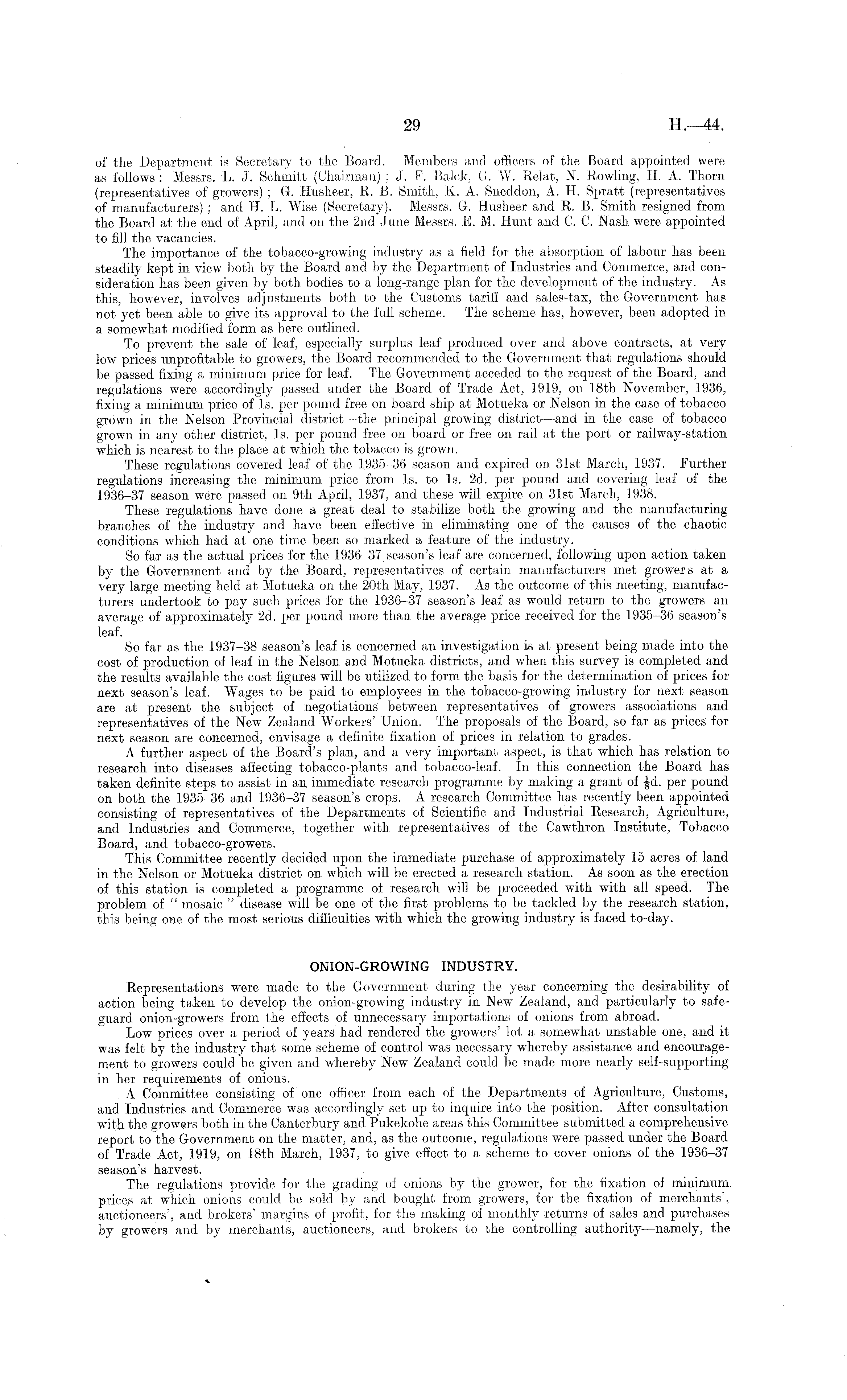 of tie Department is Secretary to the Board. Members and officers of the Board appointed were as follows : Messrs. L. J. Schmitt (Chairman) ; J. F. Balck, G. W. Relat, N. Rowling, H. A. Thorn (representatives of growers); G. Husheer, R. B. Smith, K. A. Sneddon, A. H. Spratt (representatives of manufacturers); and H. L. Wise (Secretary). Messrs. G. Husheer and R. B. Smith resigned from the Board at the end of April, and on the 2nd June Messrs. E. M. Hunt and C. C. Nash were appointed to fill the vacancies. The importance of the tobacco-growing industry as a field for the absorption of labour has been steadily kept in view both by the Board and by the Department of Industries and Commerce, and consideration has been given by both bodies to a long-range plan for the development of the industry. As this, however, involves adjustments both to the Customs tariff and sales-tax, the Government has not yet been able to give its approval to the full scheme. The scheme has, however, been adopted in a somewhat modified form as here outlined. To prevent the sale of leaf, especially surplus leaf produced over and above contracts, at very low prices unprofitable to growers, the Board recommended to the Government that regulations should be passed fixing a minimum price for leaf. The Government acceded to the request of the Board, and regulations were accordingly passed under the Board of Trade Act, 1919, on 18th. November, 1936, fixing a minimum price of Is. per pound free on board ship at Motueka or Nelson in the case of tobacco grown in the Nelson Provincial district —the principal growing district —and in the case of tobacco grown in any other district, Is. per pound free on board or free on rail at the port or railway-station which is nearest to the place at which the tobacco is grown. These regulations covered leaf of the 1935-36 season and expired on 31st March, 1937. Further regulations increasing the minimum price from Is. to Is. 2d. per pound and covering leaf of the 1936-37 season were passed on 9th April, 1937, and these will expire on 31st March, 1938. These regulations have done a great deal to stabilize both the growing and the manufacturing branches of the industry and have been effective in eliminating one of the causes of the chaotic conditions which had at one time been so marked a feature of the industry. So far as the actual prices for the 1936-37 season's leaf are concerned, following upon action taken by the Government and by the Board, representatives of certain manufacturers met growers at a very large meeting held at Motueka on the 20th May, 1937. As the outcome of this meeting, manufacturers undertook to pay such prices for the 1936-37 season's leaf as would return to the growers an average of approximately 2d. per pound more than the average price received for the 1935-36 season's leaf. So far as the 1937-38 season's leaf is concerned an investigation is at present being made into the cost of production of leaf in the Nelson and Motueka districts, and when this survey is completed and the results available the cost figures will be utilized to form the basis for the determination of prices for next season's leaf. Wages to be paid to employees in the tobacco-growing industry for next season are at present the subject of negotiations between representatives of growers associations and representatives of the New Zealand Workers' Union. The proposals of the Board, so far as prices for next season are concerned, envisage a definite fixation of prices in relation to grades. A further aspect of the Board's plan, and a very important aspect, is that which has relation to research into diseases affecting tobacco-plants and tobaeco-leaf. In this connection the Board has taken definite steps to assist in an immediate research programme by making a grant of per pound on both the 1935-36 and 1936-37 season's crops. A research Committee has recently been appointed consisting of representatives of the Departments of Scientific and Industrial Research, Agriculture, and Industries and Commerce, together with representatives of the Cawthron Institute, Tobacco Board, and tobacco-growers. This Committee recently decided upon the immediate purchase of approximately 15 acres of land in the Nelson or Motueka district on which will be erected a research station. As soon as the erection of this station is completed a programme of research will be proceeded with with all speed. The problem of " mosaic " disease will be one of the first problems to be tackled by the research station, this being one of the most serious difficulties with which the growing industry is faced to-day. ONION-GROWING INDUSTRY. Representations were made to the Government during the year concerning the desirability of action being taken to develop the onion-growing industry in New Zealand, and particularly to safeguard onion-growers from the effects of unnecessary importations of onions from abroad. Low prices over a period of years had rendered the growers' lot a somewhat unstable one, and it was felt by the industry that some scheme of control was necessary whereby assistance and encouragement to growers could be given and whereby New Zealand could be made more nearly self-supporting in her requirements of onions. A Committee consisting of one officer from each of the Departments of Agriculture, Customs, and Industries and Commerce was accordingly set up to inquire into the position. After consultation with the growers both in the Canterbury and Pukekohe areas this Committee submitted a comprehensive report to the Government on the matter, and, as the outcome, regulations were passed under the Board of Trade Act, 1919, on 18th March, 1937, to give effect to a scheme to cover onions of the 1936-37 season's harvest. The regulations provide for the grading of onions by the grower, for the fixation of minimum prices at which onions could be sold by and bought from growers, for the fixation of merchants', auctioneers', and broke