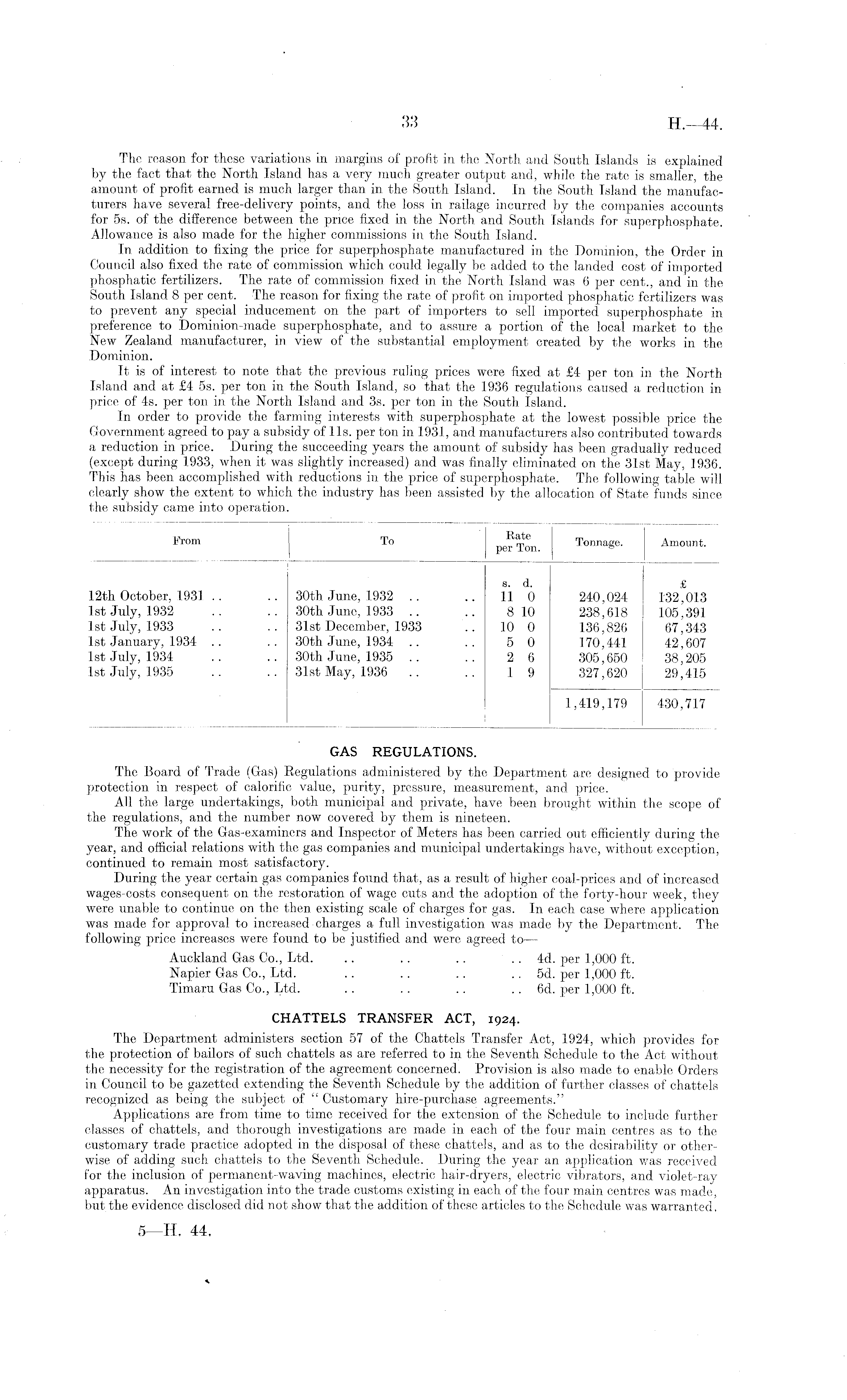 GAS REGULATIONS. The Board of Trade (Gas) Regulations administered by the Department are designed to provide protection in respect of calorific value, purity, pressure, measurement, and price. All the large undertakings, both municipal and private, have been brought within the scope of the regulations, and the number now covered by them is nineteen. The work of the Gas-examiners and Inspector of Meters has been carried out efficiently during the year, and official relations with the gas companies and municipal undertakings have, without exception, continued to remain most satisfactory. During the year certain gas companies found that, as a result of higher eoal-prices and of increased wages-costs consequent on the restoration of wage cuts and the adoption of the forty-hour week, they were unable to continue on the then existing scale of charges for gas. In each case where application was made for approval to increased charges a full investigation was made by the Department. The following price increases were found to be justified and were agreed to — Auckland Gas Co., Ltd. .. . . .. .. 4d. per 1,000 ft. Napier Gas Co., Ltd. .. . . .. .. sd. per 1,000 ft. Timaru Gas Co., Ltd. .. . . .. .. 6d. per 1,000 ft. CHATTELS TRANSFER ACT, 1924. The Department administers section 57 of the Chattels Transfer Act, 1924, which provides for the protection of bailors of such chattels as are referred to in the Seventh Schedule to the Act without the necessity for the registration of the agreement concerned. Provision is also made to enable Orders in Council to be gazetted extending the Seventh Schedule by the addition of further classes of chattels recognized as being the subject of " Customary hire-purchase agreements." Applications are from time to time received for the extension of the Schedule to include further classes of chattels, and thorough investigations are made in each of the four main centres as to the customary trade practice adopted in the disposal of these chattels, and as to the desirability or otherwise of adding such chattels to the Seventh Schedule. During the year an application was received for the inclusion of permanent-waving machines, electric hair-dryers, electric vibrators, and violet-ray apparatus. An investigation into the trade customs existing in each of the four main centres was made, but the evidence disclosed did not show that the addition of these articles to the Schedule was warranted.