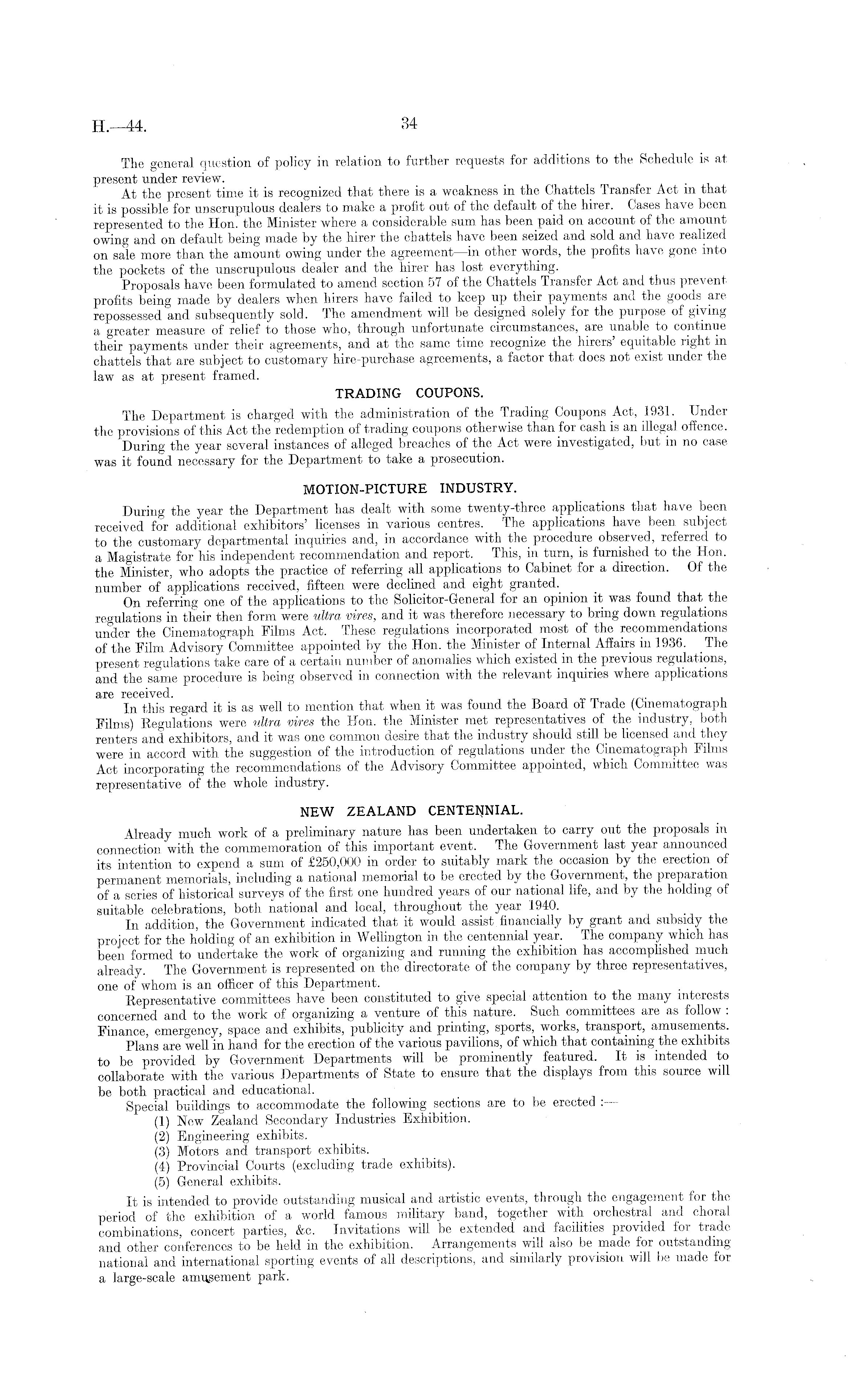 The general question of policy in relation to further requests for additions to the Schedule is at present under review. , . At the present time it is recognized that there is a weakness in the Chattels Transfer Act m that it is possible for unscrupulous dealers to make a profit out of the default of the hirer. Cases have been represented to the Hon. the Minister where a considerable sum has been paid on account of the amount owing and on default being made by the hirer the chattels have been seized and sold and have realized on sale more than the amount owing under the agreement —in other words, the profits have gone into the pockets of the unscrupulous dealer and the hirer has lost everything. Proposals have been formulated to amend section 57 of the Chattels Transfer Act and thus prevent profits being made by dealers when hirers have failed to keep up their payments and the goods are repossessed and subsequently sold. The amendment will be designed solely for the purpose of giving a greater measure of relief to those who, through unfortunate circumstances, are unable to continue their payments under their agreements, and at the same time recognize the hirers' equitable right m chattels that are subject to customary hire-purchase agreements, a factor that does not exist under the law as at present framed. TRADING COUPONS. The Department is charged with the administration of the Trading Coupons Act, 1931. Under the provisions of this Act the redemption of trading coupons otherwise than for cash is an illegal offence. During the year several instances of alleged breaches of the Act were investigated, but in no case was it found necessary for the Department to take a prosecution. MOTION-PICTURE INDUSTRY. During the year the Department has dealt with some twenty-three applications that have been received for additional exhibitors' licenses in various centres. The applications have been subject to the customary departmental inquiries and, in accordance with the procedure observed, referred to a Magistrate for his independent recommendation and report. This, in turn, is furnished to the Hon. the Minister, who adopts the practice of referring all applications to Cabinet for a direction. Of the number of applications received, fifteen were declined and eight granted^ On referring one of the applications to the Solicitor-General for an opinion it was found that the regulations in their then form were ultra vires, and it was therefore necessary to bring down regulations under the Cinematograph Films Act. These regulations incorporated most of the recommendations of the Film Advisory Committee appointed by the Hon. the Minister of Internal Affairs in 1936. The present regulations take care of a certain number of anomalies which existed in the previous regulations, and the same procedure is being observed in connection with the relevant inquiries where applications are received. In this regard it is as well to mention that when it was found the Board of Trade (Cinematograph Films) Regulations were ultra vires the Hon. the Minister met representatives of the industry, both renters and exhibitors, and it was one common desire that the industry should still be licensed and they were in accord with the suggestion of the introduction of regulations under the Cinematograph Films Act incorporating the recommendations of the Advisory Committee appointed, which Committee was representative of the whole industry. NEW ZEALAND CENTENNIAL. 4iready much work of a preliminary nature has been undertaken to carry out the proposals in connection with the commemoration of this important event. The Government last year announced its intention to expend a sum of £250,000 in order to suitably mark the occasion by the erection of permanent memorials, including a national memorial to be erected by the Government, the preparation of a series of historical surveys of the first one hundred years of our national life, and by the holding of suitable celebrations, both national and local, throughout the year 1940. In addition, the Government indicated that it would assist financially by grant and subsidy the project for the holding of an exhibition in Wellington in the centennial year. The company which has been formed to undertake the work of organizing and running the exhibition has accomplished much already. The Government is represented on the directorate of the company by three representatives, one of whom is an officer of this Department. Representative committees have been constituted to give special attention to the many interests concerned and to the work of organizing a venture of this nature. Such committees are as follow : Finance, emergency, space and exhibits, publicity and printing, sports, works, transport, amusements. Plans are well in hand for the erection of the various pavilions, of which that containing the exhibits to be provided by Government Departments will be prominently featured. It is intended to collaborate with the various Departments of State to ensure that the displays from this source will be both practical and educational. Special buildings to accommodate the following sections are to be erected : — (1) New Zealand Secondary Industries Exhibition. (2) Engineering exhibits. (3) Motors and transport exhibits. (4) Provincial Courts (excluding trade exhibits). (5) General exhibits. It is intended to provide outstanding musical and artistic events, through the engagement for the period of the exhibition of a world famous military band, together with orchestral and choral combinations, concert parties, &c. Invitations will be extended and facilities provided for trade and other conferences to be held in the exhibition. Arrangements will also be made for outstanding national and international sporting events of all descriptions, and similarly provision will be made for a large-scale amusement park.