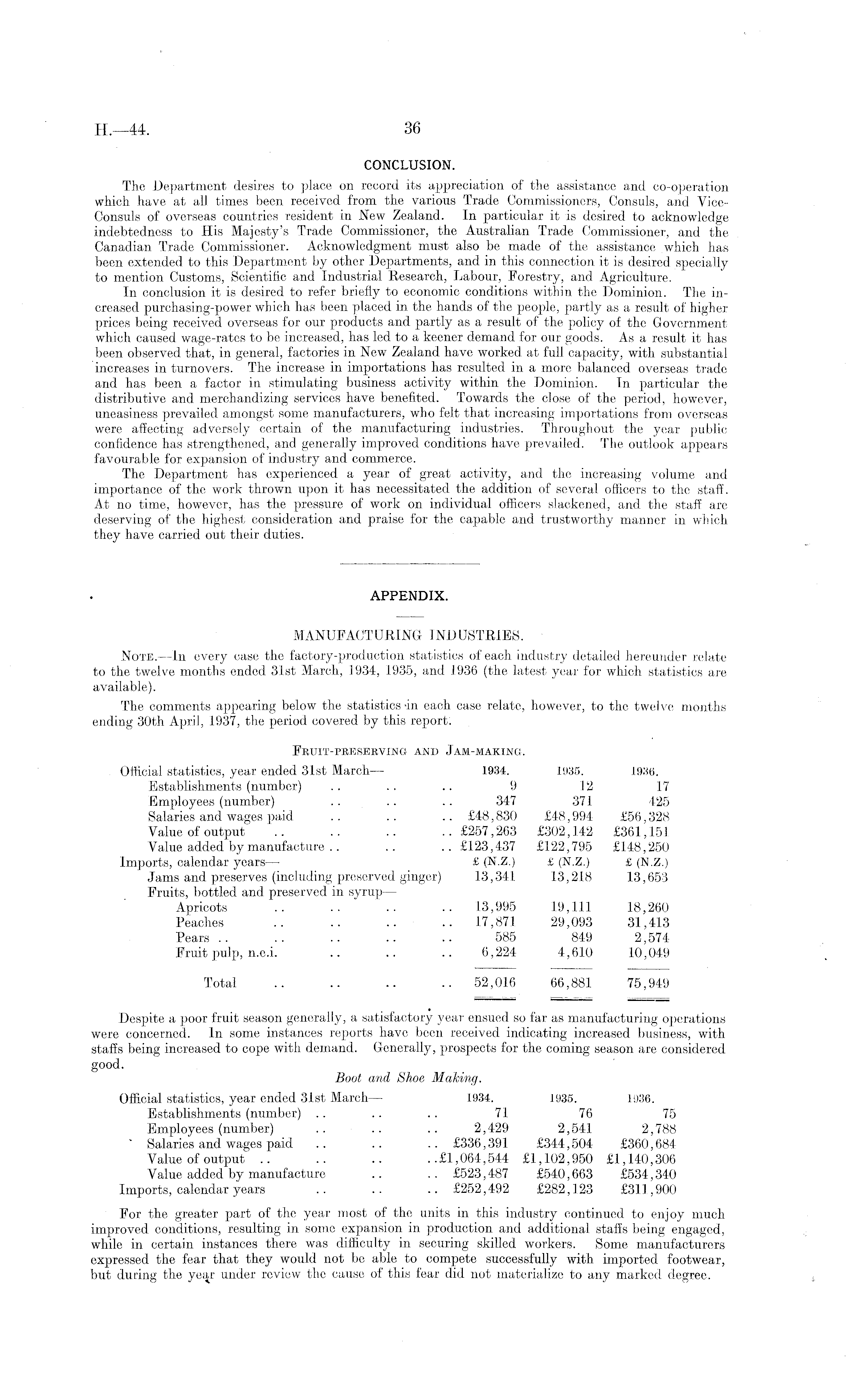 APPENDIX. MANUFACTURING INDUSTRIES. Note. —In every case the factory-production statistics of eaclx industry detailed hereunder relate to the twelve months ended 31st March, 1934, 1935, and 1936 (the latest year for which statistics are available). The comments appearing below the statistics -in each case relate, however, to the twelve months ending 30th April, 1937, the period covered by this report. Fbuit-preserving and Jam-making. Official statistics, year ended 31st March — 1934. 1935. 1936. Establishments (number) .. .. .. 9 12 17 Employees (number) . . .. .. 347 371 425 Salaries and wages paid .. .. .. £48,830 £48,994 £56,328 Value of output .. .. .. .. £257,263 £302,142 £361,151 Value added by manufacture .. .. .. £123,437 £122,795 £148,250 Imports, calendar years — £ (N.Z.) £ (N.Z.) £ (N.Z.) Jams and preserves (including preserved ginger) 13,341 13,218 13,653 Fruits, bottled and preserved in syrup — Apricots .. .. .. .. 13,995 19,111 18,260 Peaches .. .. .. .. 17,871 29,093 31,413 Pears .. .. .. .. .. 585 849 2,574 Fruit pulp, n.e.i. .. .. .. 6,224 4,610 10,049 Total .. .. .. .. 52,016 66,881 75,949 Despite a poor fruit season generally, a satisfactory year ensued so far as manufacturing operations were concerned. In some instances reports have been received indicating increased business, with staffs being increased to cope with demand. Generally, prospects for the coming season are considered good. Boot and Shoe Making. Official statistics, year ended 31st March — 1934. 1935. 1936. Establishments (number) .. .. .. 71 76 75 Employees (number) .. .. .. 2,429 2,541 2,788 Salaries and wages paid .. .. .. £336,391 £344,504 £360,684 Value of output .. .. .. ..£1,064,544 £1,102,950 £1,140,306 Value added by manufacture .. .. £523,487 £540,663 £534,340 Imports, calendar years .. .. .. £252,492 £282,123 £311,900 For the greater part of the year most of the units in this industry continued to enjoy much improved conditions, resulting in some expansion in production and additional staffs being engaged, while in certain instances there was difficulty in securing skilled workers. Some manufacturers expressed the fear that they would not be able to compete successfully with imported footwear, but during the year under review the cause of this fear did not materialize to any marked degree.