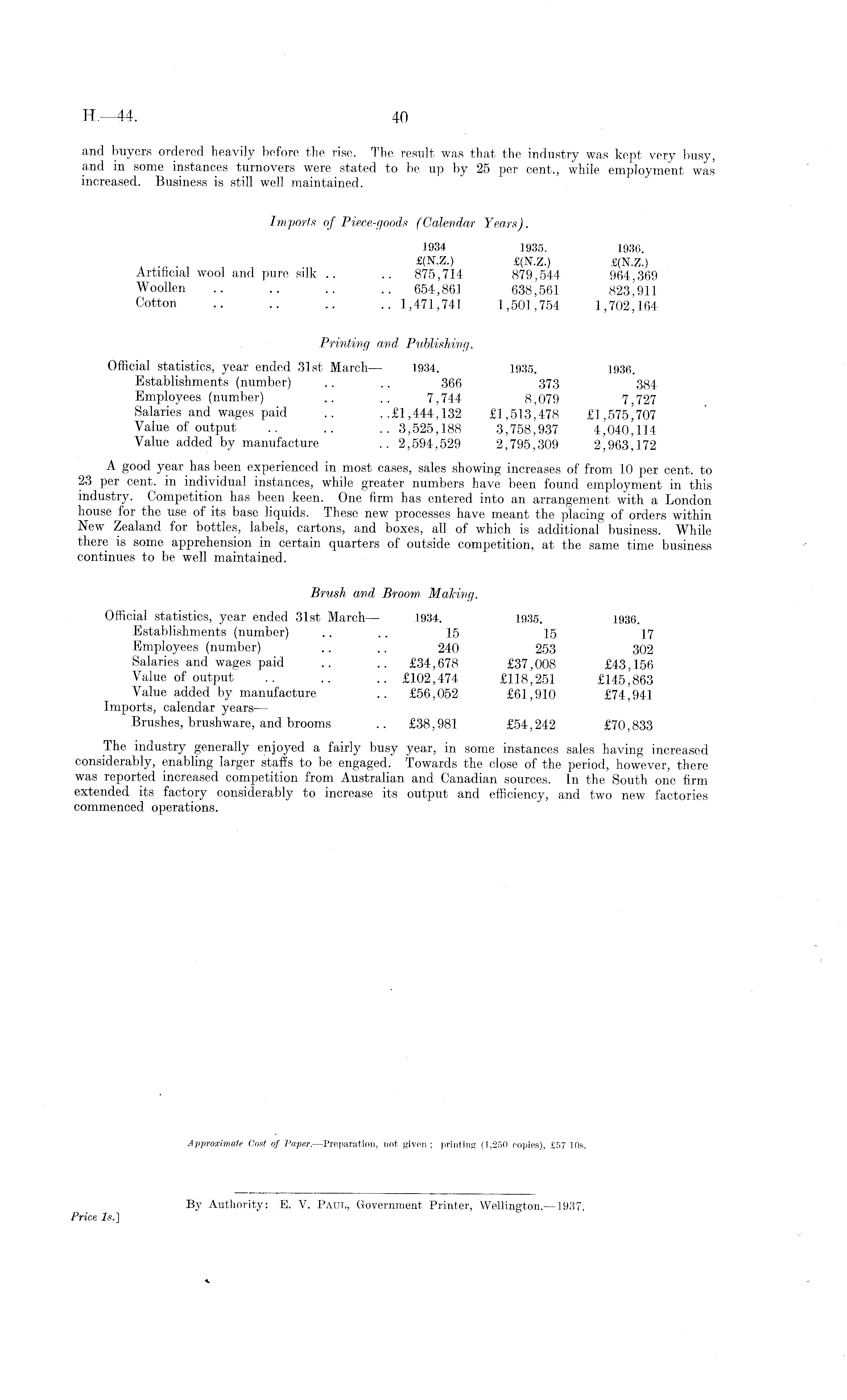 and buyers ordered heavily before the rise. The result was that the industry was kept very busy, and in some instances turnovers were stated to be up by 25 per cent., while employment was increased. Business is still well maintained. Imports of Piece-goods (Calendar Years). 1934 1935. 1936. £(N.Z.) £(N.Z.) £(N.Z.) Artificial wool and pure silk .. .. 875,714 879,544 964,369 Woollen .. .. .. .. 654,861 638,561 823,911 Cotton .. .. .. .. 1,471,741 1,501,754 1,702,164 Printing and Publishing. Official statistics, year ended 31st March — 1934. 1935. 1936. Establishments (number) .. .. 366 373 384 Employees (number) .. .. 7,744 8,079 7,727 Salaries and wages paid .. ..£1,444,132 £1,513,'478 £1,575^707 Value of output .. .. .. 3,525,188 3,758,937 4,040,114 Value added by manufacture .. 2,594,529 2,795,309 2,963,172. A good year has been experienced in most cases, sales showing increases of from 10 per cent, to 23 per cent, in individual instances, while greater numbers have been found employment in this industry. Competition has been keen. One firm has entered into an arrangement with a London house for the use of its base liquids. These new processes have meant the placing of orders within New Zealand for bottles, labels, cartons, and boxes, all of which is additional business. While there is some apprehension in certain quarters of outside competition, at the same time business continues to be well maintained. Brush and Broom Making. Official statistics, year ended 31st March — 1934. 1935. 1936. Establishments (number) .... 15 15 17 Employees (number) .. .. 240 253 302 Salaries and wages paid .. .. £34,678 £37,008 £43,156 Value of output .. .. .. £102,474 £118,251 £145,863 Value added by manufacture .. £56,052 £61,910 £74,941 Imports, calendar years — Brushes, brushware, and brooms .. £38,981 £54,242 £70,833 The industry generally enjoyed a fairly busy year, in some instances sales having increased considerably, enabling larger staffs to be engaged. Towards the close of the period, however, there was reported increased competition from Australian and Canadian sources. In the South one firm extended its factory considerably to increase its output and efficiency, and two new factories commenced operations.
