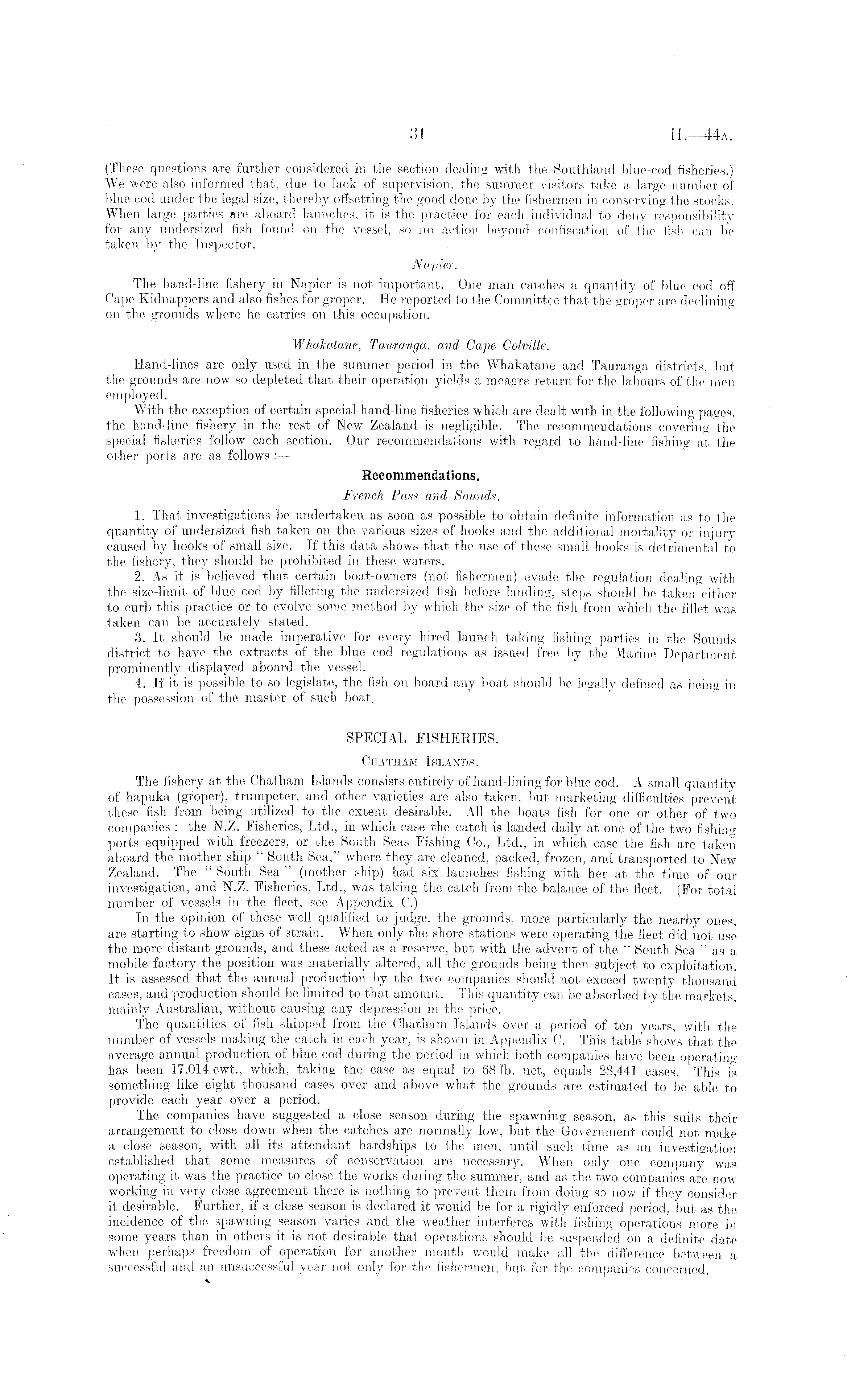 (These questions are further considered in the section dealing with the Southland blue-cod fisheries.) We were also informed that, due to lack of supervision, the summer visitors take a. large number of blue cod under the legal size, thereby offsetting the good done by the fishermen in conserving the stocks. When large parties are aboard launches, it is the practice for each individual to deny responsibility for any undersized fish found on the vessel, so no action beyond confiscation of the fish can be taken by the Inspector. Napier. The hand-line fishery in Napier is not important. One man catches a quantity of blue cod off Cape Kidnappers and also fishes for groper. He reported to the Committee that the groper are declining on the grounds where he carries on this occupation. Whakatane, Tauranga, and Cape Golville. Hand-lines are only used in the summer period in the Whakatane and Tauranga districts, but the grounds are now so depleted that their operation yields a meagre return for the labours of the men employed. With the exception of certain special hand-line fisheries which are dealt with in the following pages, the hand-line fishery in the rest of New Zealand is negligible. The recommendations covering the special fisheries follow each section. Our recommendations with regard to hand-line fishing at the other ports are as follows Recommendations. French Pass and Sounds. 1. That investigations be undertaken as soon as possible to obtain definite information as to the quantity of undersized fish taken on the various sizes of hooks and the additional mortality or injury caused by hooks of small size. If this data shows that the use of these small hooks is detrimental to the fishery, they should be prohibited in these waters. 2. As it is believed that certain boat-owners (not fishermen) evade the regulation dealing with the size-limit of blue cod by filleting the undersized fish before landing, steps should be taken either to curb this practice or to evolve some method by which the size of the fish from which the fillet was taken can be accurately stated. 3. It should be made imperative for every hired launch taking fishing parties in the Sounds district to have the extracts of the blue cod regulations as issued free by the Marine Department prominently displayed aboard the vessel. 4. If it is possible to so legislate, the fish on board any boat should be legally defined as being in the possession of the master of such boat, SPECIAL FISHERIES. Chatham Islands. The fishery at the Chatham Islands consists entirely of hand-lining for blue cod. A small quantity of hapuka (groper), trumpeter, and other varieties are also taken, but marketing difficulties prevent these fish from being utilized to the extent desirable. All the boats fish for one or other of two companies : the N.Z. Fisheries, Ltd., in which case the catch is landed daily at one of the two fishing ports equipped with freezers, or the South Seas Fishing Co., Ltd., in which case the fish are taken aboard the mother ship " South Sea," where they are cleaned, packed, frozen, and transported to. New Zealand. The " South Sea " (mother ship) had six launches fishing with her at the time of our investigation, and N.Z. Fisheries, Ltd., was taking the catch from the balance of the fleet. (For total number of vessels in the fleet, see Appendix C.) In the opinion of those well qualified to judge, the grounds, more particularly the nearby ones, are starting to show signs of strain. When only the shore stations were operating the fleet did not use the more distant grounds, and these acted as a reserve, but with the advent of the " South Sea " as a mobile factory the position was materially altered, all the grounds being then subject to exploitation. It is assessed that the annual production by the two companies should not exceed twenty thousand cases, and production should be limited to that amount. This quantity can be absorbed by the markets, mainly Australian, without causing any depression in the price. The quantities of fish shipped from the Chatham. Islands over a period of ten years, with the number of vessels making the catch in each year, is shown in Appendix C, This table shows that the average annual production of blue cod during the period in which both companies have bêen operating has been 17,014 cwt., which, taking the case as equal to 68 lb. net, equals 28,441 cases,. This is something like eight thousand cases over and above what the grounds are estimated to be able to provide each year over a period. The companies have suggested a close season during the spawning season, as this suits their arrangement to close down when the catches are normally low, but the Government could not make a close season, with all its attendant hardships to the men, until such time as an investigation established that some measures of conservation are necessary. When only, one- company was operating it was the practice to close the works during the summer, and as the two companies are now working in very close agreement there is nothing to prevent them from doing so now if they consider it desirable. Further, if a close season is declared it would, be for a rigidly enforced period, but as the incidence of the spawning season varies and the weather interferes with fishing operations more in some years than in others it is not desirable that operations should be suspended on a definite date when perhaps freedom of operation for another month would make all the difference between a successful and an unsuccessful year not only for the fishermen, but for the companies concerned.