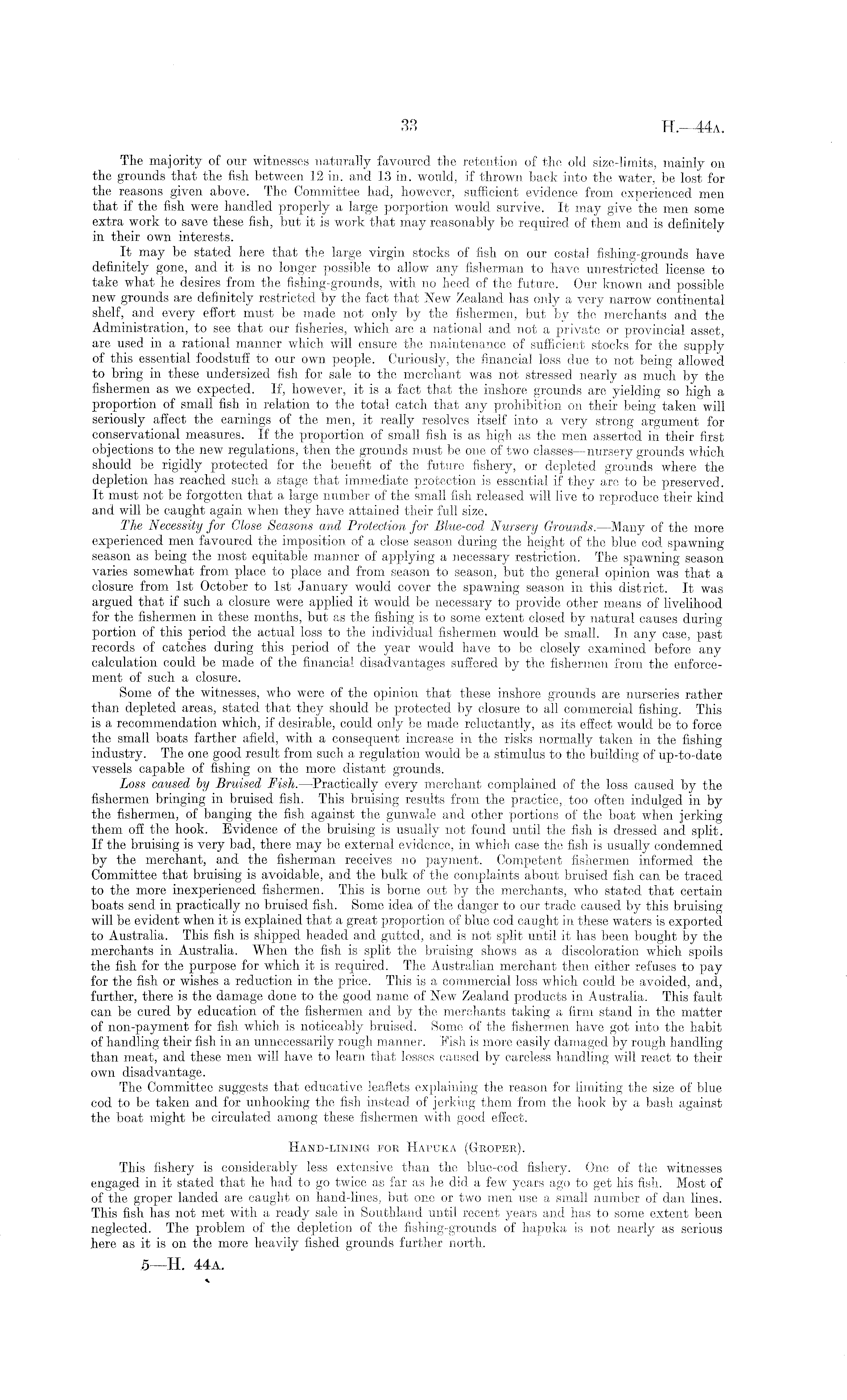 The majority of our witnesses naturally favoured the retention of the old size-limits, mainly on the grounds that the fish between 12 in. and 13 in. would, if thrown back into the water, be lost for the reasons given above. The Committee had, however, sufficient evidence from experienced men that if the fish were handled properly a large porportion would survive. It may give the men some extra work to save these fish, but it is work that may reasonably be required of them and is definitely in their own interests. It may be stated here that the large virgin stocks of fish on our costal fishing-grounds have definitely gone, and it is no longer possible to allow any fisherman to have unrestricted license to take what he desires from the fishing-grounds, with no heed of the future. Our known and possible new grounds are definitely restricted by the fact that New Zealand has only a very narrow continental shelf, and every effort must be made not only by the fishermen, but by the merchants and the Administration, to see that our fisheries, which are a national and not a private or provincial asset, are used in a rational manner which will ensure the maintenance of sufficient stocks for the supply of this essential foodstuff to our own people. Curiously, the financial loss due to not being allowed to bring in these undersized fish for sale to the merchant was not stressed nearly as much by the fishermen as we expected. If, however, it is a fact that the inshore grounds are yielding so high a proportion of small fish in relation to the total catch that any prohibition on their being taken will seriously affect the earnings of the men, it really resolves itself into a very strong argument for conservational measures. If the proportion of small fish is as high as the men asserted in their first objections to the new regulations, then the grounds must be one of two classes—nursery grounds which should be rigidly protected for the benefit of the future fishery, or depleted grounds where the depletion has reached such a stage that immediate protection is essential if they are to be preserved. It must not be forgotten that a large number of the small fish released will live to reproduce their kind and will be caught again when they have attained their full size. The Necessity for Close Seasons and Protection for Blue-cod Nursery Grounds.—-Many of the more experienced men favoured the imposition of a close season during the height of the blue cod spawning season as being the most equitable manner of applying a necessary restriction. The spawning season varies somewhat from place to place and from season to season, but the general opinion was that a closure from Ist October to Ist January would cover the spawning season in this district. It was argued that if such a closure were applied it would be necessary to provide other means of livelihood for the fishermen in these months, but as the fishing is to some extent closed by natural causes during portion of this period the actual loss to the individual fishermen would be small. In any case, past records of catches during this period of the year would have to be closely examined before any calculation could be made of the financial disadvantages suffered by the fishermen from the enforcement of such a closure. Some of the witnesses, who were of the opinion that these inshore grounds are nurseries rather than depleted areas, stated that they should be protected by closure to all commercial fishing. This is a recommendation which, if desirable, could only be made reluctantly, as its effect would be to force the small boats farther afield, with a consequent increase in the risks normally taken in the fishing industry. The one good result from such a regulation would be a stimulus to the building of up-to-date vessels capable of fishing on the more distant grounds. Loss caused by Bruised Fish. —Practically every merchant complained of the loss caused by the fishermen bringing in bruised fish. This bruising results from the practice, too often indulged in by the fishermen, of banging the fish against the gunwale and other portions of the boat when jerking them off the hook. Evidence of the bruising is usually not found until the fish is dressed and split. If the bruising is very bad, there may be external evidence, in which case the fish is usually condemned by the merchant, and the fisherman receives no payment. Competent fishermen informed the Committee that bruising is avoidable, and the bulk of the complaints about bruised fish can be traced to the more inexperienced fishermen. This is borne out by the merchants, who stated that certain boats send in practically no bruised fish. Some idea of the danger to our trade caused by this bruising will be evident when it is explained that a great proportion of blue cod caught in these waters is exported to Australia. This fish is shipped headed and gutted, and is not split until it has been bought by the merchants in Australia. When the fish is split the bruising shows as a discoloration which spoils the fish for the purpose for which it is required. The Australian merchant then either refuses to pay for the fish or wishes a reduction in the price. This is a commercial loss which could be avoided, and, further, there is the damage done to the good name of New Zealand products in Australia. This fault can be cured by education of the fishermen and by the merchants taking a firm stand in the matter of non-payment for fish which is noticeably bruised. Some of the fishermen have got into the habit of handling their fish in an unnecessarily rough manner. Fish is more easily damaged by rough handling than meat, and these men will have to learn that losses caused by careless handling will react to their own disadvantage. The Committee suggests that educative leaflets explaining the reason for limiting the size of blue cod to be taken and for unhooking the fish instead of jerking them from the hook by a bash against