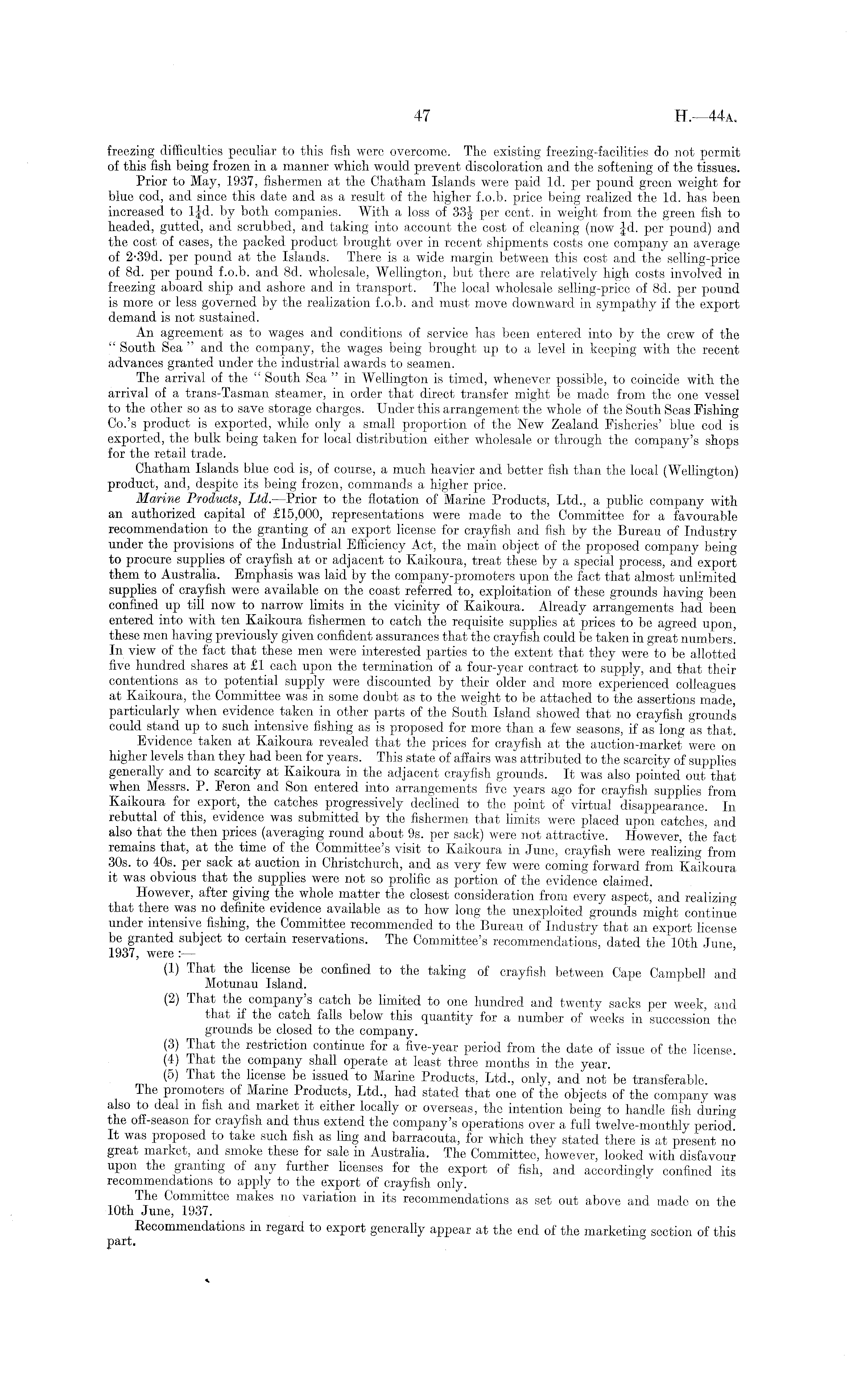 freezing difficulties peculiar to this fish were overcome. The existing freezing-facilities do not permit of this fish being frozen in a manner which would prevent discoloration and the softening of the tissues. Prior to May, 1937, fishermen at the Chatham Islands were paid Id. per pound green weight for blue cod, and since this date and as a result of the higher f.o.b. price being realized the Id. has been increased to l|d. by both companies. With a loss of 33J per cent, in weight from the green fish to headed, gutted, and scrubbed, and taking into account the cost of cleaning (now Jd. per pound) and the cost of cases, the packed product brought over in recent shipments costs one company an average of 2-39 d. per pound at the Islands. There is a wide margin between this cost and the selling-price of Bd. per pound f.o.b. and Bd. wholesale, Wellington, but there are relatively high costs involved in freezing aboard ship and ashore and in transport. The local wholesale selling-price of Bd. per pound is more or less governed by the realization f.o.b. and must move downward in sympathy if the export demand is not sustained. An agreement as to wages and conditions of service has been entered into by the crew of the " South Sea " and the company, the wages being brought up to a level in keeping with the recent advances granted under the industrial awards to seamen. The arrival of the " South Sea " in Wellington is timed, whenever possible, to coincide with the arrival of a trans-Tasman steamer, in order that direct transfer might be made from the one vessel to the other so as to save storage charges. Under this arrangement the whole of the South Seas Fishing Co.'s product is exported, while only a small proportion of the New Zealand Fisheries' blue cod is exported, the bulk being taken for local distribution either wholesale or through the company's shops for the retail trade. Chatham Islands blue cod is, of course, a much heavier and better fish than the local (Wellington) product, and, despite its being frozen, commands a higher price. Marine Products, Ltd. —Prior to the flotation of Marine Products, Ltd., a public company with an authorized capital of £15,000, representations were made to the Committee for a favourable recommendation to the granting of an export license for crayfish and fish by the Bureau of Industry under the provisions of the Industrial Efficiency Act, the main object of the proposed company being to procure supplies of crayfish at or adjacent to Kaikoura, treat these by a special process, and export them to Australia. Emphasis was laid by the company-promoters upon the fact that almost unlimited supplies of crayfish were available on the coast referred to, exploitation of these grounds having been confined up till now to narrow limits in the vicinity of Kaikoura. Already arrangements had been entered into with ten Kaikoura fishermen to catch the requisite supplies at prices to be agreed upon, these men having previously given confident assurances that the crayfish could be taken in great numbers! In view of the fact that these men were interested parties to the extent that they were to be allotted five hundred shares at £1 each upon the termination of a four-year contract to supply, and that their contentions as to potential supply were discounted by their older and more experienced colleagues at Kaikoura, the Committee was in some doubt as to the weight to be attached to the assertions made, particularly when evidence taken in other parts of the South Island showed that no crayfish grounds could stand up to such intensive fishing as is proposed for more than a few seasons, if as long as that. Evidence taken at Kaikoura revealed that the prices for crayfish at the auction-market were on higher levels than they had been for years. This state of affairs was attributed to the scarcity of supplies generally and to scarcity at Kaikoura in the adjacent crayfish grounds. It was also pointed out that when Messrs. P. Feron and Son entered into arrangements five years ago for crayfish supplies from Kaikoura for export, the catches progressively declined to the point of virtual disappearance. In rebuttal of this, evidence was submitted by the fishermen that limits were placed upon catches, and also that the then prices (averaging round about 9s. per sack) were not attractive. However, the fact remains that, at the time of the Committee's visit to Kaikoura in June, crayfish were realizing from 30s. to 40s. per sack at auction in Christchurch, and as very few were coming forward from Kaikoura. it was obvious that the supplies were not so prolific as portion of the evidence claimed. However, after giving the whole matter the closest consideration from every aspect, and realizing that there was no definite evidence available as to how long the unexploited grounds might continue under intensive fishing, the Committee recommended to the Bureau of Industry that an export license be granted subject to certain reservations. The Committee's recommendations, dated the 10th June 1937, were : — (1) That the license be confined to the taking of crayfish between Cape Campbell and Motunau Island. (2) That the company s catch be limited to one hundred and twenty sacks per week, and that if the catch falls below this quantity for a number of weeks in succession the grounds be closed to the company. (3) That the restriction continue for a five-year period from the date of issue of the license. (4) That the company shall operate at least three months in the year. (o) That the license be issued to Marine Products, Ltd., only, and not be transferable. The promoters of Marine Products, Ltd., had stated that one of the objects of the company was also to deal in fish and market it either locally or overseas, the intention being to handle fish during the off-season for crayfish and thus extend the company's operations over a full twelve-monthly period. It was proposed to take such fish as ling and bar