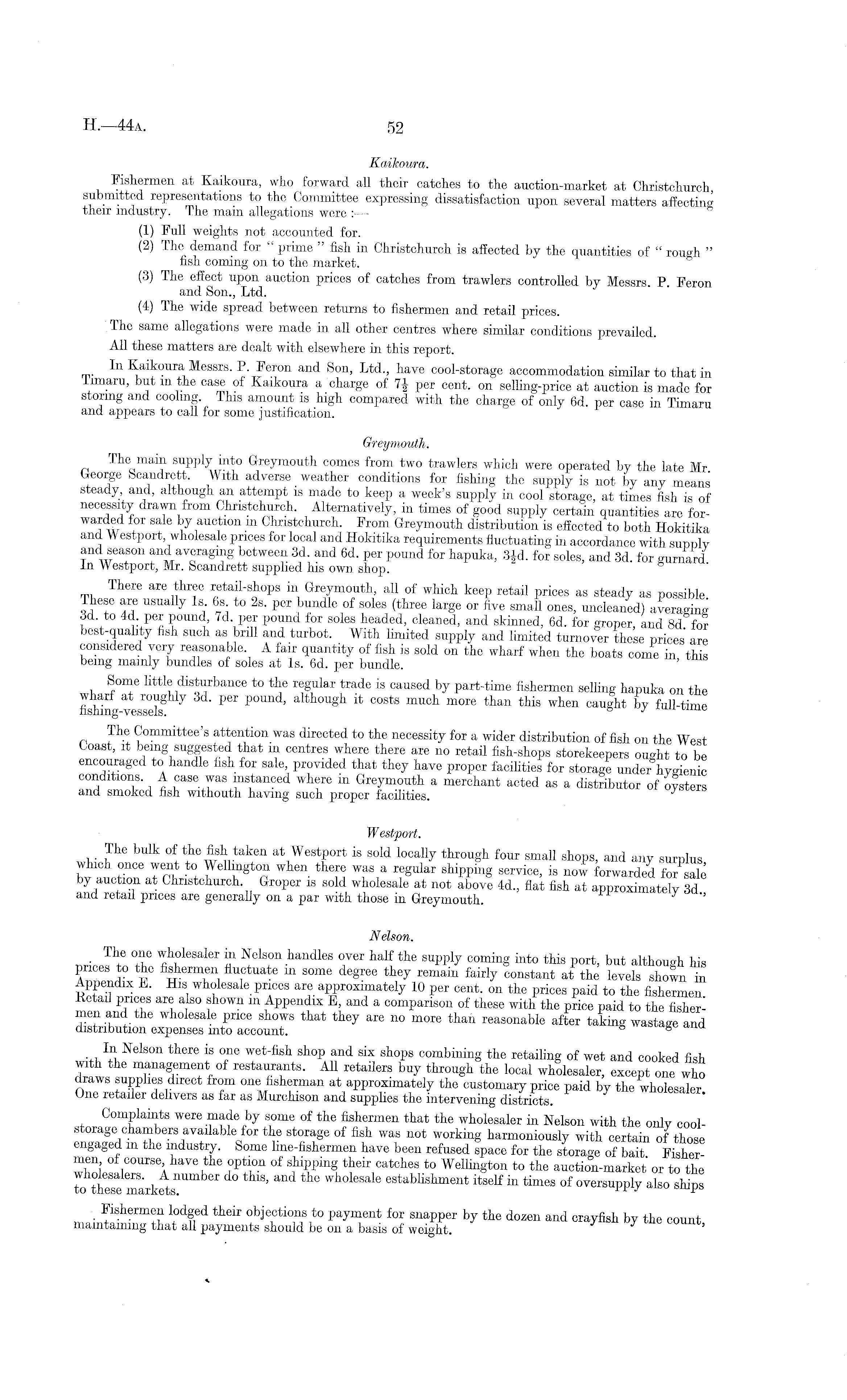 Kaikoura. Fishermen at Kaikoura, who forward all their catches to the auction-market at Christ-church submitted representations to the Committee expressing dissatisfaction upon several matters affecting their industry. The main allegations were :— (1) Full weights not accounted for. (2) The demand for " prime " fish in Christchurch is affected by the quantities of " rough " fish coming oil to the market. (3) The effect upon auction prices of catches from trawlers controlled by Messrs. P. Feron and Son., Ltd. (4) The wide spread between returns to fishermen and retail prices. The same allegations were made in all other centres where similar conditions prevailed. All these matters are dealt with elsewhere in this report. In Kaikoura Messrs. P. Feron and Son, Ltd., have cool-storage accommodation similar to that in limaru, but m the case of Kaikoura a charge of 7J per cent, on selling-price at auction is made for storing and cooling. This amount is high compared with the charge of only 6d. per case in Timaru and appears to call for some justification. Grey mouth. The main supply into Greymouth comes from two trawlers which were operated by the late Mr. George Scandrett. With adverse _ weather conditions for fishing the supply is not by any means steady, and, although an attempt is made to keep a week's supply in cool storage, at times fish is of necessity drawn from Christchurch. Alternatively, in times of good supply certain quantities are forWa J w i by auction m Christchurch. From Greymouth distribution is effected to both Hokitika and Westport, wholesale prices for local and Hokitika requirements fluctuating in accordance with supplv and season and averaging between 3d. and 6d. per pound for hapuka, 3Jd. for soles, and 3d. for gurnard In Westport, Mr. Scandrett supplied his own shop. There are three retail-shops in Greymouth, all of which keep retail prices as steady as possible. ST usua % ls - 6 s - to 2s - P er bundle of soles (threekrge or five small ones, uncleaned) averaging 3d. to 4d. per pound, 7d. per pound for soles headed, cleaned, and skinned, 6d. for groper, and Bd. for best-quality fish such as brill and turbot. With limited supply and limited turnover these prices are considered very reasonable. A fair quantity of fish is sold on the wharf when the boats come in this being mamly bundles of soles at ls. 6d. per bundle. Some little disturbance to the regular trade is caused by part-time fishermen selling hapuka on the fishing vessels aMoUgil ° osts much more tian tMs when cau gtt by full-time The Committee's attention was directed to the necessity for a wider distribution of fish on the West Coast, it being suggested that m centres where there are no retail fish-shops storekeepers ought to be encouraged to handle fish for sale, provided that they have proper facilities for storage under hygienic conditions. A case was instanced where m Greymouth a merchant acted as a distributor of oysters and smoked fish withouth having such proper facilities. Westport. The bulk of the fish taken at Westport is sold locally through four small shops, and any surplus which, once went to Wellington when there was a regular shipping service, is now forwarded for sale by auction at Christchurch Groper is sold wholesale at not above 4d., flat fish at approximately 3d and retail prices are generally on a par with those in Greymouth. '' Nelson. The one wholesaler in Nelson handles over half the supply coming into this port, but although his prices to the fishermen fluctuate m some degree they remain fairly constant at the levels shown in Appendix E. His wholesale prices are approximately 10 per cent, on the prices paid to the fishermen P rl< ?® 8 ar ® a ! so f lown ln Appendix E, and a comparison of these with the price paid to the fishermen and the wholesale price shows that they are no more thaii reasonable after taking wastage and distribution expenses into account. s ana In Nelson there is one wet-fish shop and six shops combining the retailing of wet and cooked fish with the management of restaurants. All retailers buy through the local wholesaler, except one who draws supplies direct from one fisherman at approximately the customary price paid by the wholesaler. One retailer delivers as far as Murchison and supplies the intervening districts. Complaints were made by some of the fishermen that the wholesaler in Nelson with the onlv coolstorage chambers available for the storage of fish was not working harmoniously with certain of those engaged m the industry. Some lme-fishermen have been refused space for the storage of bait Fishermen of course have the option of shipping their catches to Wellington to the auction-market or to the to thTse markets 11 1 wholesale establishment itself in times of oversupply also ships Fishermen lodged their objections to payment for snapper by the dozen and crayfish by the count maintaining that all payments should be on a basis of weight.