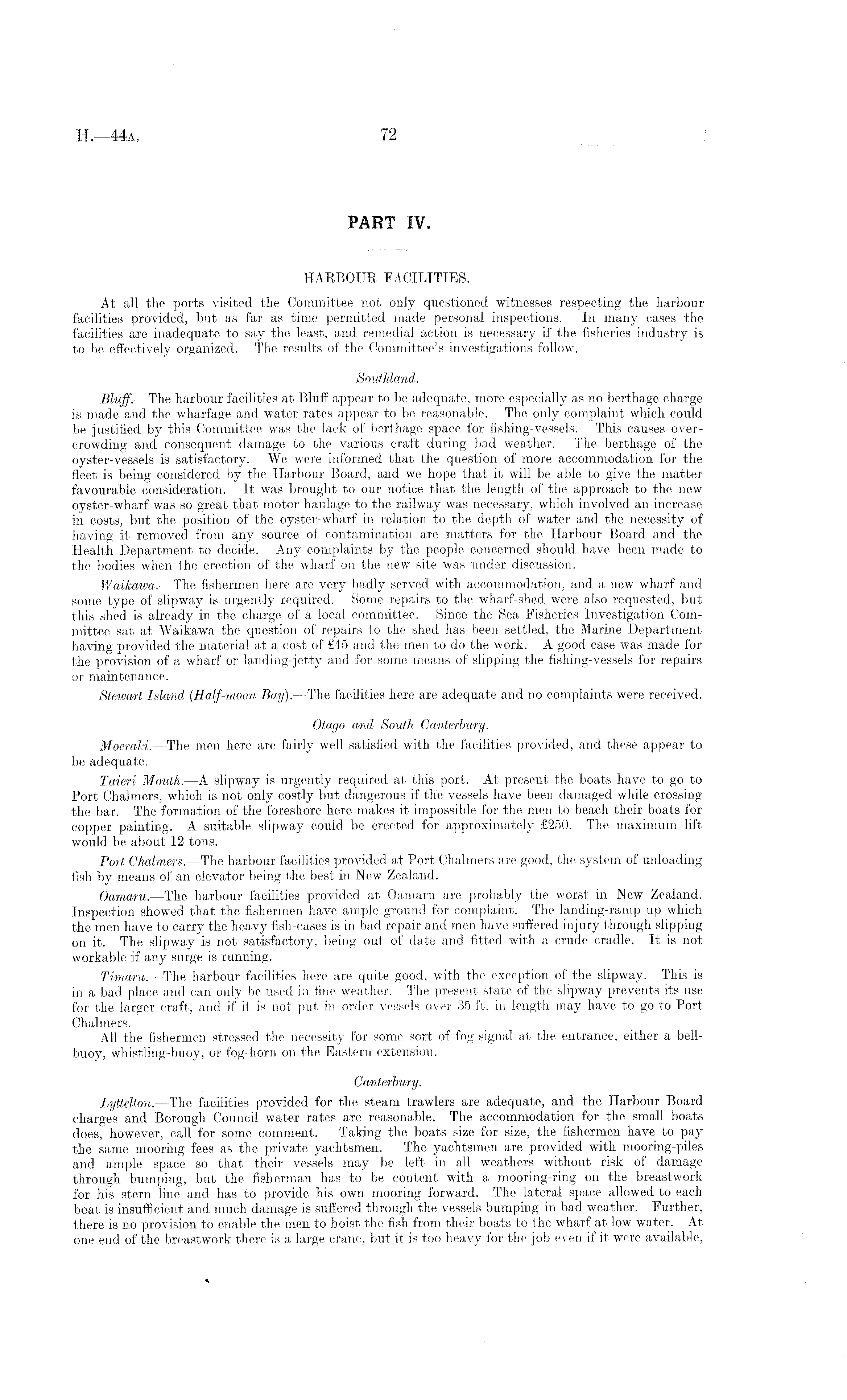 HARBOUR FACILITIES. At all the ports visited the Committee not only questioned witnesses respecting the harbour facilities provided, but as far as time permitted made personal inspections. In many cases the facilities are inadequate to say the least, and remedial action is necessary if the fisheries industry is to be effectively organized. The results of the Committee's investigations follow. Southland. Bluff. —The harbour facilities at Bluff appear to be adequate, more especially as no berthage charge is made and the wharfage and water rates appear to be reasonable. The only complaint which could be justified by this Committee was the lack of berthage space for fishing-vessels. This causes overcrowding and consequent damage to the various craft during bad weather. The berthage of the oyster-vessels is satisfactory. We were informed that the question of more accommodation for the fleet is being Considered by the Harbour Board, and we hope that it will be able to give the matter favourable consideration. It was brought to our notice that the length of the approach to the new oyster-wharf was so great that motor haulage to the railway was necessary, which involved an increase in costs, but the position of the oyster-wharf in relation to the depth of water and the necessity of having it removed from any source of contamination are matters for the Harbour Board and the Health Department to decide. Any complaints by the people concerned should have been made to the bodies when the erection of the wharf on the new site was under discussion. Waikawa. —The fishermen here are very badly served with accommodation, and a new wharf and some type of slipway is urgently required. Some repairs to the wharf-shed were also requested, but this shed is already in the charge of a local committee. Since the Sea Fisheries Investigation Committee sat at Waikawa the question of repairs to the shed has been settled, the Marine Department having provided the material at a cost of £45 and the men to do the work. A good case was made for the provision of a wharf or landing-jetty and for some means of slipping the fishing-vessels for repairs or maintenance. Stewart Island (Half-moon Bay). —The facilities here are adequate and no complaints were received. Otago and South Canterbury. Moeraki. —The men here are fairly well satisfied with the facilities provided, and these appear to be adequate. Taieri Mouth. —A slipway is urgently required at this port. At present the boats have to go to Port Chalmers, which is not only costly but dangerous if the vessels have been damaged while crossing the bar. The formation of the foreshore here makes it impossible for the men to beach their boats for copper painting. A suitable slipway could be erected for approximately £250. The maximum lift would be about 12 tons. Port Chalmers. —The harbour facilities provided at Port Chalmers are good, the system of unloading fish by means of an elevator being the best in New Zealand. Oamaru. —The harbour facilities provided at Oamaru are probably the worst, in New Zealand. Inspection showed that the fishermen have ample ground for complaint. The landing-ramp up which the men have to carry the heavy fish-cases is in bad repair and men have suffered injury through slipping on it. The slipway is not satisfactory, being out of date and fitted with a crude cradle. It is not workable if any surge is running. Timaru. —The harbour facilities here are quite good, with the exception of the slipway. This is in a bad place and can only be used in fine weather. The present state of the slipway prevents its use for the larger craft, and if it is not put in order vessels over 35 ft. in length may have to go to Port Chalmers. All the fishermen stressed the necessity for some sort of fog-signal at the entrance, either a bellbuoy, whistling-buoy, or fog-horn on the Eastern extension. Canterbury. Lyttelton. —The facilities provided for the steam trawlers are adequate, and the Harbour Board charges and Borough Council water rates are reasonable. The accommodation for the small boats does, however, call for some comment. Taking the boats size for size, the fishermen have to pay the same mooring fees as the private yachtsmen. The yachtsmen are provided with mooring-piles and ample space so that their vessels may be left in all weathers without risk of damage through bumping, but the fisherman has to be content with a mooring-ring on the breastwork for his stern line and has to provide his own mooring forward. The lateral space allowed to each boat is insufficient and much damage is suffered through the vessels bumping in bad weather. Further, there is no provision to enable the men to hoist the fish from their boats to the wharf at low water. At one end of the breastwork there is a large crane, but it is too heavy for the job even if it were available,