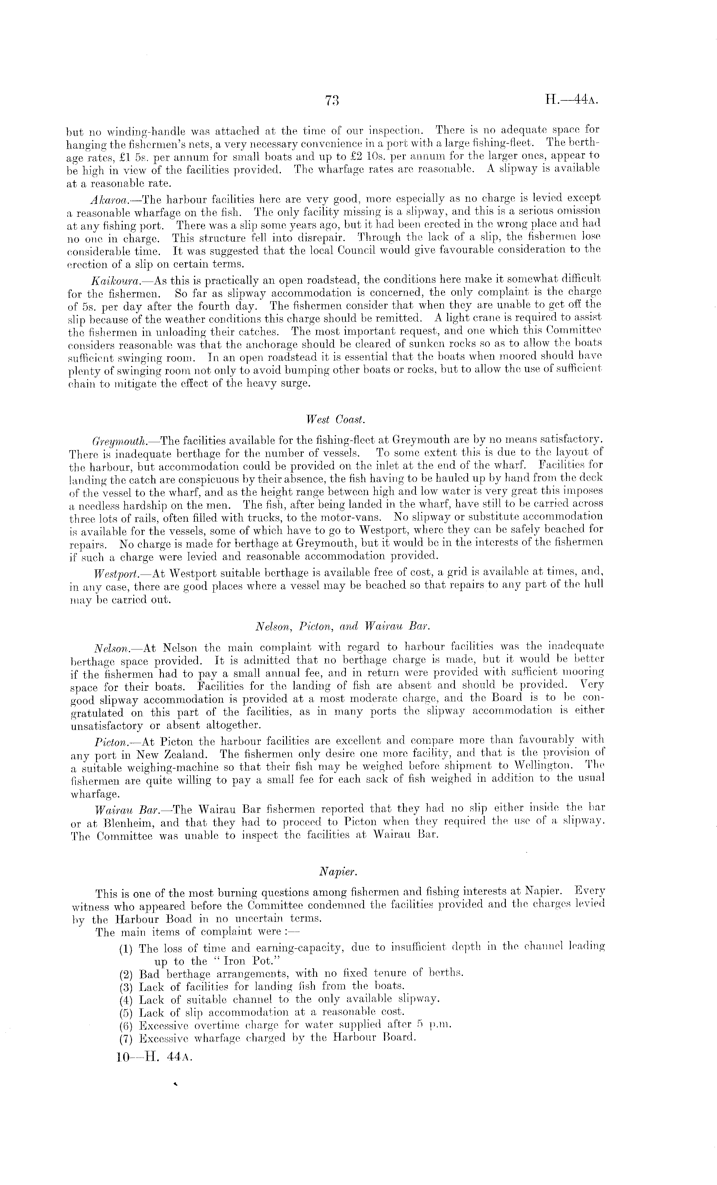 but no winding-handle was attached at the time of our inspection. There is no adequate space for hanging the fishermen's nets, a very necessary convenience in a port with a large fishing-fleet. The berthage rates, £1 ss. per annum for small boats and up to £2 10s. per annum for the larger ones, appear to be high in view of the facilities provided. The wharfage rates are reasonable. A slipway is available at a reasonable rate. Akaroa. —The harbour facilities here are very good, more especially as no charge is levied except a reasonable wharfage on the fish. The only facility missing is a slipway, and this is a serious omission at any fishing port. There was a slip some years ago, but it had been erected in the wrong place and had no one in charge. This structure fell into disrepair. Through the lack of a slip, the fishermen lose considerable time. It was suggested that the local Council would give favourable consideration to the erection of a slip on certain terms. Kaihoura. —As this is practically an open roadstead, the conditions here make it somewhat difficult for the fishermen. So far as slipway accommodation is concerned, the only complaint is the charge of ss. per day after the fourth day. The fishermen consider that when they are unable to get off the slip because of the weather conditions this charge should be remitted. A light crane is required to assist the fishermen in unloading their catches. The most important request, and one which this Committee considers reasonable was that the anchorage should be cleared of sunken rocks so as to allow the boats sufficient swinging room. In an open roadstead it is essential that the boats when moored should have plenty of swinging room not only to avoid bumping other boats or rocks, but to allow the use of sufficient chain to mitigate the effect of the heavy surge. West Coast. Greymouth.—The facilities available for the fishing-fleet at Greymouth are by no means satisfactory. There is inadequate berthage for the number of vessels. To some extent this is due to the layout of the harbour, but accommodation could be provided on the inlet at the end of the wharf. Facilities for landing the catch are conspicuous by their absence, the fish having to be hauled up by hand from the deck of the vessel to the wharf, and as the height range between high and low water is very great this imposes a needless hardship on the men. The fish, after being landed in the wharf, have still to be carried across three lots of rails, often filled with trucks, to the motor-vans. No slipway or substitute accommodation is available for the vessels, some of which have to go to Westport, where they can be safely beached for repairs. No charge is made for berthage at Greymouth, but it would be in the interests of the fishermen if such a charge were levied and reasonable accommodation provided. Westport. —At Westport suitable berthage is available free of cost, a grid is available at times, and, in any case, there are good places where a vessel may be beached so that repairs to any part of the hull may be carried out. Nelson, Picton, and Wairau Bar. Nelson. —At Nelson the main complaint with regard to harbour facilities was the inadequate berthage space provided. It is admitted that no berthage charge is made, but it would be better if the fishermen had to pay a small annual fee, and in return were provided with sufficient mooring space for their boats. Facilities for the landing of fish are absent and should be provided. Very good slipway accommodation is provided at a most moderate charge, and the Board is to be congratulated on this part of the facilities, as in many ports the slipway accommodation is either unsatisfactory or absent altogether. Picton. —At Picton the harbour facilities are excellent and compare more than favourably with any port in New Zealand. The fishermen only desire one more facility, and that is the provision of a suitable weighing-machine so that their fish may be weighed before shipment to Wellington. The fishermen are quite willing to pay a small fee for each sack of fish weighed in addition to the usual wharfage. Wairau Bar. —The Wairau Bar fishermen reported that they had no slip either inside the bar or at Blenheim, and that they had to proceed to Picton when they required the use of a slipway. The Committee was unable to inspect the facilities at Wairau Bar. Napier. This is one of the most burning questions among fishermen and fishing interests at Napier. Every witness who appeared before the Committee condemned the facilities provided and the charges levied by the Harbour Boad in no uncertain terms. The main items of complaint were : — (1) The loss of time and earning-capacity, due to insufficient depth in the channel leading up to the " Iron Pot." (2) Bad berthage arrangements, with no fixed tenure of berths. (3) Lack of facilities' for landing fish from the boats. (4) Lack of suitable channel to the only available slipway. (5) Lack of slip accommodation at a reasonable cost. (6) Excessive overtime charge for water supplied after 5 p.m. (7) Excessive wharfage charged by the Harbour Board.