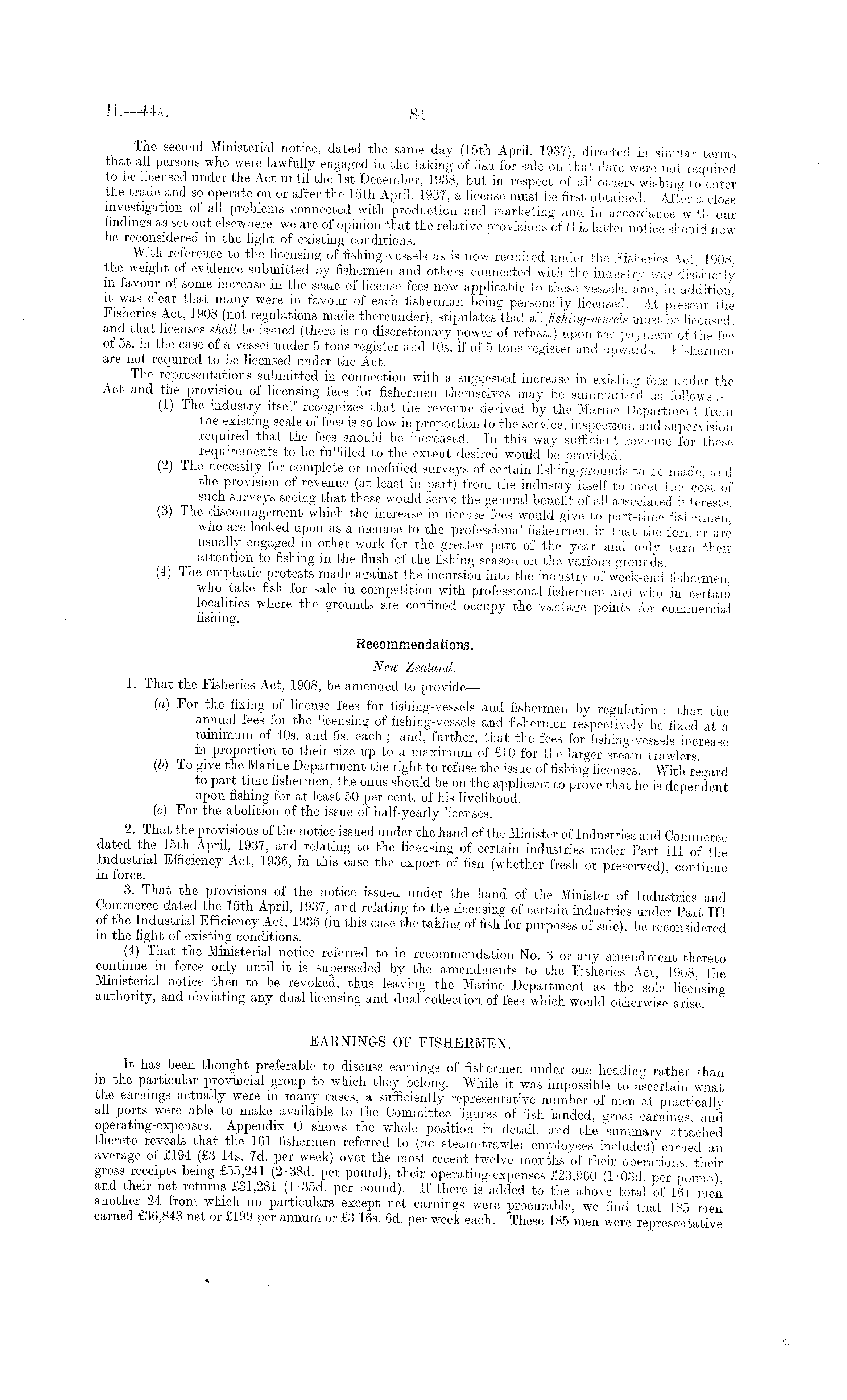 The second Ministerial notice, dated the same day (15th April, 1937), directed in similar terms that all persons who were lawfully engaged in the taking of fish for sale on that date were not required to be licensed under the Act until the Ist December, 1938, but in respect of all others wishing to enter the trade and so operate on or after the 15th April, 1937, a license must be first obtained. After a close investigation of all problems connected with production and marketing and in accordance with our findings as set out elsewhere, we are of opinion that the relative provisions of this latter notice should now be reconsidered in the light of existing conditions. With reference to the licensing of fishing-vessels as is now required under the Fisheries Act, 1908 the weight of evidence submitted by fishermen and others connected with the industry was distinctly m favour of some increase in the scale of license fees now applicable to these vessels, and, in addition, it was clear that many were in favour of each fisherman being personally licensed. At present the Fisheries Act, 1908 (not regulations made thereunder), stipulates that all fishing-vessels must be licensed, and that licenses shall be issued (there is no discretionary power of refusal) upon the payment of the fee of ss. m the case of a vessel under 5 tons register and 10s. if of 5 tons register and upwards Fishermen are not required to be licensed under the Act. Ihe representations submitted m connection with a suggested increase in existing fees under the Act and the provision of licensing fees for fishermen themselves may be summarized as follows : (1) The industry itself recognizes that the revenue derived by the Marine Department from the existing scale of fees is so low in proportion to the service, inspection, and supervision required that the fees should be increased. In this way sufficient revenue for these requirements to be fulfilled to the extent desired would be provided. (2) The necessity for complete or modified surveys of certain fishing-grounds to be made, and the provision of revenue (at least in part) from the industry itself to meet the cost of Sl j Ch surveys Beein B ttat these would serve tlle general benefit of all associated interests. (3) The discouragement which the increase in license fees would give to part-time fishermen, who are looked upon as a menace to the professional fishermen, in that the former are usually engaged in other work for the greater part of the year and only turn their attention to fishing in the flush of the fishing season on the various grounds. (4) The emphatic protests made against the incursion into the industry of week-end fishermen, who take fish for sale in competition with professional fishermen and who in certain localities where the grounds are confined occupy the vantage points for commercial fishing. Recommendations. New Zealand. 1. That the Fisheries Act, 1908, be amended to provide— (а) For the fixing of license fees for fishing-vessels and fishermen by regulation ; that the annual fees for the licensing of fishing-vessels and fishermen respectively be' fixed at a minimum of 40s. and ss. each ; and, further, that the fees for fishing-vessels increase in proportion to their size up to a maximum of £10 for the larger steam trawlers (б) To give the Marine Department the right to refuse the issue of fishing licenses. With regard to part-time fishermen, the onus should be on the applicant to prove that he is dependent upon fishing for at least 50 per cent, of his livelihood. 1 (c) For the abolition of the issue of half-yearly licenses. 2. That the provisions of the notice issued under the hand of the Minister of Industries and Commerce dated the 15th April, 1937, and relating to the licensing of certain industries under Part 111 of the Industrial Efficiency Act, 1936, in this case the export of fish (whether fresh or preserved) continue m force. 3. That the provisions of the notice issued under the hand of the Minister of Industries and Commerce dated the 15th April, 1937, and relating to the licensing of certain industries under Part 111 of the Industrial Efficiency Act, .1936 (in this case the taking of fish for purposes of sale), be reconsidered m the light of existing conditions. (4) That, the Ministerial notice referred to in recommendation No. 3 or any amendment thereto continue in force only until it is superseded by the amendments to the Fisheries Act, 1908 the Ministerial notice then to be revoked, thus leaving the Marine Department as the sole licensing authority, and obviating any dual licensing and dual collection of fees which would otherwise arise. EARNINGS OF FISHERMEN. It has been thought preferable to discuss earnings of fishermen under one heading rather than m the particular provincial group to which they belong. While it was impossible to ascertain what the earnings actually were in many cases, a sufficiently representative number of men at practically all ports were able to make available to the Committee figures of fish landed, gross earnings and operating-expenses. Appendix O shows the whole position in detail, and the summary attached thereto reveals that the 161 fishermen referred to (no steam-trawler employees included) earned an average of £194 (£3 14s. 7d. per week) over the most recent twelve months of their operations their gross receipts being £55,241 (2-38 d. per pound), their operating-expenses £23,960 (1 -03d per pound) and their net returns £31,281 (l-35d. per pound). If there is added to the above total of 161 men another 24 from which no particulars except net earnings were procurable, we find that 185 men earned £36,843 net or £199 per annum or £3 16s. 6d. per week each. These 185 men were representative