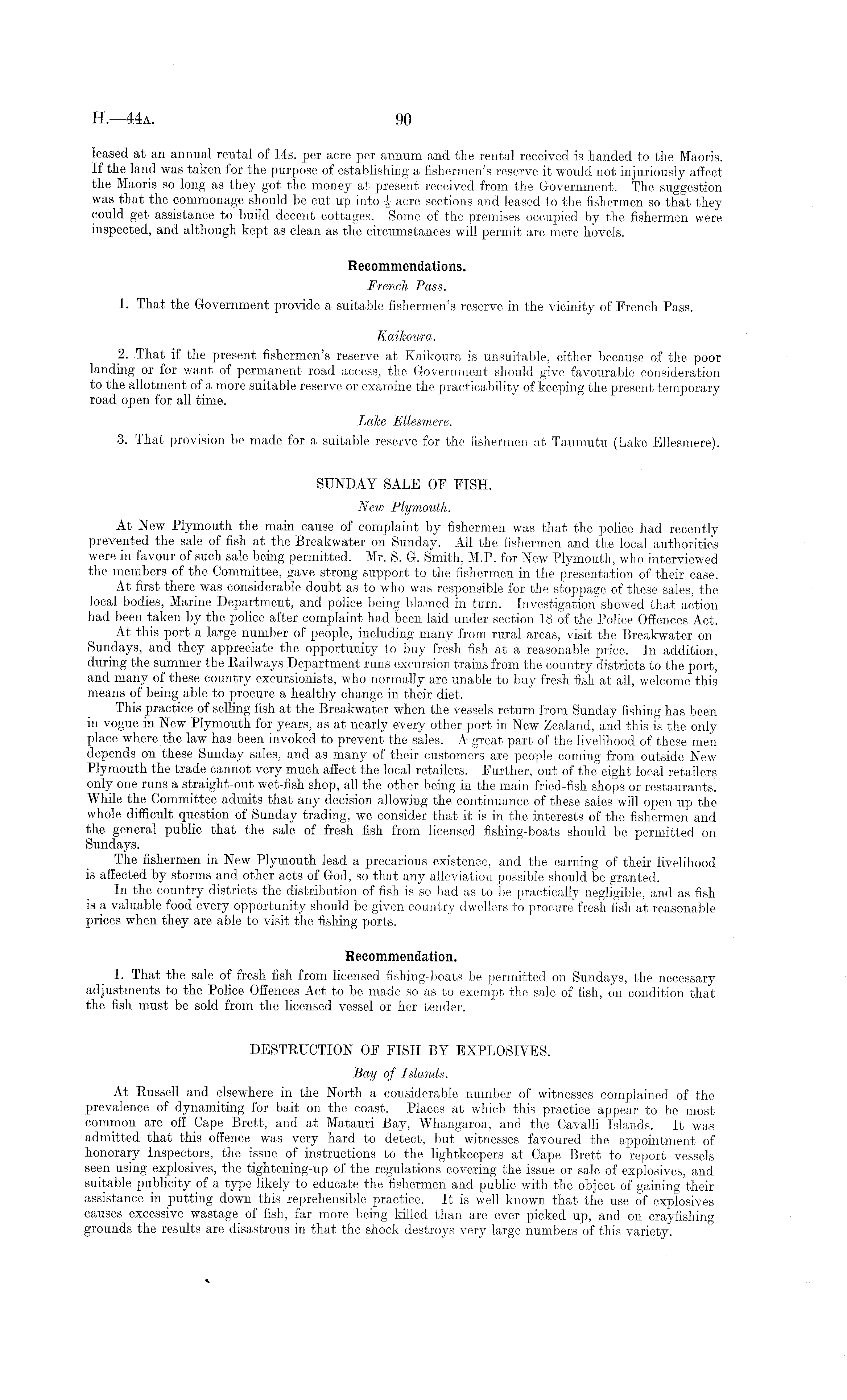 leased at an annual rental of 14s. per acre per annum and the rental received is handed to the Maoris. If the land was taken for the purpose of establishing a fishermen's reserve it would not injuriously affect the Maoris so long as they got the money at present received from the Government. The suggestion was that the commonage should be cut up into acre sections and leased to the fishermen so that they could get assistance to build decent cottages. Some of the premises occupied by the fishermen were inspected, and although kept as clean as the circumstances will permit are mere hovels. Recommendations. French Pass. 1. That the Government provide a suitable fishermen's reserve in the vicinity of French Pass. Kaikoura. 2. That if the present fishermen's reserve at Kaikoura is unsuitable, either because of the poor landing or for want of permanent road access, the Government should give favourable consideration to the allotment of a more suitable reserve or examine the practicability of keeping the present temporary road open for all time. Lake Ellesmere. 3. That provision be made for a suitable reserve for the fishermen at Taumutu (Lake Ellesmere). SUNDAY SALE OP PISH. New Plymouth. At New Plymouth the main cause of complaint by fishermen was that the police had recently prevented the sale of fish at the Breakwater on Sunday. All the fishermen and the local authoritie's were in favour of such sale being permitted. Mr. S. G. Smith, M.P. for New Plymouth, who interviewed the members of the Committee, gave strong support to the fishermen in the presentation of their case. At first there was considerable doubt as to who was responsible for the stoppage of these sales, the local bodies, Marine Department, and police being blamed in turn. Investigation showed that action had been taken by the police after complaint had been laid under section 18 of the Police Offences Act. At this port a large number of people, including many from rural areas, visit the Breakwater on Sundays, and they appreciate the opportunity to buy fresh fish at a reasonable price. In addition, during the summer the Railways Department runs excursion trains from the country districts to the port, and many of these country excursionists, who normally are unable to buy fresh fish at all, welcome this means of being able to procure a healthy change in their diet. This practice of selling fish at the Breakwater when the vessels return from Sunday fishing has been in vogue in New Plymouth for years, as at nearly every other port in New Zealand, and this is the only place where the law has been invoked to prevent the sales. A great part of the livelihood of these men depends on these Sunday sales, and as many of their customers are people coming from outside New Plymouth the trade cannot very much affect the local retailers. Further, out of the eight local retailers only one runs a straight-out wet-fish shop, all the other being in the main fried-fish shops or restaurants. While the Committee admits that any decision allowing the continuance of these sales will open up the whole difficult question of Sunday trading, we consider that it is in the interests of the fishermen and the general public that the sale of fresh fish from licensed fishing-boats should be permitted on Sundays. The fishermen in New Plymouth lead a precarious existence, and the earning of their livelihood is affected by storms and other acts of God, so that any alleviation possible should be granted. In the country districts the distribution of fish is so bad as to be practically negligible, and as fish is a valuable food every opportunity should be given country dwellers to procure fresh fish at reasonable prices when they are able to visit the fishing ports. Recommendation. 1. That the sale of fresh fish from licensed fishing-boats be permitted on Sundays, the necessary adjustments to the Police Offences Act to be made so as to exempt the sale of .fish, on condition that the fish must be sold from the licensed vessel or her tender. DESTRUCTION OF FISH BY EXPLOSIVES. Bay of Islands. At Russell and elsewhere in the North a considerable number of witnesses complained of the prevalence of dynamiting for bait on the coast. Places at which this practice appear to be most common are off Cape Brett, and at Matauri Bay, Whangaroa, and the Cavalli Islands. It was admitted that this offence was very hard to detect, but witnesses favoured the appointment of honorary Inspectors, the issue of instructions to the lightkeepers at Cape Brett to report vessels seen using explosives, the tightening-up of the regulations covering the issue or sale of explosives, and suitable publicity of a type likely to educate the fishermen and public with the object of gaining their assistance in putting down this reprehensible practice. It is well known that the use of explosives causes excessive wastage of fish, far more being killed than are ever picked up, and on crayfishing grounds the results are disastrous in that the shock destroys very large numbers of this variety.