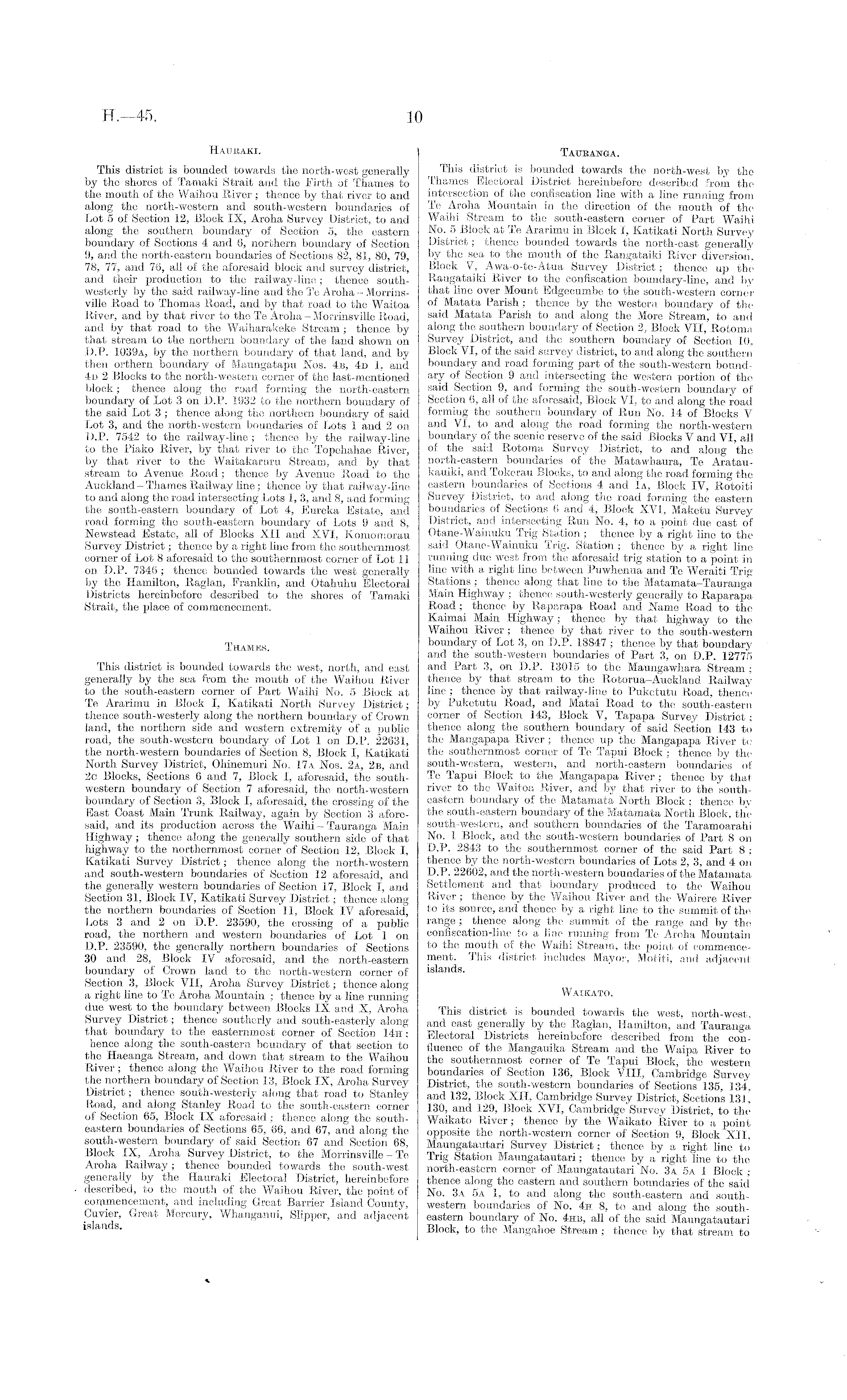 Hattbaki. This district is bounded towards the north-west generally by the shores of Tamaki Strait and the Firth of Thames to the mouth of the Waihou River ; thence by that river to and along the north-western and south-western boundaries of Lot 5 of Section 12, Block IX, Aroha Survey District, to and along the southern boundary of Section 5, the eastern boundary of Sections 4 and 6, northern boundary of Section 9, and the north-eastern boundaries of Sections 82, 81, 80, 79, 78, 77, and 76, all of the aforesaid block and survey district, and their production to the railway-line; thence southwesterly by the said railway-line and the Te Aroha - Morrinsvilie Road to Thomas Road, and by that road to the Waitoa River, and by that river to the Te Aroha - Morrinsville and by that road to the Waiharakeke Stream ; thence by that stream to the northern boundary of the land shown on D.P. 1039 a, by the northern boundary of that land, and by then orthern boundary of Maungatapu Nos. 4b, 4d 1, and 4d 2 Blocks to the north-western corner of the last-mentioned block; thence along the road forming the north-eastern boundary of Lot 3 on D.P. 1932 to the northern boundary of the said Lot 3 ; thence along the northern boundary of said Lot 3, and the north-western boundaries of Lots 1 and 2 on D.P. 7542 to the railway-line ; thence by the railway-line to the Piako River, by that river to the Topehahae River, by that river to the Waitakaruru Stream, and by that stream to Avenue Road; thence by Avenue Road to the Auckland - Thames Railway line; thence by that railway-line to and along the road intersecting Lots 1, 3, and 8, and forming the south-eastern boundary of Lot 4, Eureka Estate, and road forming the south-eastern boundary of Lots 9 and 8, Newstead Estate, all of Blocks XII and XVI, Komomorau Survey District; thence by a right line from the southernmost corner of Lot 8 aforesaid to the southernmost corner of Lot 11 on D.P. 7346 ; thence bounded towards the west generally by the Hamilton, Raglan, Franklin, and Otahuhu Electoral Districts hereinbefore described to the shores of Tamaki Strait, the place of commencement. Thames. This district is bounded towards the west, north, and east generally by the sea from the mouth of the Waihou River to the south-eastern corner of Part Waihi No. 5 Block at Te Ararimu in Block I, Katikati North Survey District; thence south-westerly along the northern boundary of Crown land, the northern side and western extremity of a public road, the south-western boundary of Lot 1 on D.P. 22631, the north-western boundaries of Section 8, Block I, Katikati North Survey District, Ohinemuri No. 17a Nos. 2a, 2b, and 2c Blocks, Sections 6 and 7, Block I, aforesaid, the southwestern boundary of Section 7 aforesaid, the north-western boundary of Section 3, Block I, aforesaid, the crossing of the East Coast Main Trunk Railway, again by Section 3 aforesaid, and its production across the Waihi - Tauranga Main Highway; thence along the generally southern side of that highway to the northernmost corner of Section 12, Block I, Katikati Survey District; thence along the north-western and south-western boundaries of Section 12 aforesaid, and the generally western boundaries of Section 17, Block I, and Section 31, Block IV, Katikati Survey District; thence along the northern boundaries of Section 11, Block IV aforesaid, Lots 3 and 2 on D.P. 23590, the crossing of a public road, the northern and western boundaries of Lot 1 on D.P. 23590, the generally northern boundaries of Sections 30 and 28, Block IV aforesaid, and the north-eastern boundary of Crown land to the north-western comer of Section 3, Block VII, Aroha Survey District; thence along a right line to Te Aroha Mountain ; thence by a line running due west to the boundary between Blocks IX and X, Aroha Survey District; thence southerly and south-easterly along that boundary to the easternmost corner of Section 14h ; hence along the south-eastern boundary of that section to the Haeanga Stream, and down that stream to the Waihou River; thence along the Waihou River to the road forming the northern boundary of Section 13, Block IX, Aroha Survey District; thence south-westerly along that road to Stanley Road, and along Stanley Road to the south-eastern corner of Section 65, Block IX aforesaid ; thence along the southeastern boundaries of Sections 65, 66, and 67, and along the south-western boundary of said Section 67 and Section 68, Block IX, Aroha Survey District, to the Morrinsville -Te Aroha Railway; thence bounded towards the south-west generally by the Hauraki Electoral District, hereinbefore described, to the mouth of the Waihou River, the point of commencement, and including Great Barrier Island County, Cuvier, Great Mercury, Whanganui, Slipper, and adjacent islands.