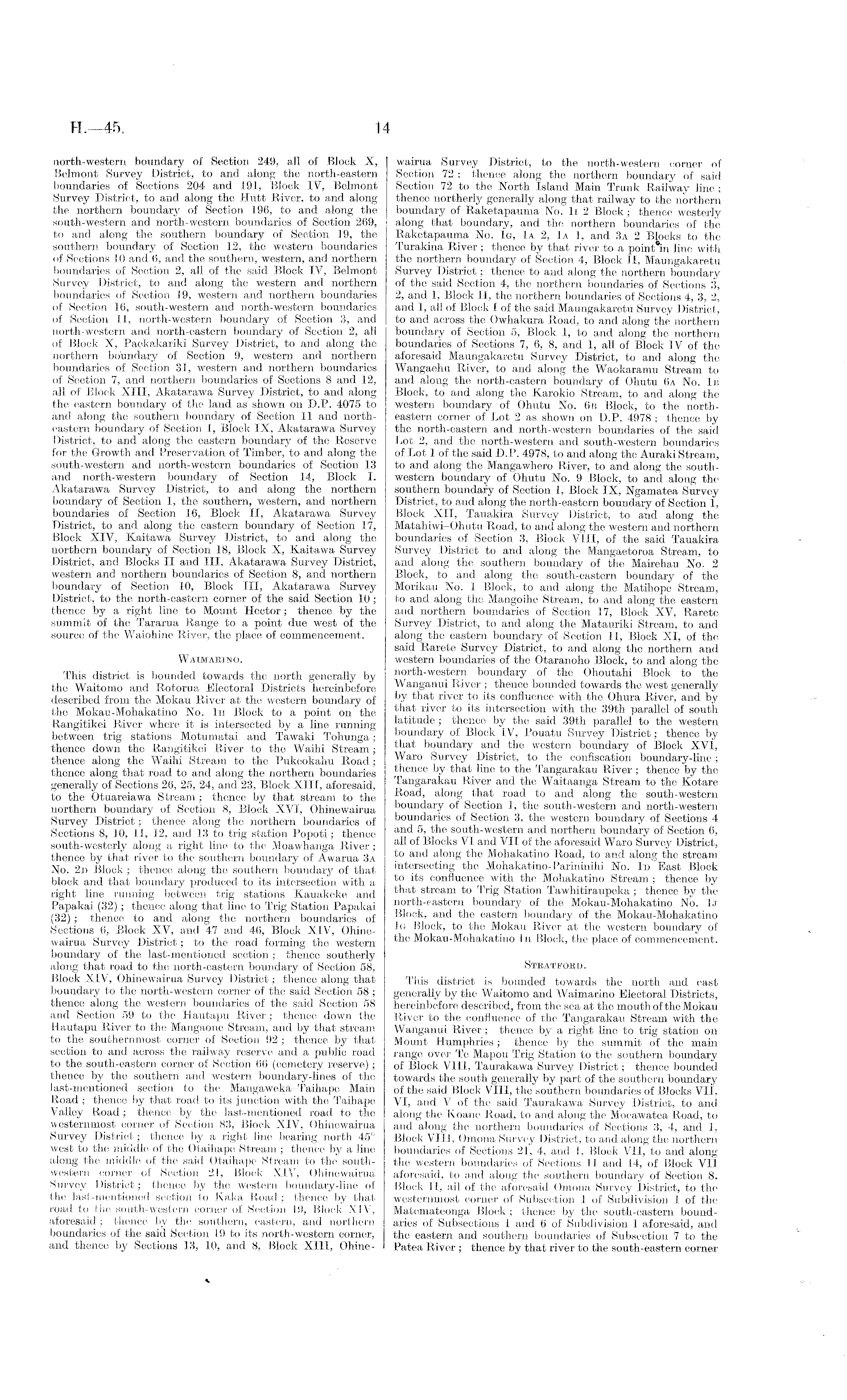 wairua Survey District, to the north-western corner of Section 72 ; thence along the northern boundary of said Section 72 to the North Island Main Trunk Railway line ; thence northerly generally along that railway to the northern boundary of Raketapauma No. li 2 Block ; thence westerly along that boundary, and the northern boundaries of the Raketapauma No. Ig, Ia 2, 1a 1, and 3a 2 Blocks to the Turakina River ; thence by that river to a point m line with the northern boundary of Section 4, Block 11, Maungakaretu Survey District; thence to and along the northern boundary of the said Section 4, the northern boundaries of Sections 3, 2, and 1, Block 11, the northern boundaries of Sections 4, 3, 2, and 1, all of Block I of the said Maungakaretu Survey District, to and across the Owhakura Road, to and along the northern boundary of Section 5, Block I, to and along the northern boundaries of Sections 7, 6, 8, and 1, all of Block IV of the aforesaid Maungakaretu Survey District, to and along the Wangaehu River, to and along the Waokaramu Stream to and along the north-eastern boundary of Ohutu 6a No. 1b Block, to and along the Karokio Stream, to and along the western boundary of Ohutu No. 6b Block, to the northeastern corner of Lot 2 as shown on D.P. 4978 ; thence by the north-eastern and north-western boundaries of the saidLot 2, and the north-western and south-western boundaries of Lot 1 of the said D.P. 4978, to and along the Auraki Stream, to and along the Mangawhero River, to and along the southwestern boundary of Ohutu No. 9 Block, to and along the southern boundary of Section 1, Block IX, Ngamatea Survey District, to and along the north-eastern boundary of Section 1, Block XII, Tauakira Survey District, to and along the Matahiwi—Ohutu Road, to and along the western and northern boundaries of Section 3, Block VIII, of the said Tauakira Survey District to and along the Mangaetoroa Stream, to and along the southern boundary of the Mairehau No. 2 Block, to and along the south-eastern boundary of the Morikau No. 1 Block, to and along the Matihope Stream, to and along the Mangoihe Stream, to and along the eastern and northern boundaries of Section 17, Block XV, Rarete Survey District, to and along the Matauriki Stream, to and along the eastern boundary of Section 11, Block XI, of the said Rarete Survey District, to and along the northern and western boundaries of the Otaranoho Block, to and along the north-western boundary of the Ohoutahi Block to the Wanganui River ; thence bounded towards the west generally by that river to its confluence with the Ohura River, and by that river to its intersection with the 39th parallel of south latitude ; thence by the said 39th parallel to the western boundary of Block IV, Pouatu Survey District; thence by that boundary and the western boundary of Block XVI, Waro Survey District, to the confiscation boundary-line ; thence by that line to the Tangarakau River ; thence by the Tangarakau River and the Waitaanga Stream to the Kotare Road, along that road to and along the south-western boundary of Section 1, the south-western and north-western boundaries of Section 3, the western boundary of Sections 4 and 5, the south-western and northern boundary of Section 6, all of Blocks VI and VII of the aforesaid Waro Survey District, to and along the Mohakatino Road, to and along the stream intersecting the Mohakatino-Parininihi No. Id East Block to its confluence with the Mohakatino Stream ; thence by that stream to Trig Station Tawhitiraupeka ; thence by the north-eastern boundary of the Mokau-Mohakatino No. 1j Block, and the eastern boundary of the Mokau-Mohakatino 1g Block, to the Mokau River at the western boundary of the Mokau-Mohakatino 1h Block, the place of commencement. Stratford. This district is bounded towards the north and east generally by the Waitomo and Waimarino Electoral Districts, hereinbefore described, from the sea at the mouth of the Mokau River to the confluence of the Tangarakau Stream with the Wanganui River ; thence by a right line to trig station on Mount Humphries; thence by the summit of the main range over Te Mapou Trig Station to the southern boundary of Block VIII, Taurakawa Survey District; thence bounded towards the south generally by part of the southern boundary of the said Block VIII, the southern boundaries of Blocks VII, VI, and V of the said Taurakawa • Survey District, to and along the Koane Road, to and along the M'oeawatea Road, to and along the northern boundaries of Sections 3, 4, and 1, Block VIII, Omona Survey District, to and along the northern boundaries of Sections 21, 4, and I, Block VII, to and along the western boundaries of Sections 11 and 14, of Block VII aforesaid, to and along the southern boundary of Section 8, Block 11, all of the aforesaid Omona Survey District, to the westernmost corner of Subsection 1 of Subdivision 1 of the Matemateonga Block; thence by the south-eastern boundaries of Subsections I and 6 of Subdivision 1 aforesaid, and the eastern and southern boundaries of Subsection 7 to the Patea River ; thence by that river to the south-eastern corner