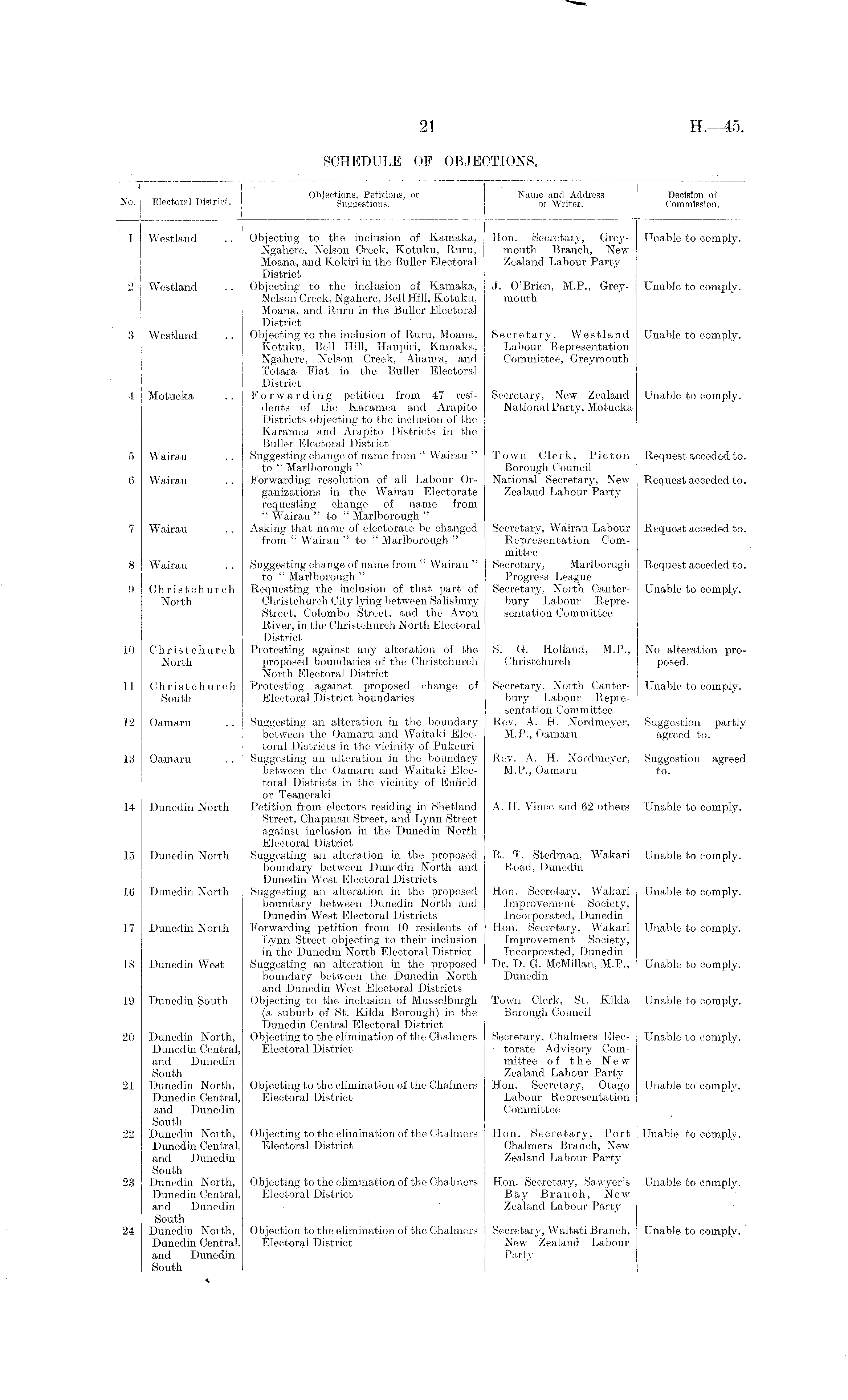 Objections, Petitions, or Name and Address Decision of fto. Electoral District. J Suggestions. of Writer. Commission. , 1 1 Westland .. Objecting to the inclusion of Kamaka, Hon. Secretary, Grey- Unable to comply. Ngahere, Nelson Creek, Kotuku, Ruru, mouth Branch, New Moana, and Kokiri in the Buller Electoral Zealand Labour Party District 2 Westland .. Objecting to the inclusion of Kamaka, J. O'Brien, M.P., Grey- Unable to comply. Nelson Creek, Ngahere, Bell Hill, Kotuku, mouth Moana, and Ruru in the Buller Electoral District 3 Westland .. Objecting to the inclusion of Ruru, Moana, Secretary, Westland Unable to comply. Kotuku, Bell Hill, Haupiri, Kamaka, Labour Representation Ngahere, Nelson Creek, Ahaura, and Committee, Greymouth Totara Flat in the Buller Electoral District 4 Motueka .. Forwarding petition from 47 resi- Secretary, New Zealand Unable to comply. dents of the Karamea and Arapito National Party, Motueka Districts objecting to the inclusion of the Karamea and Arapito Districts in the Buller Electoral District 5 Wairau .. Suggesting change of name from" Wairau " Town Clerk, Pic ton Request acceded to. to " Marlborough " Borough Council 6 Wairau .. Forwarding resolution of all Labour Or- National Secretary, New Request acceded to. ganizations in the Wairau Electorate Zealand Labour Party requesting change of name from " Wairau " to " Marlborough " 7 Wairau . . Asking that name of electorate be changed Secretary, Wairau Labour Request acceded to. from " Wairau " to " Marlborough " Representation Committee 8 Wairau .. Suggesting change of name from " Wairau " Secretary, Marlborugh Request acceded to. to " Marlborough " Progress League 9 Christchurch Requesting the inclusion of that part of Secretary, North Canter- Unable to comply. North Christchurch City lying between Salisbury bury Labour RepreStreet, Colombo Street, and the Avon sentation Committee River, in the Christchurch North Electoral District 10 Christchurch Protesting against any alteration of the S. G. Holland, M.P., No alteration proNorth proposed boundaries of the Christchurch Christchurch posed. North Electoral District 11 Christchurch Protesting against proposed change of Secretary, North Canter- Unable to comply. South Electoral District boundaries bury Labour Representation Committee 12 Oamaru . . Suggesting an alteration in the boundary Rev. A. H. Nordmeyer, Suggestion partly between the Oamaru and Waitaki Elec- M.P., Oamaru agreed to. toral Districts in the vicinity of Pukeuri 13 Oamaru .. Suggesting an alteration in the boundary Rev. A. H. Nordmeyer, Suggestion agreed between the Oamaru and Waitaki Elec- M.P., Oamaru to. toral Districts in the vicinity of Enfield or Teaneraki 14 Dunedin North Petition from electors residing in Shetland A. H. Vince and 62 others Unable to comply. Street, Chapman Street, and Lynn Street against inclusion in the Dunedin North Electoral District 15 Dunedin North Suggesting an alteration in the proposed R. T. Stedman, Wakari Unable to comply. boundary between Dunedin North and Road, Dunedin Dunedin West Electoral Districts 16 Dunedin North Suggesting an alteration in the proposed Hon. Secretary, Wakari Unable to comply. boundary between Dunedin North and Improvement Society, Dunedin West Electoral Districts Incorporated, Dunedin 17 Dunedin North Forwarding petition from 10 residents of Hon. Secretary, Wakari Unable to comply. Lynn Street objecting to their inclusion Improvement Society, in the Dunedin North Electoral District Incorporated, Dunedin 18 Dunedin West Suggesting an alteration in the proposed Dr. D. G. McMillan, M.P., Unable to comply. boundary between the Dunedin North Dunedin and Dunedin West Electoral Districts 19 Dunedin South Objecting to the inclusion of Musselburgh Town Clerk, St. Kilda Unable to comply. (a suburb of St. Kilda Borough) in the Borough Council Dunedin Central Electoral District 20 Dunedin North, Objecting to the elimination of the Chalmers Secretary, Chalmers Elec- Unable to comply. Dunedin Central, Electoral District torate Advisory Comand Dunedin mittee of the New South Zealand Labour Party 21 Dunedin North, Objecting to the elimination of the Chalmers Hon. Secretary, Otago Unable to comply. Dunedin Central, Electoral District Labour Representation and Dunedin Committee South 22 Dunedin North, Objecting to the elimination of the Chalmers Hon. Secretary, Port Unable to comply. Dunedin Central, Electoral District Chalmers Branch, New and Dunedin Zealand Labour Party South 23 Dunedin North, Objecting to the elimination of the Chalmers Hon. Secretary, Sawyer's Unable to comply. Dunedin Central, Electoral District Bay Branch, New and Dunedin Zealand Labour Party South 24 Dunedin North, Objection to the elimination of the Chalmers Secretary, Waitati Branch, Unable to comply. Dunedin Central, Electoral District New Zealand Labour and Dunedin Party South