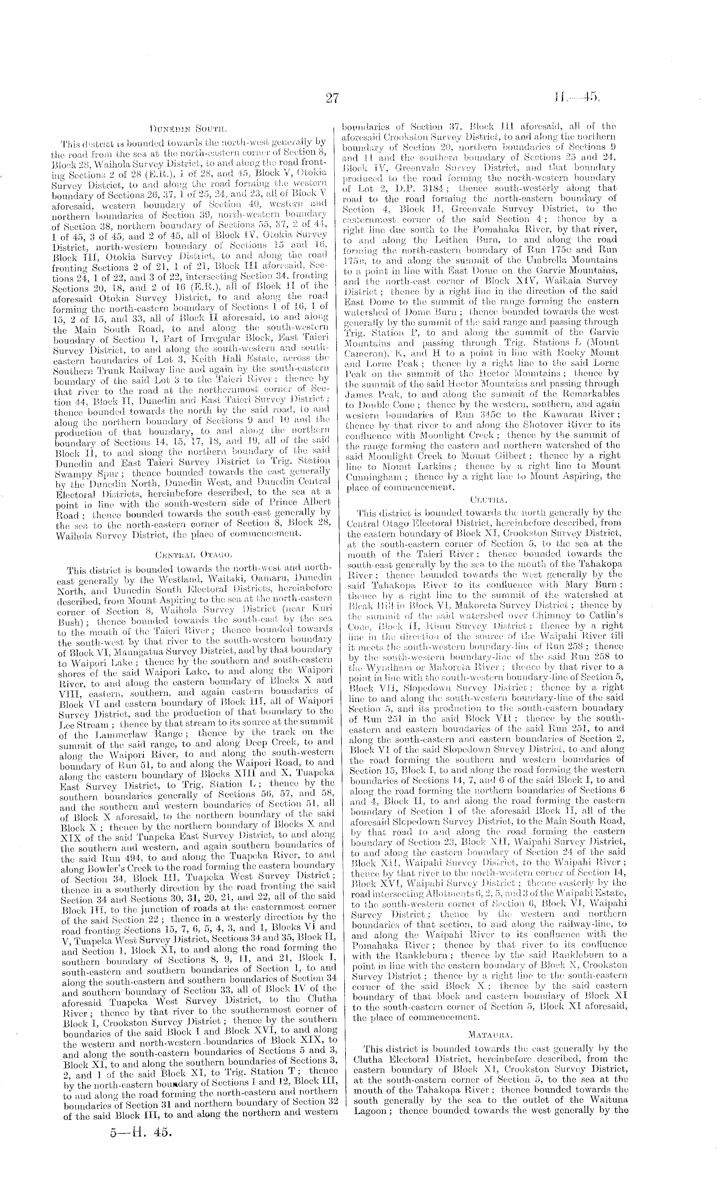 Dunedin South. This district is bounded towards the north-west generally by the road from the sea at the north-eastern corner of Section 8, Block 28, Waihola Survey District, to and along the road fronting Sections 2 of 28 (E.R.), 1 of 28, and 45, Block V, Otokia Survey District, to and along the road forming the western boundary of Sections 26, 37, 1 of 25, 24, and 23, all of Block V aforesaid, western boundary of Section 40, western and northern boundaries of Section 39, north-western boundary of Section 38, northern boundary of Sections 55, 37, 2 of 44, 1 of 45, 3 of 45, and 2 of 45, all of Block IV, Otokia Survey District, north-western boundary of Sections 15 and 16, Block 111, Otokia Survey District, to and along the road fronting Sections 2 of 21, 1 of 21, Block 111 aforesaid, Sections 24, I of 22, and 3 of 22, intersecting Section 34, fronting Sections 20, 18, and 2 of 16 (E.R.), all of Block II of the aforesaid Otokia Survey District, to and along the road forming the north-eastern boundary of Sections 1 of 16, I of 15, 2 of 15, and 33, all of Block II aforesaid, to and along the Main South Road, to and along the south-western boundary of Section 1, Part of Irregular Block, East Taieii Survey District, to and along the south-western and southeastern boundaries of Lot 3, Keith Hall Estate, across the Southern Trunk Railway line and again by the south-eastern boundary of the said Lot 3 to the Taieri River; thence by that river to the road at the northernmost corner of Section 44, Block 11, Dunedin and East Taieri Survey District; thence bounded towards the north by the said road, to and along the northern boundary of Sections 9 and 10 and the production of that boundary, to and along the northern boundary of Sections 14, 15, 17, 18, and 19, all of the said Block 11, to and along the northern boundary of the said Dunedin and East Taieri Survey District to Trig. Station Swampy Spur; thence bounded towards the east generally by the Dunedin North, Dunedin West, and Dunedin Central Electoral Districts, hereinbefore described, to the sea at a point in line with the south-western side of Prince Albert Road ; thence bounded towards the south-east generally by the sea to the north-eastern corner of Section 8, Block 28, Waihola Survey District, the place of commencement. Central Otago. This district is bounded towards the north-west and northeast generally by the Westland, Waitaki, Oamaru, Dunedin North, and Dunedin South Electoral Districts, hereinbefore described, from Mount Aspiring to the sea at the north-eastern corner of Section 8, Waihola Survey District (near Kuri Bush) ; thence bounded towards the south-east by the sea to the mouth of the Taieri River; thence bounded towards the south-west by that river to the south-western boundary of Block VI, Maungatua Survey District, and by that boundary to Waipori Lake ; thence by the southern and south-eastern shores of the said Waipori Lake, to and along the Waipori River, to and along the eastern boundary of Blocks X and VIII, eastern, southern, and again eastern boundaries of Block VI and eastern boundary of Block 111, all of Waipori Survey District, and the production of that boundary to the Lee Stream ; tlience by that stream to its source at the summit of the Lammerlaw Range ; thence by the track on the summit of the said range, to and along Deep Creek, to and along the Waipori River, to and along the south-western boundary of Run 51, to and along the Waipori to and along the eastern boundary of Blocks XIII and X, Tuapeka East Survey District, to Trig. Station L ; thence by the southern boundaries generally of Sections 56, 57, and 58, and the southern and western boundaries of Section 51, all of Block X aforesaid, to the northern boundary of the said Block X ; thence by the northern boundary of Blocks X and XIX of the said Tuapeka East Survey District, to and along the southern and western, and again southern boundaries of the said Run 494, to and along the Tuapeka River, to and along Bowler's Creek to the road forming the eastern boundary of Section 34, Block 111, Tuapeka West Survey District; thence in a southerly direction by the road fronting the said Section 34 and Sections 30, 31, 20, 21, and 22, all of the said Block 111, to the junction of roads at the easternmost corner of the said Section 22 ; thence in a westerly direction by the road fronting Sections 15, 7, 6, 5, 4, 3, and 1, Blocks VI and V Tuapeka West Survey District, Sections 34 and 35, Block 11, and Section 1, Block XI, to and along the road forming the southern boundary of Sections 8, 9, 11, and 21, Block I, south-eastern and southern boundaries of Section 1, to and along the south-eastern and southern boundaries of Section 34 and southern boundary of Section 33, all of Block IV of the aforesaid Tuapeka West Survey District, to the Glutha River ; thence by that river to the southernmost corner of Block I, Crookston Survey District; thence by the southern boundaries of the said Block I and Block XVI, to and along the western and north-western boundaries of Block AiA, to and along the south-eastern boundaries of Sections 5 and 3, Block XI, to and along the southern boundaries of Sections 3, 2, and 1 of the said Block XI, to Trig. Station T; thence by the north-eastern boundary of Sections 1 and I^, to and along the road forming the north-eastern and northern boundaries of Section 31 and northern boundary oi Section 6i of the said Block 111, to and along the northern and western