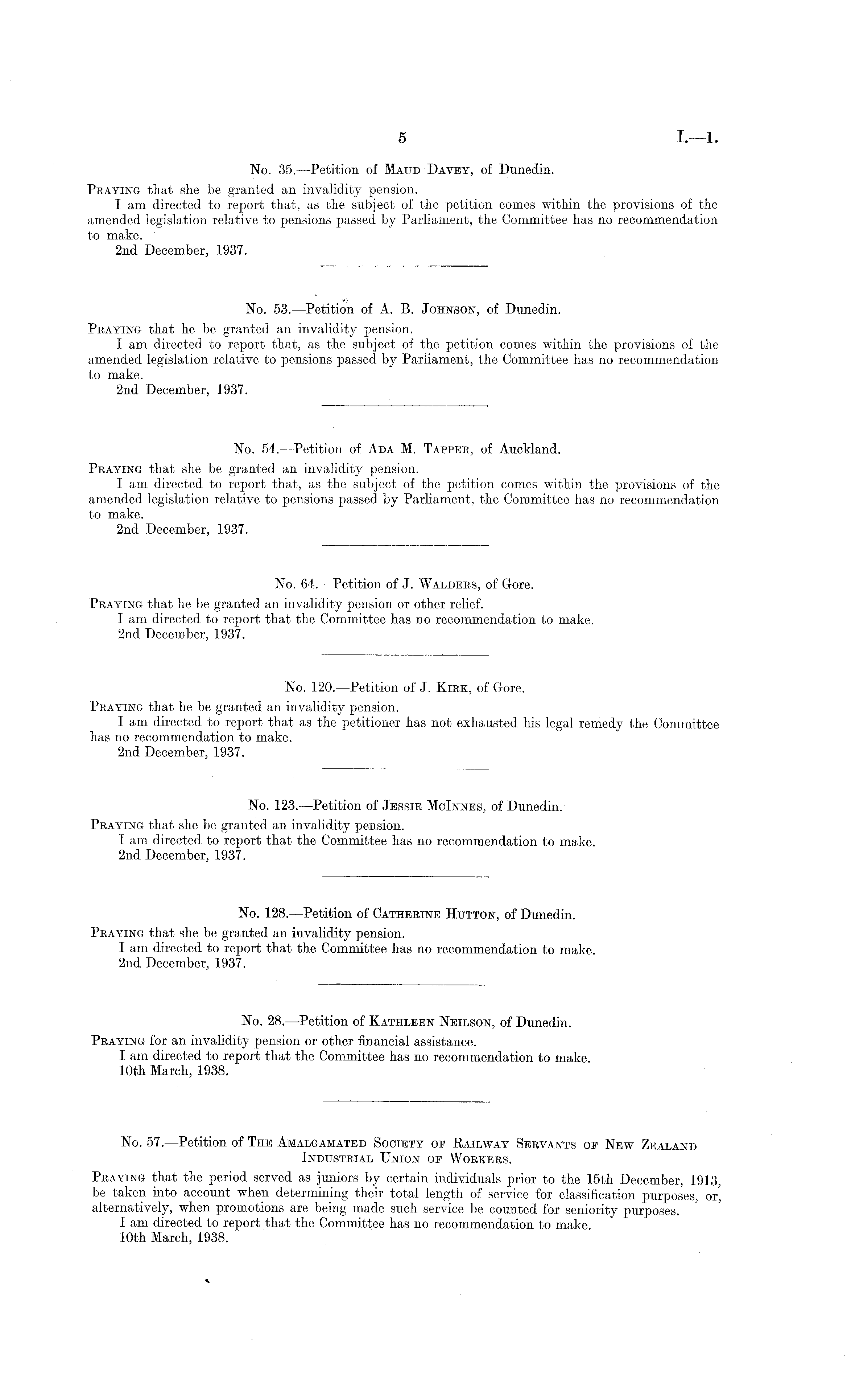 No. 35. —Petition of Maud Davey, of Dunedin. Praying that she be granted an invalidity pension. I am directed to report that, as the subject of the petition comes within the provisions of the amended legislation relative to pensions passed by Parliament, the Committee has no recommendation to make. ' 2nd December, 1937.
