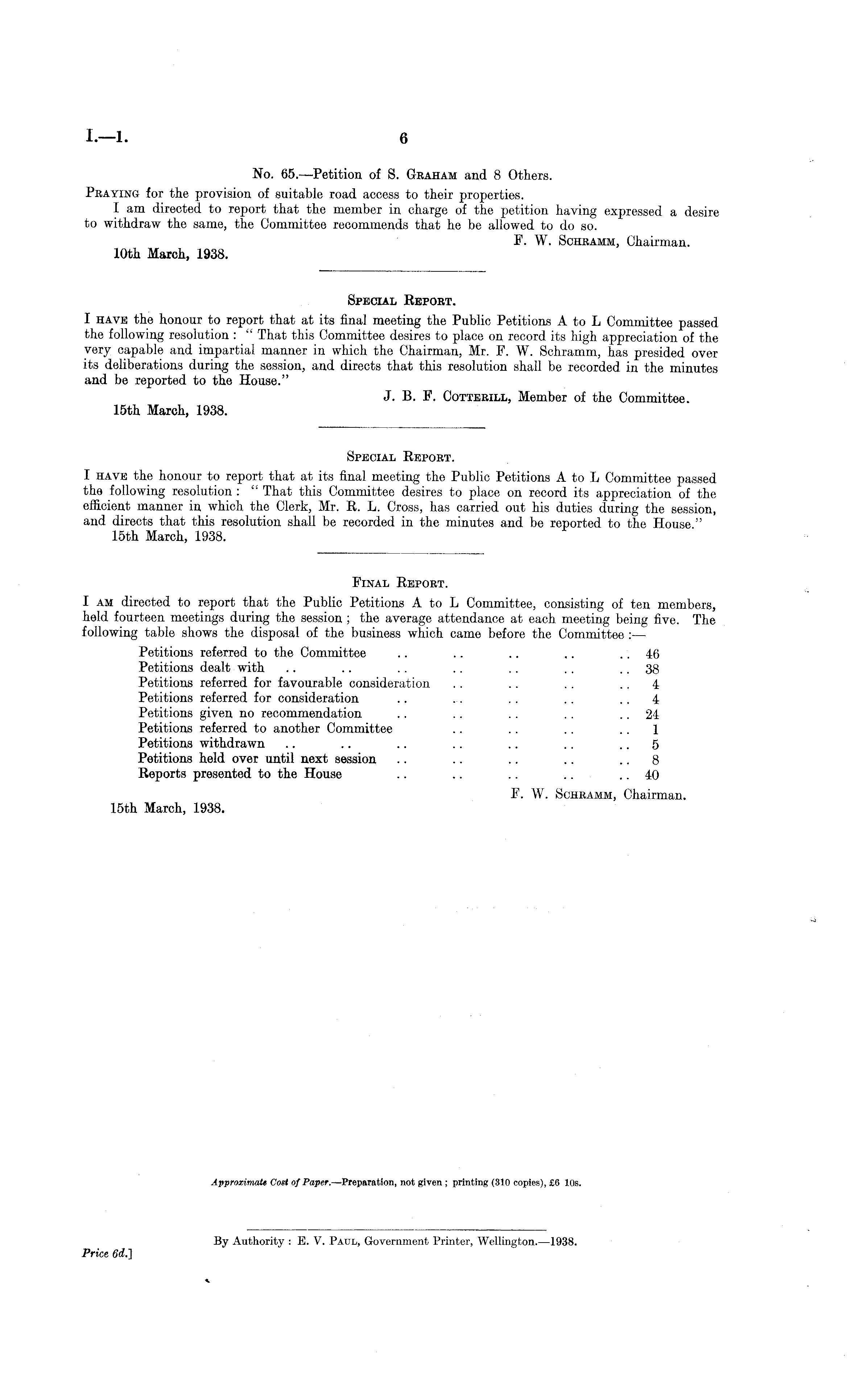 Special Report. I have the honour to report that at its final meeting the Public Petitions A to L Committee passed the following resolution : " That this Committee desires to place on record its high appreciation of the very capable and impartial manner in which the Chairman, Mr. F. W. Schramm, has presided over its deliberations during the session, and directs that this resolution shall be recorded in the minutes and be reported to the House." J. B. F. Cotterill, Member of the Committee. 15th March, 1938.
