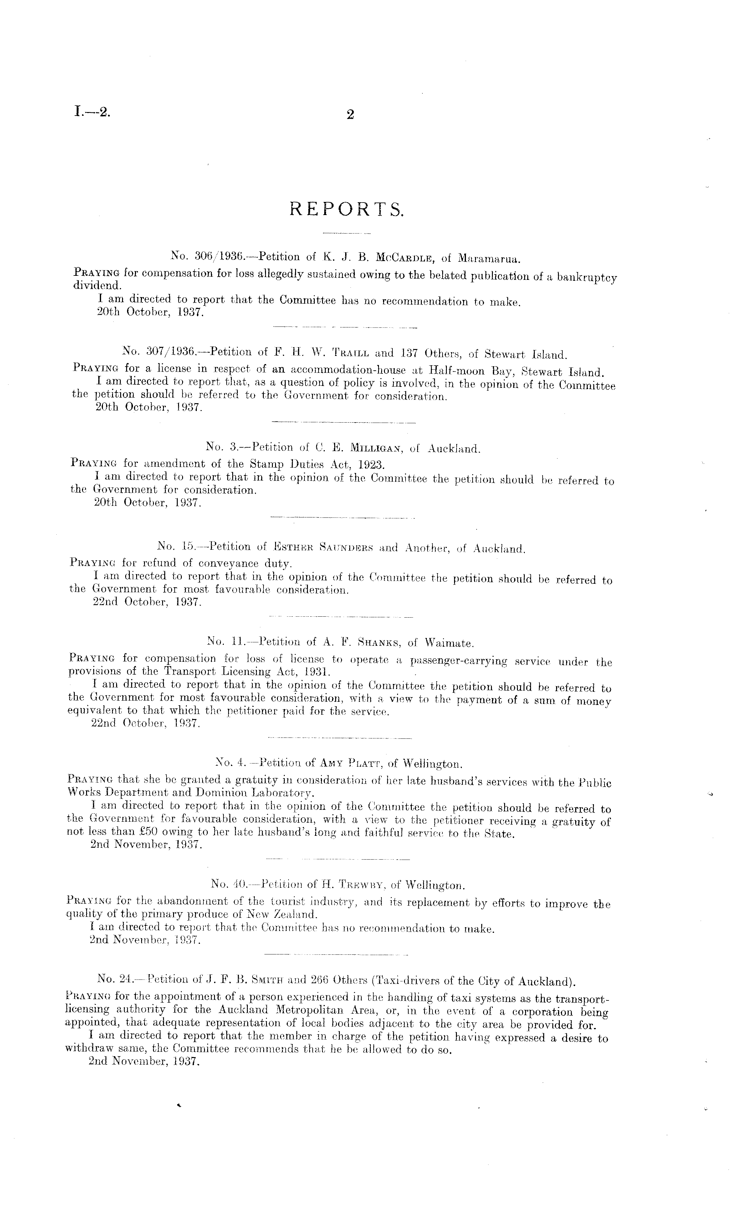 No. 11,—-Petition of A. F. Shanks, of Waimate. Praying for compensation for loss of license to operate a passenger-carrying service under the provisions of the Transport Licensing Act, 1931. I am directed to report that in the opinion of the Committee the petition should be referred to the Government for most favourable consideration, with a view to the payment of a sum of money equivalent to that which the petitioner paid for the service. 22nd October, 1937.