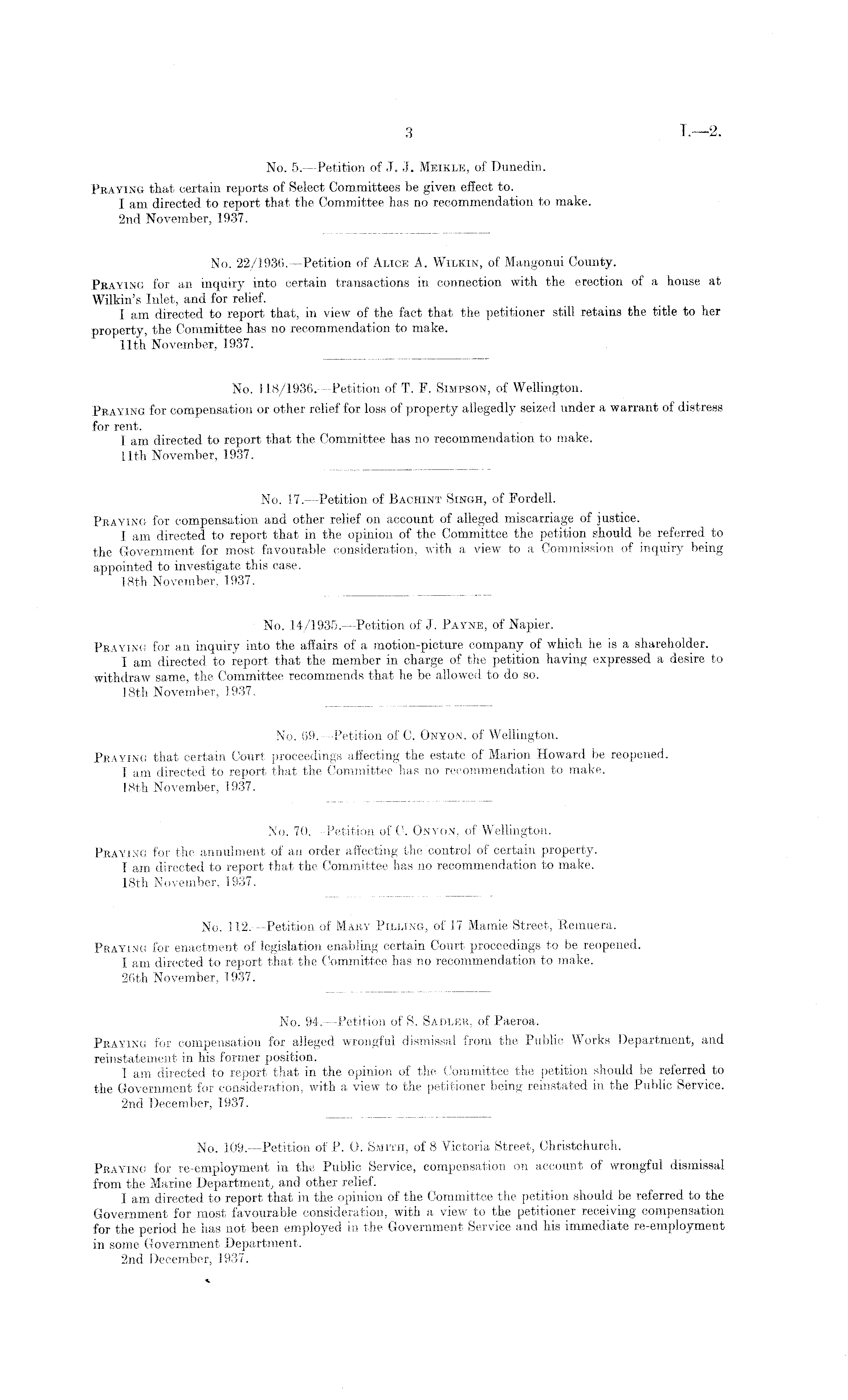 No. 5. —Petition of J. J. Meikle, of Dunedin. Praying that certain reports of Select Committees be given effect to. I am directed to report that the Committee has no recommendation to make. 2nd November, 1937.