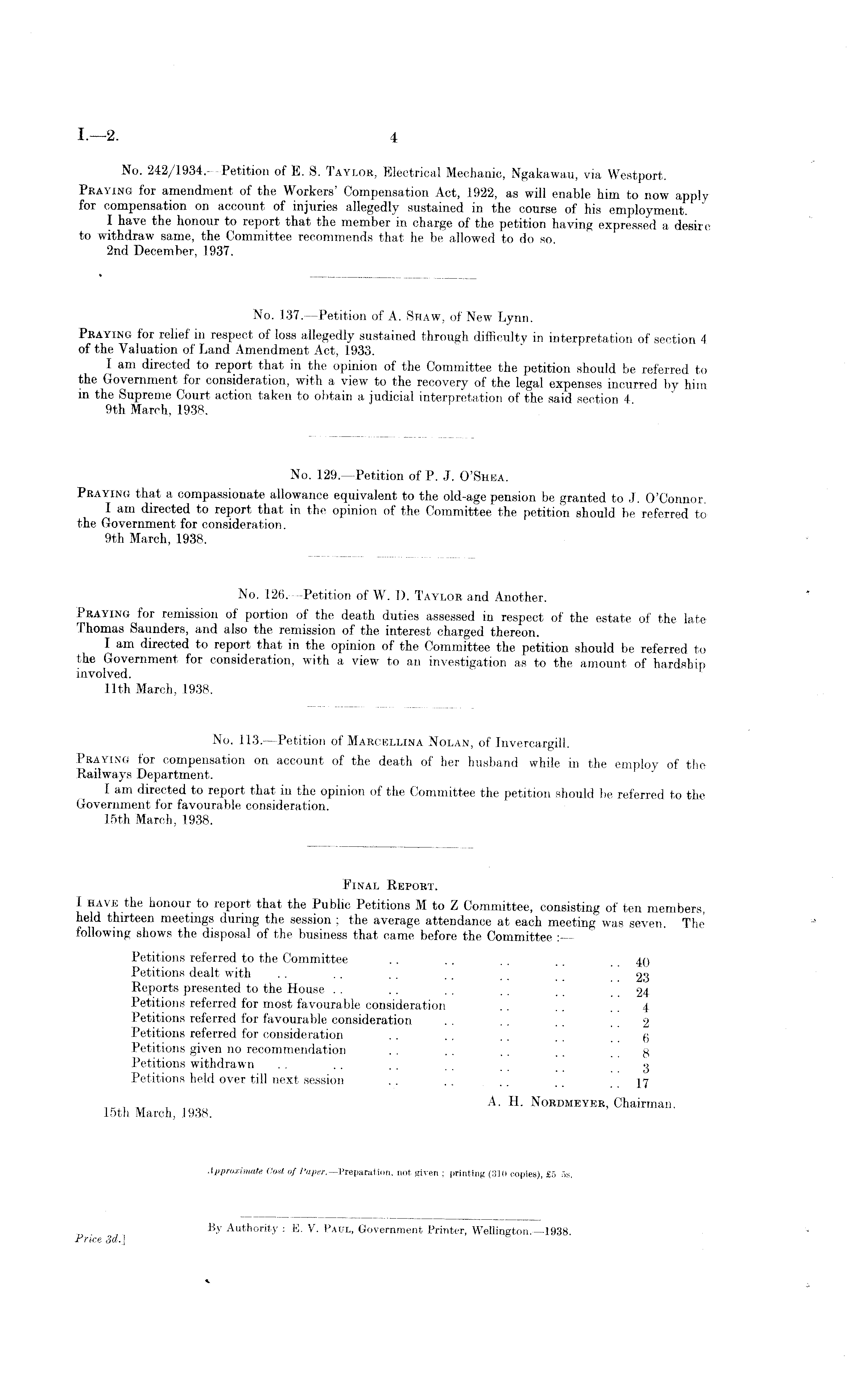 No. 137.—Petition of A. Shaw, of New Lynn. Praying lor relief in respect of loss allegedly sustained through difficulty in interpretation of section 4 of the Valuation of Land Amendment Act, 1933. I am directed to report that in the opinion of the Committee the petition should be referred to the Government for consideration, with a view to the recovery of the legal expenses incurred by him in the Supreme Court action taken to obtain a judicial interpretation of the said section 4. 9th March, 1938.
