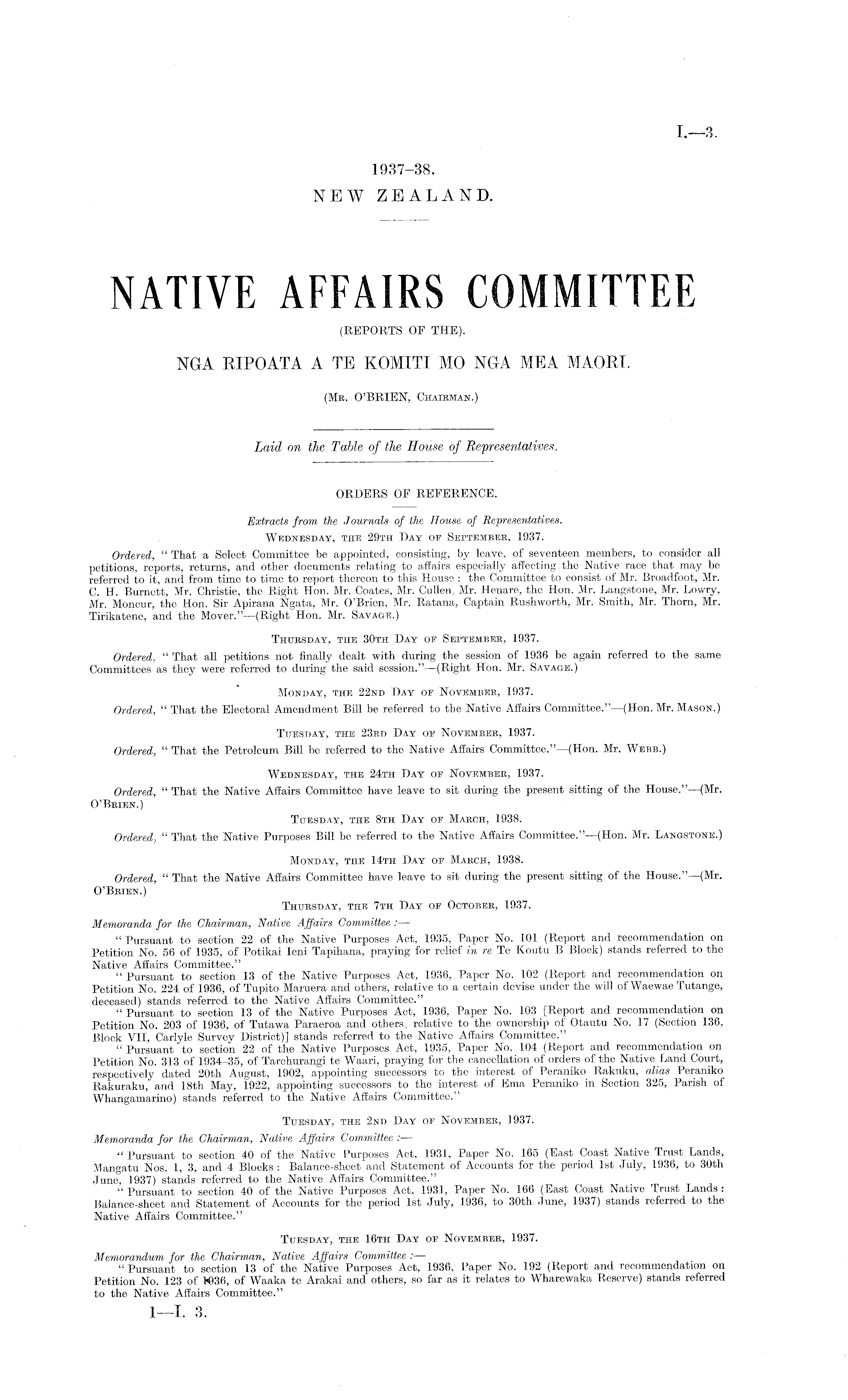 Extracts from the Journals of the House of Representatives. Wednesday, the 29th Day oe September, 1937. Ordered, " That a Select Committee be appointed, consisting, by leave, of seventeen members, to consider all petitions, reports, returns, and other documents relating to affairs especially affecting the Native race that may be referred to it, and from time to time to report thereon to this House : the Committee to consist of Mr. Broadfoot, Mr. C. H. Burnett, Mr. Christie, the Right Hon. Mr. Coates, Mr. Cullen, Mr. Henare, the Hon. Mr. Langstone, Mr. Lowry, Mr. Moncur, the Hon. Sir Apirana Ngata, Mr. O'Brien, Mr. Ratana, Captain Rushworth, Mr. Smith, Mr. Thorn, Mr. Tirikatene, and the Mover."—(Right Hon. Mr. Savage.) Thursday, the 30th Day of September, 1937. Ordered, " That all petitions not finally dealt with during the session of 1936 be again referred to the same Committees as they were referred to during the said session." —(Right Hon. Mr. Savage.) Monday, the 22nd Day oe November, 1937. Ordered, " That the Electoral Amendment Bill be referred to the Native Affairs Committee." —(Hon. Mr. Mason.) Tuesday, the 23rd Day oe November, 1937. Ordered, " That the Petroleum Bill be referred to the Native Affairs Committee." —(Hon. Mr. Webb.) Wednesday, the 24th Day op November, 1937. Ordered, " That the Native Affairs Committee have leave to sit during the present sitting of the House." —(Mr. O'Brien.) Tuesday, the Bth Day oe March, 1938. Ordered, " That the Native Purposes Bill be referred to the Native Affairs Committee." —(Hon. Mr. Langstone.) Monday, the 14th Day oe March, 1938. Ordered, " That the Native Affairs Committee have leave to sit during the present sitting of the House." —(Mr. O'Brien.) Thursday, the 7th Day oe October, 1937. Memoranda for the Chairman, Native Affairs Committee :— " Pursuant to section 22 of the Native Purposes Act, 1935, Paper No. 101 (Report and recommendation on Petition No. 56 of 1935, of Potikai leni Tapihana, praying for relief in re Te Koutu B Block) stands referred to the Native Affairs Committee." " Pursuant to section 13 of the Native Purposes Act, 1936, Paper No. 102 (Report and recommendation on Petition No. 224 of 1936, of Tupito Maruera and others, relative to a certain devise under the will of Waewae Tutange, deceased) stands referred to the Native Affairs Committee." " Pursuant to section 13 of the Native Purposes Act, 1936, Paper No. 103 [Report and recommendation on Petition No. 203 of 1936, of Tutawa Paraeroa and others, relative to the ownership of Otautu No. 17 (Section 136, Block VII, Carlyle Survey District)] stands referred to the Native Affairs Committee." " Pursuant to section 22 of the Native Purposes Act, 1935, Paper No. 104 (Report and recommendation on Petition No. 313 of 1934-35, of Tarehurangi te Waari, praying for the cancellation of orders of the Native Land Court, respectively dated 20th August, 1902, appointing successors to the interest of Peraniko Rakuku, alias Peraniko Rakuraku, and 18th May, 1922, appointing successors to the interest of Ema Peraniko in Section 325, Parish of Whangamarino) stands referred to the Native Affairs Committee." Tuesday, the 2nd Day oe November, 1937. Memoranda for the Chairman, Native Affairs Committee :— " Pursuant to section 40 of the Native Purposes Act, 1931, Paper No. 165 (East Coast Native Trust Lands, Mangatu Nos. 1, 3, and 4 Blocks : Balance-sheet and Statement of Accounts for the period Ist July, 1936, to 30th June, 1937) stands referred to the Native Affairs Committee." " Pursuant to section 40 of the Native Purposes Act, 1931, Paper No. 166 (East Coast Native Trust Lands : Balance-sheet and Statement of Accounts for the period Ist July, 1936, to 30th June, 1937) stands referred to the Native Affairs Committee." Tuesday, the 16th Day oe November, 1937. Memorandum for the Chairman, Native Affairs Committee :— " Pursuant to section 13 of the Native Purposes Act, 1936, Paper No. 192 (Report and recommendation on Petition No. 123 of >036, of Waaka te Arakai and others, so far as it relates to Wharewaka Reserve) stands referred to the Native Affairs Committee."