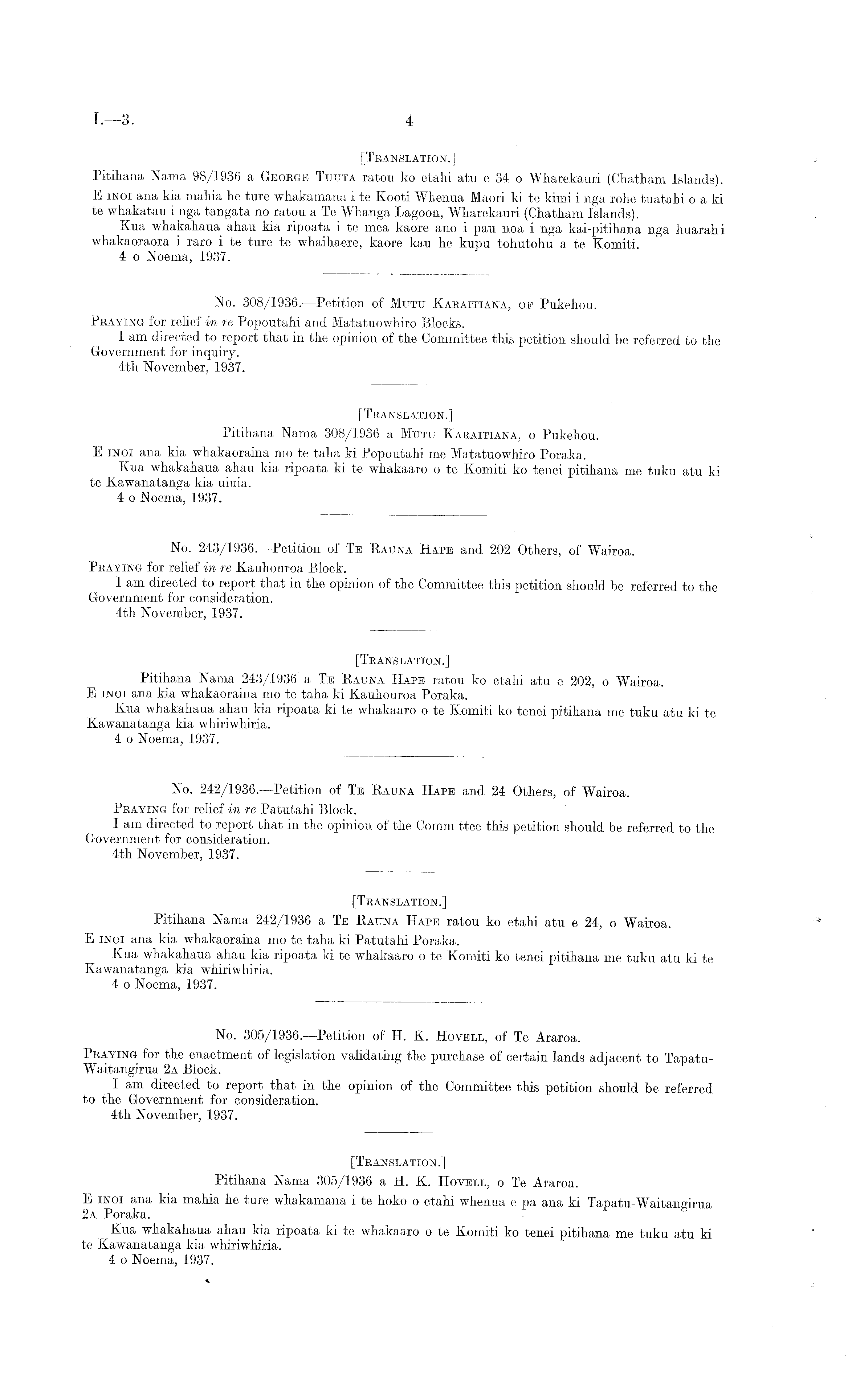 [Translation.] Pitihana Nama 308/1936 a Mutu Karaitiana, o Pukehou. E inoi ana kia whakaoraina mo te taha ki Popoutahi me Matatuowhiro Poraka. Kua whakahaua ahau kia ripoata kite whakaaro o te Komiti ko tenei pitihana me tuku atu ki te Kawanatanga kia uiuia. 4 o Noema, 1937.