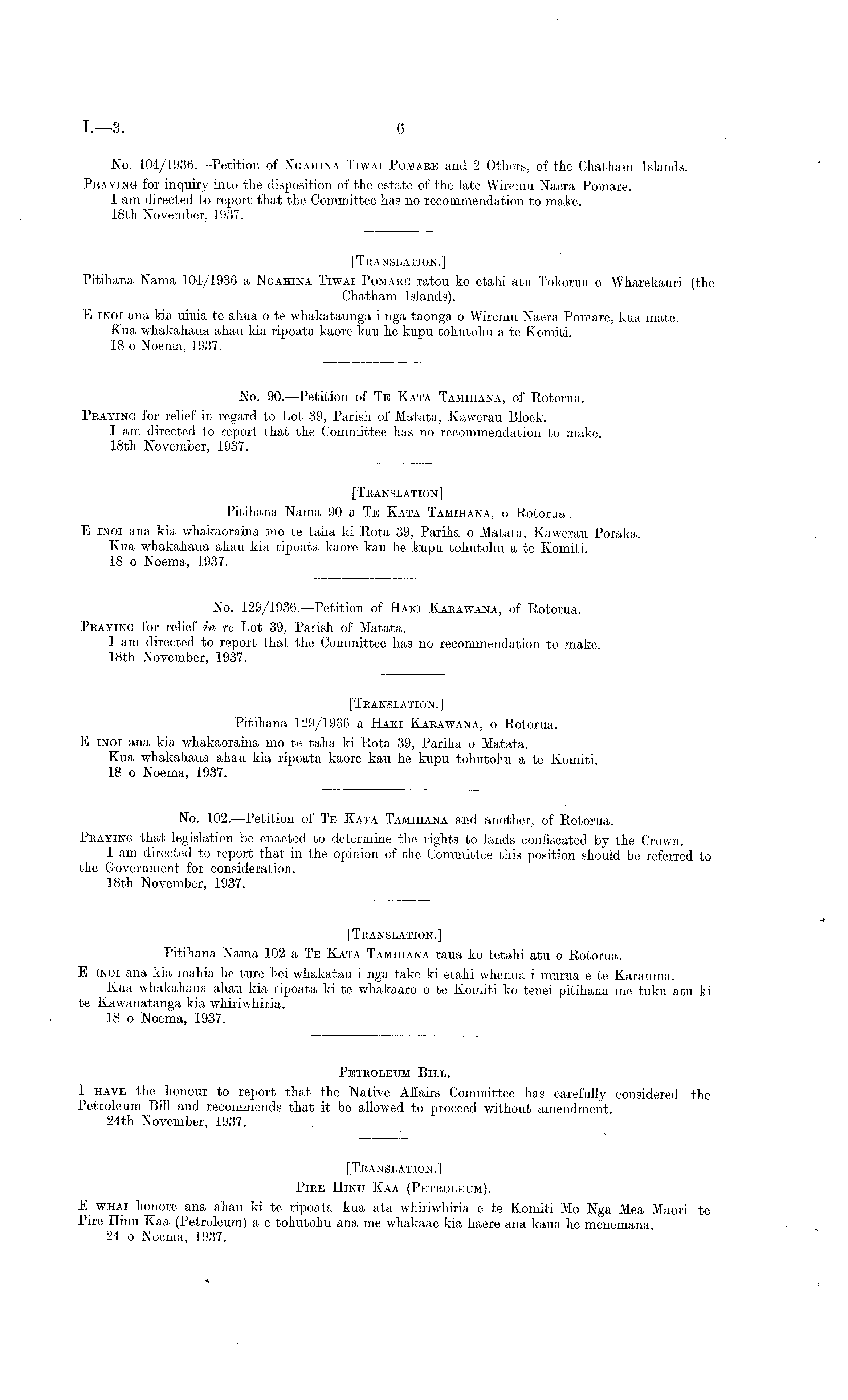[Translation.] Pire Hinu Kaa (Petroleum). E whai honore ana ahau kite ripoata kua ata whiriwhiria e te Komiti Mo Nga Mea Maori te Pire Hinu Kaa (Petroleum) a e tohutohu ana me whakaae kia haere ana kaua he menemana. 24 o Noema, 1937.
