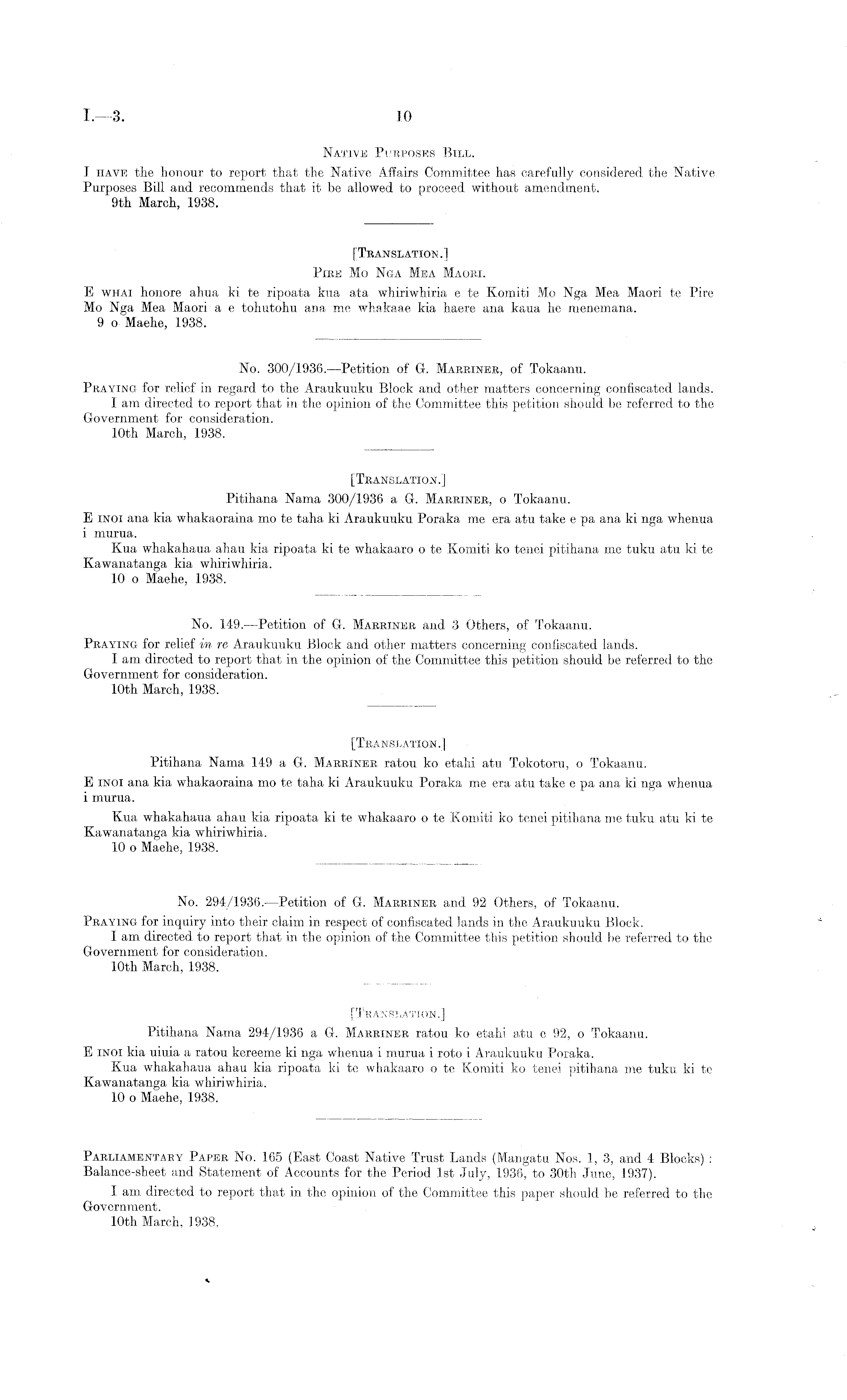 [Translation.] Pitihana Nama 294/1936 a G. Marriner ratou ko etahi atu e 92, o Tokaanu. E inoi kia uiuia a ratou kereeme ki nga whenua i murua i roto i Araukuuku Poraka. Kua whakahaua ahau kia ripoata kite whakaaro o te Komiti ko tenei pitihana me tuku kite Kawanatanga kia whiriwhiria. 10 o Maehe, 1938.
