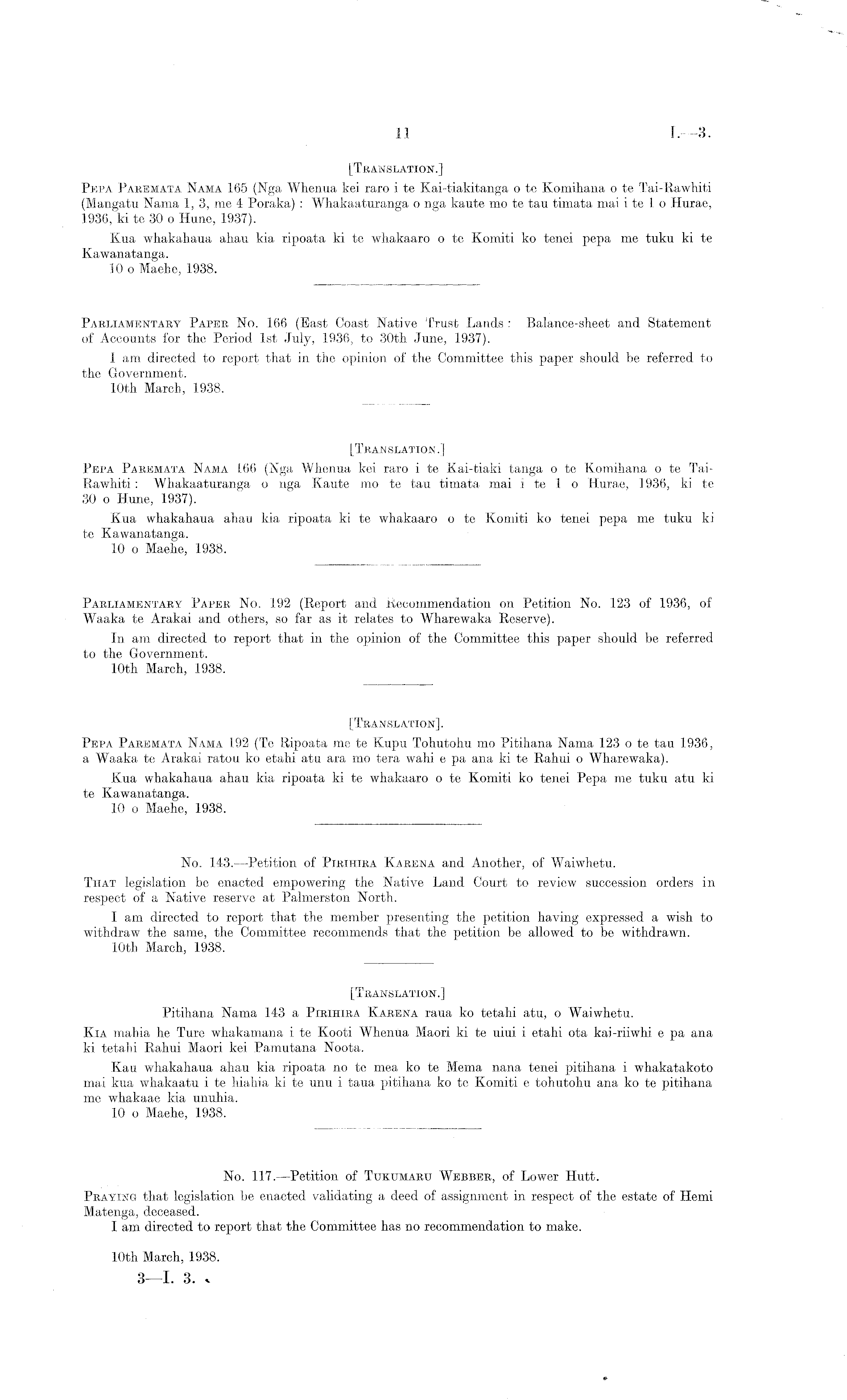 [Translation.] Pitihana Nama 143 a Pibihira Karena raua ko tetahi atu, o Waiwhetu. Kia mahia he Ture whakamana i te Kooti Whenua Maori kite uiui i etahi ota kai-riiwhi e pa ana ki tetahi Rahui Maori kei Pamutana Noota. Kau whakahaua ahau kia ripoata no te mea ko te Mema nana tenei pitihana i whakatakoto mai kua whakaatu i te hiahia kite mm i taua pitihana ko te Komiti e tohutohu ana ko te pitihana me whakaae kia unuhia. 10 o Maehe, 1938.