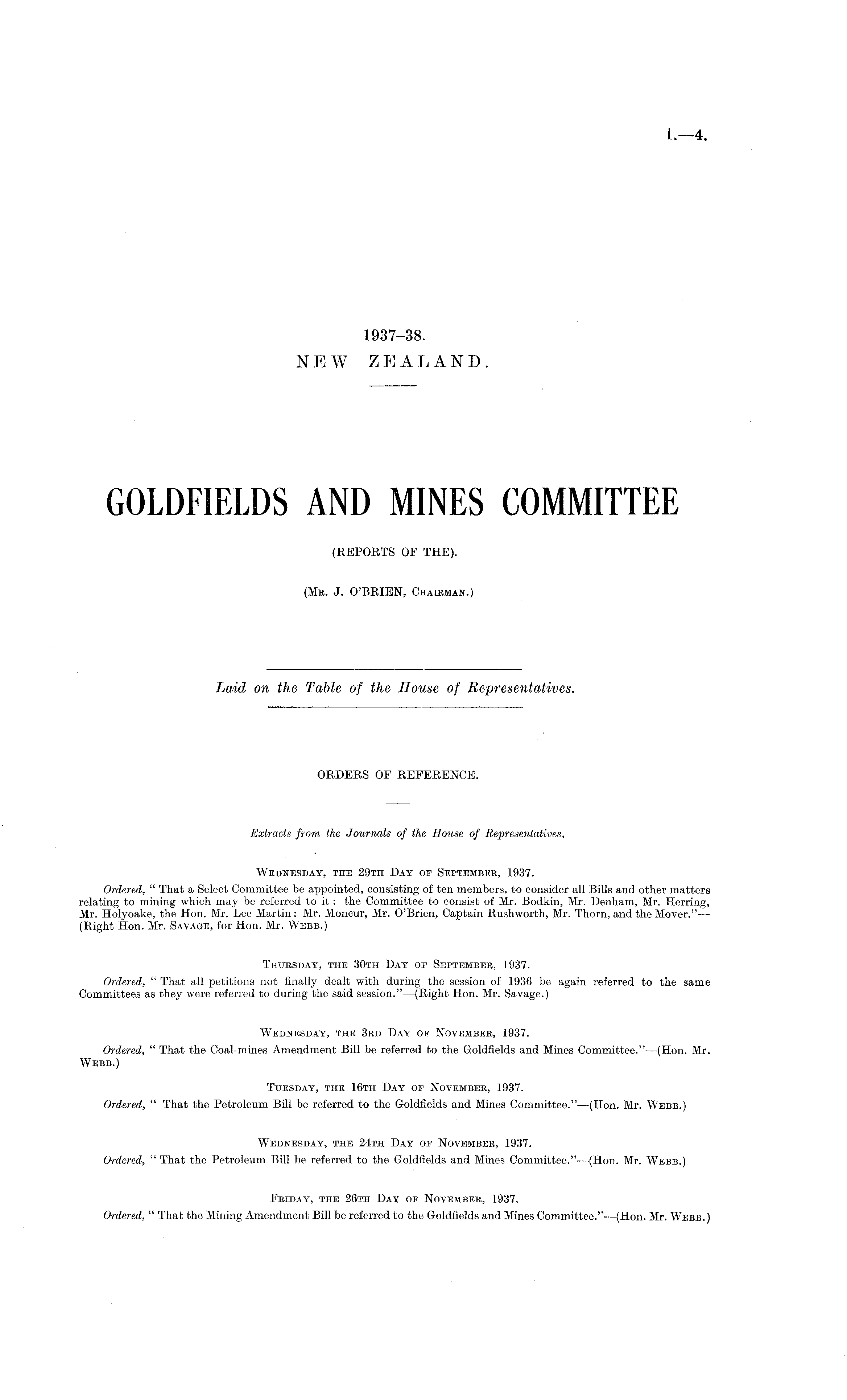 Extracts from the Journals of the House of Representatives. Wednesday, the 29th Day of September, 1937. Ordered, " That a Select Committee be appointed, consisting of ten members, to consider all Bills and other matters relating to mining which may be referred to it: the Committee to consist of Mr. Bodkin, Mr. Denham, Mr. Herring, Mr. Holyoake, the Hon. Mr. Lee Martin: Mr. Moneur, Mr. O'Brien, Captain Rushworth, Mr. Thorn, and the Mover." — (Right Hon. Mr. Savage, for Hon. Mr. Webb.) Thursday, the 30th Day of September, 1937. Ordered, " That all petitions not finally dealt with during the session of 1936 be again referred to the same Committees as they were referred to during the said session."—(Right Hon. Mr. Savage.) Wednesday, the 3rd Day of November, 1937. Ordered, " That the Coal-mines Amendment Bill be referred to the Goldfields and Mines Committee."—(Hon. Mr. Webb.) Tuesday, the 16th Day or November, 1937. Ordered, " That the Petroleum Bill be referred to the Goldfields and Mines Committee."—(Hon. Mr. Webb.) Wednesday, the 24th Day of November, 1937. Ordered, " That the Petroleum Bill be referred to the Goldfields and Mines Committee."—(Hon. Mr. Webb.) Friday, the 26th Day of November, 1937. Ordered, " That the Mining Amendment Bill be referred to the Goldfields and Mines Committee."—(Hon. Mr. Webb.)