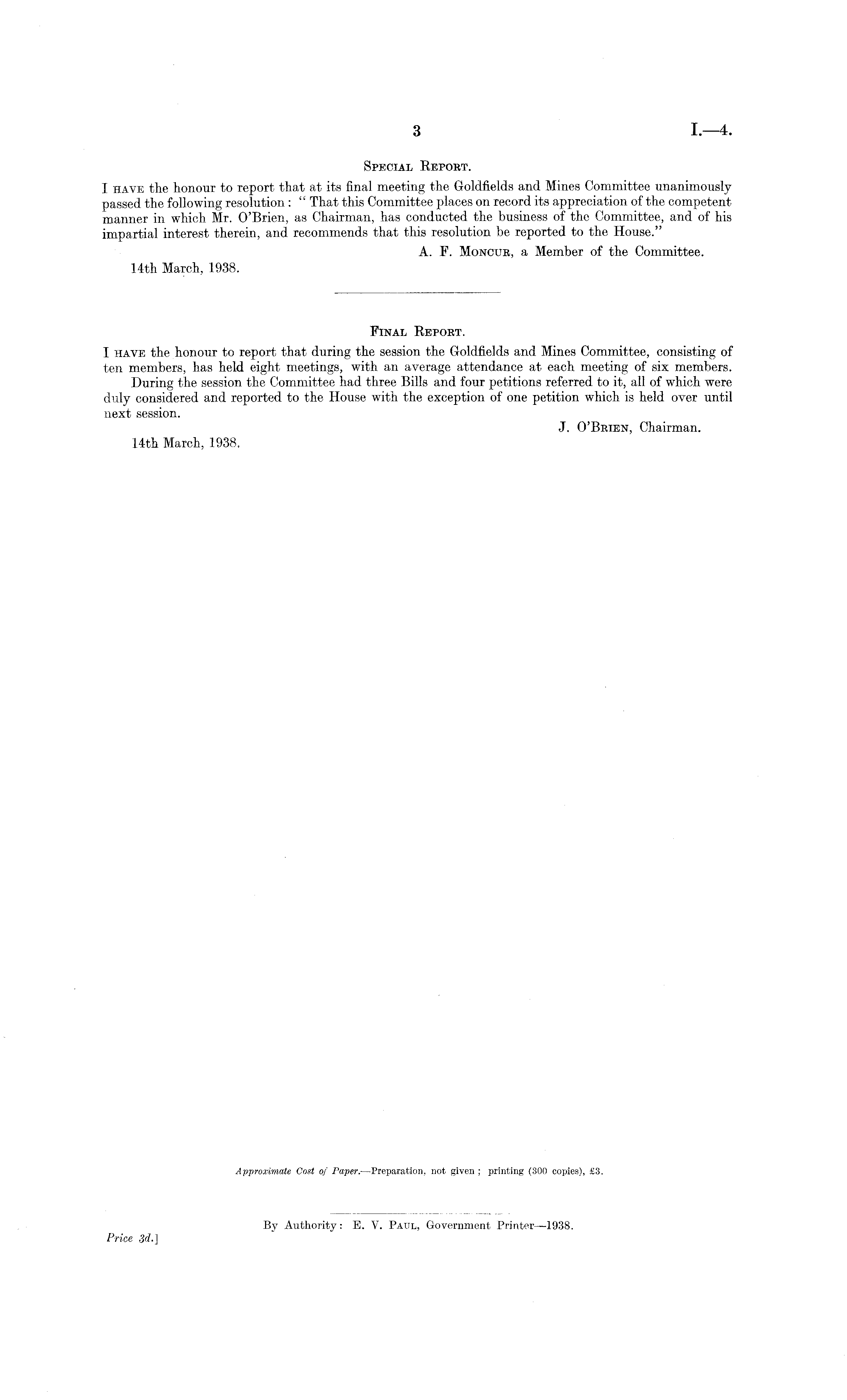 Special Report. I have the honour to report that at its final meeting the Goldfields and Mines Committee unanimously passed the following resolution : " That this Committee places on record its appreciation of the competent manner in which Mr. O'Brien, as Chairman, has conducted the business of the Committee, and of his impartial interest therein, and recommends that this resolution be reported to the House." A. F. Moncur, a Member of the Committee. 14th March, 1938.