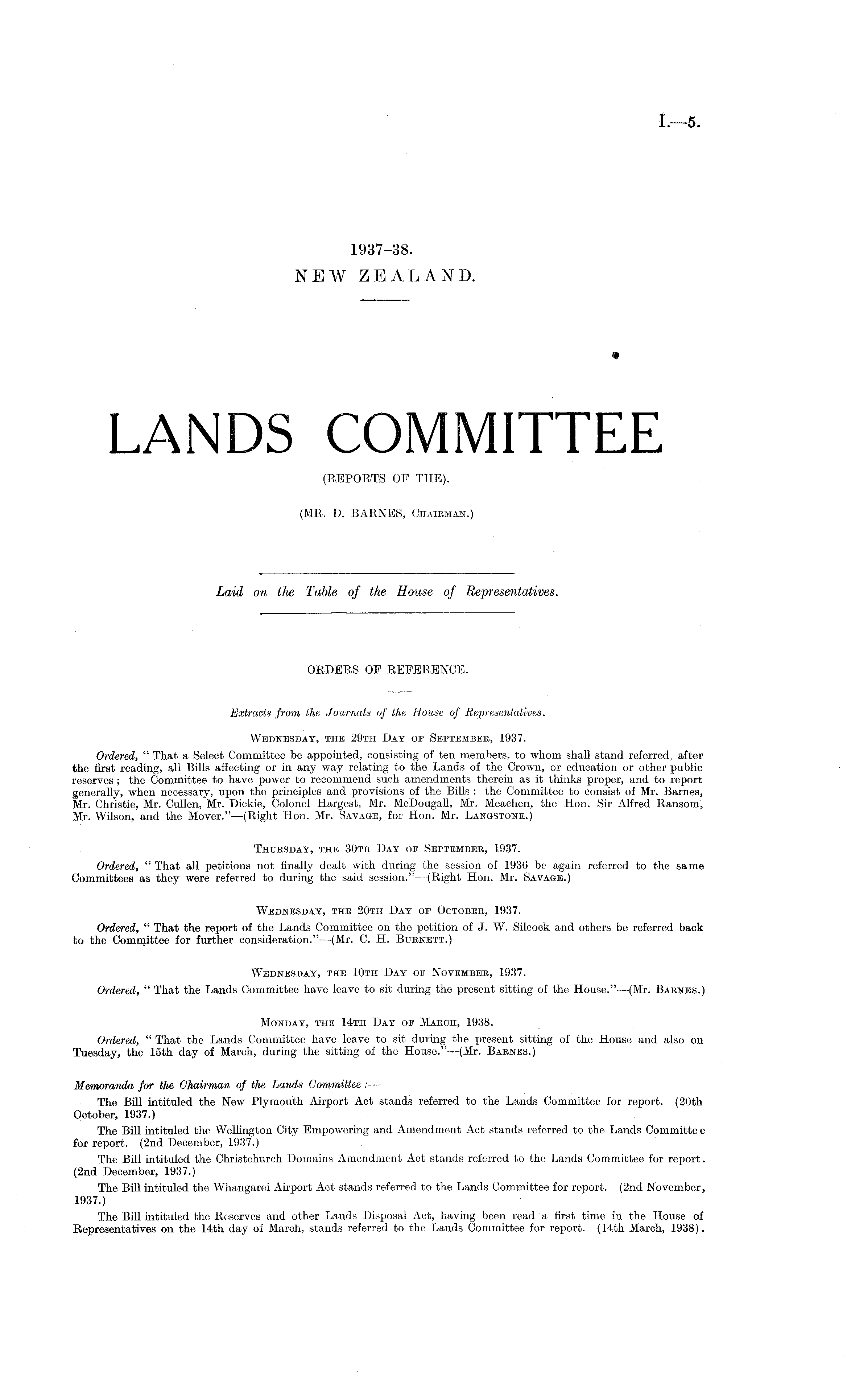 Extracts from the Journals of the House of Representatives. Wednesday, the 29th Day of September, 1937. Ordered, " That a Select Committee be appointed, consisting of ten members, to whom shall stand referred, after the first reading, all Bills affecting or in any way relating to the Lands of the Crown, or education or other public reserves ; the Committee to have power to recommend such amendments therein as it thinks proper, and to report generally, when necessary, upon the principles and provisions of the Bills : the Committee to consist of Mr. Barnes, Mr. Christie, Mr. Cullen, Mr. Dickie, Colonel Hargest, Mr. McDougall, Mr. Meachen, the Hon. Sir Alfred Ransom, Mr. Wilson, and the Mover." —(Right Hon. Mr. Savage, for Hon. Mr. Langstone.) Thursday, the 30th Day of September, 1937. Ordered, " That all petitions not finally dealt with during the session of 1936 be again referred to the same Committees as they were referred to during the said session." —(Right Hon. Mr. Savage.) Wednesday, the 20th Day of October, 1937. Ordered, " That the report of the Lands Committee on the petition of J. W. Silcock and others be referred back to the Comrqittee for further consideration." —(Mr. C. H. Burnett.) Wednesday, the 10th Day of November, 1937. Ordered, " That the Lands Committee have leave to sit during the present sitting of the House." —(Mr. Barnes.) Monday, the 14th Day of March, 1938. Ordered, " That the Lands Committee have leave to sit during the present sitting of the House and also on Tuesday, the 15th day of March, during the sitthig of the House."—(Mr. Barnes.) Memoranda for the Chairman of the Lands Committee :— The Bill intituled the New Plymouth Airport Act stands referred to the Lands Committee for report. (20th October, 1937.) The Bill intituled the Wellington City Empowering and Amendment Act stands referred to the Lands Committee for report. (2nd December, 1937.) The Bill intituled the Christchurch Domains Amendment Act stands referred to the Lands Committee for report. (2nd December, 1937.) The Bill intituled the Whangarei Airport Act stands referred to the Lands Committee for report. (2nd November, 1937.) The Bill intituled the Reserves and other Lands Disposal Act, having been read a first time in the House of Representatives on the 14th day of March, stands referred to the Lands Committee for report. (14th March, 1938).