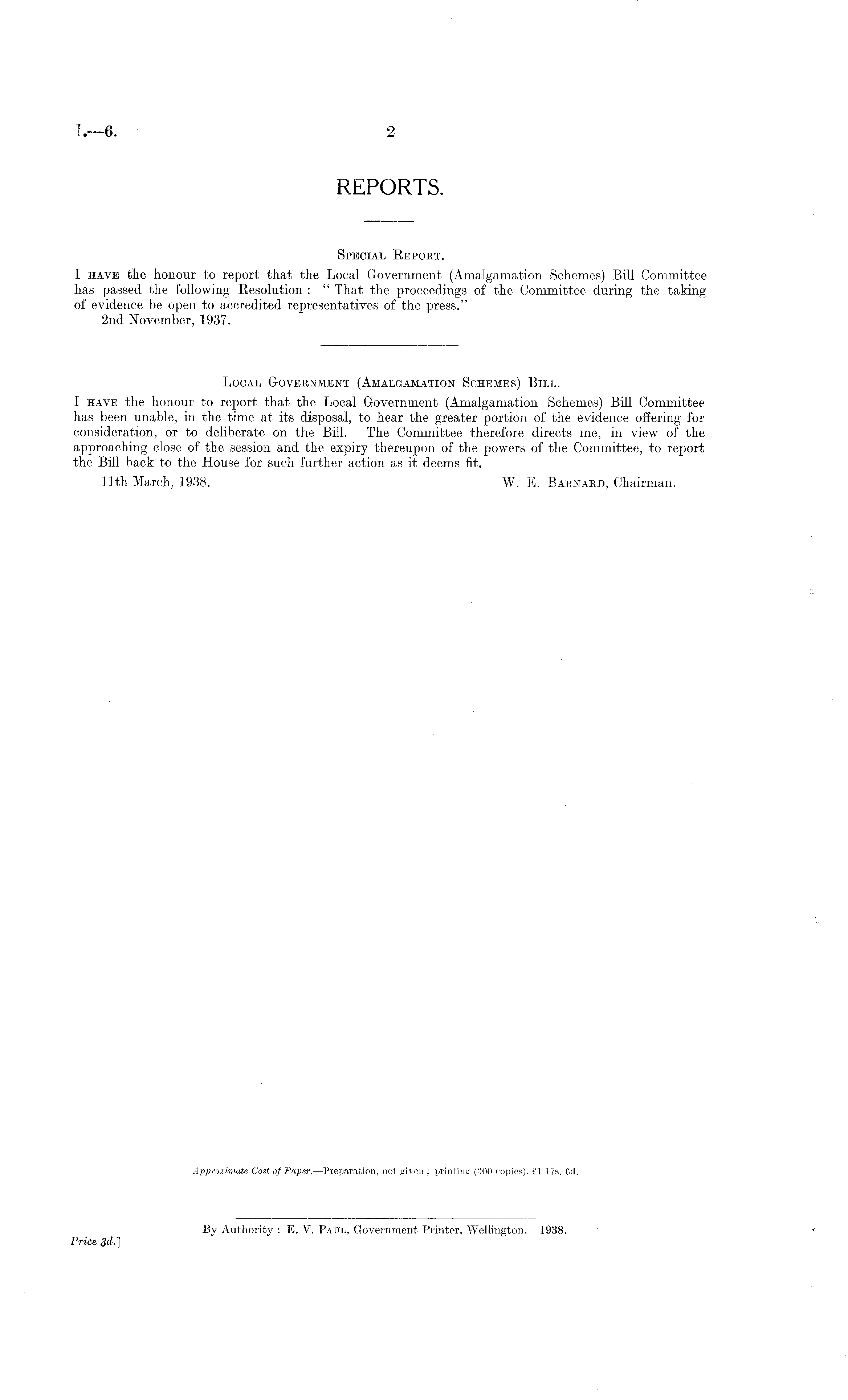 Special Report. I have the honour to report that the Local Government (Amalgamation Schemes) Bill Committee has passed the following Resolution : " That the proceedings of the Committee during the taking of evidence be open to accredited representatives of the press." 2nd November, 1937.
