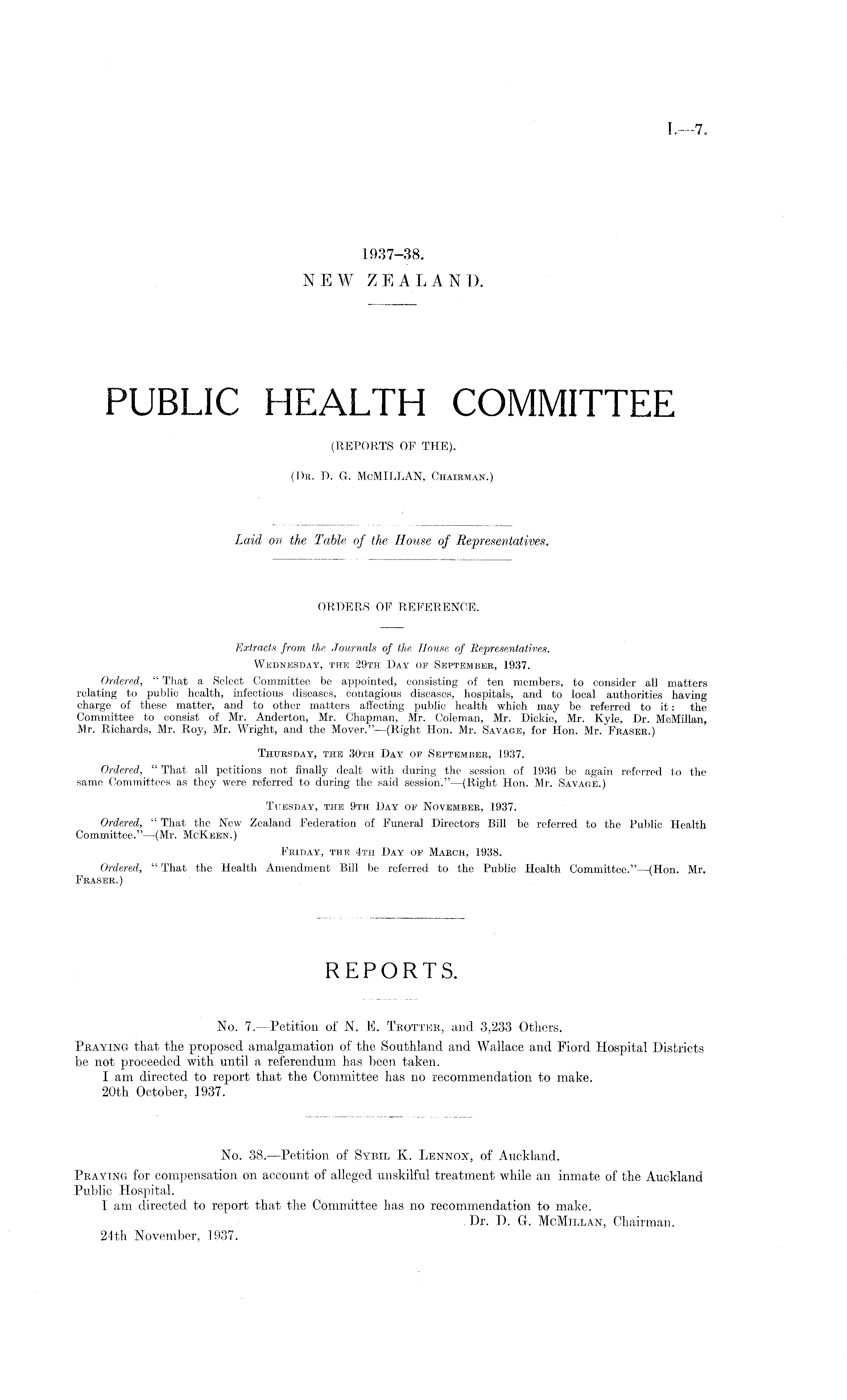 Extracts from the Journals of the House of Representatives. Wednesday, the 29th Day of September, 1937. Ordered, " That a Select Committee be appointed, consisting of ten members, to consider all matters relating to public health, infectious diseases, contagious diseases, hospitals, and to local authorities having charge of these matter, and to other matters affecting public health which may be referred to it: the Committee to consist of Mr. Anderton, Mr. Chapman, Mr. Coleman, Mr. Dickie, Mr. Kyle, Dr. McMillan, Mr. Richards, Mr. Roy, Mr. Wright, and the Mover." —(Right Hon. Mr. Savage, for Hon. Mr. Fraser.) Thursday, the 30th Day of September, 1937. Ordered, " That all petitions not finally dealt with during the session of 1930 be again referred to the same Committees as they were referred to during the said session." —(Right Hon. Mr. Savage.) Tuesday, the 9th Day of November, 1937. Ordered, " That the New Zealand Federation of Funeral Directors Bill be referred to the Public Health Committee." —(Mr. McKeen.) Friday, the 4th Day of March, 1938. Ordered', " That the Health Amendment Bill be referred to the Public Health Committee."—(Hon. Mr. Fraser.)