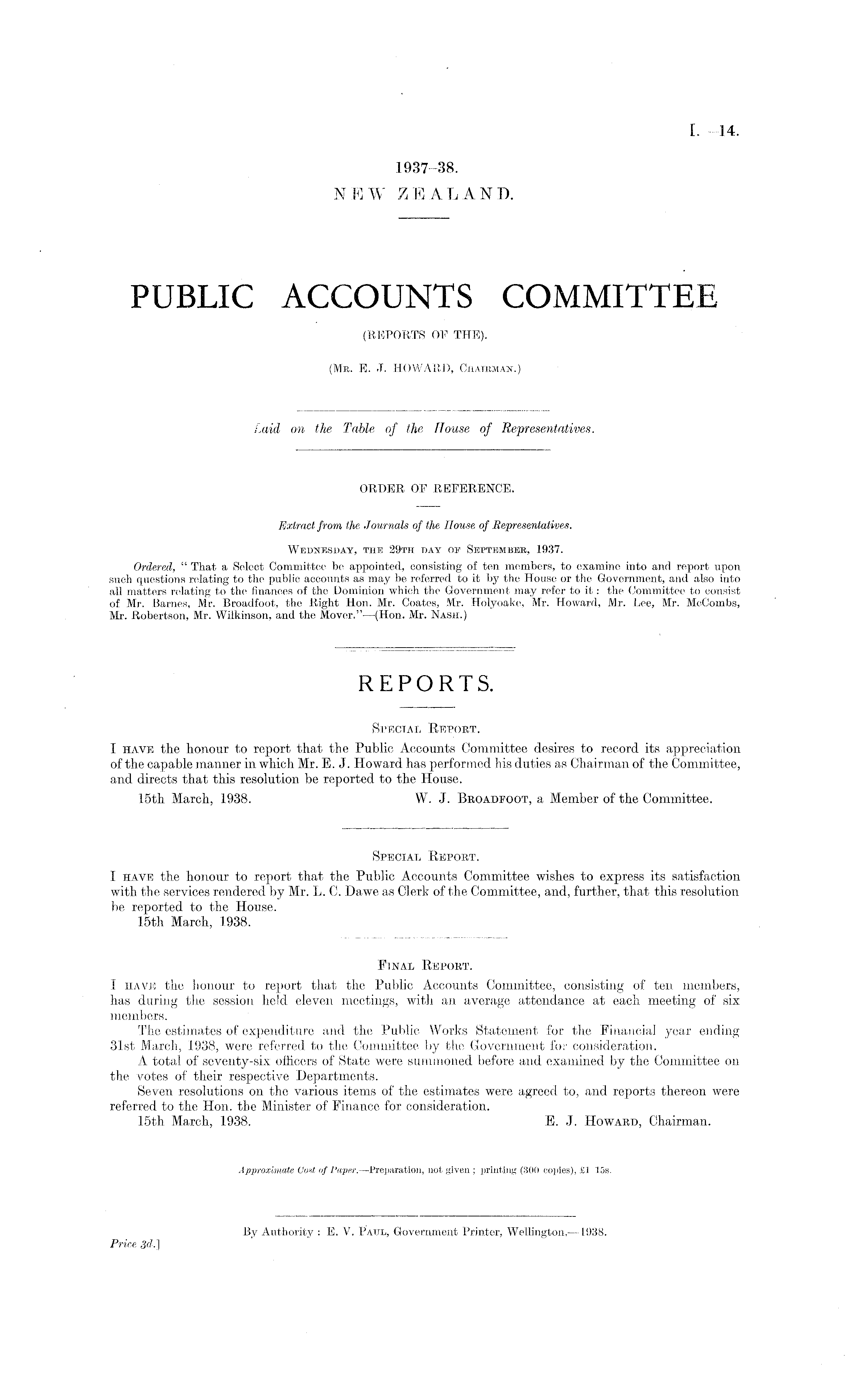 Special Report. I have the honour to report that the Public Accounts Committee desires to record its appreciation of the capable manner in which Mr. E. J. Howard has performed his duties as Chairman of the Committee, and directs that this resolution be reported to the House. 15th March, 1938. W. J. Broadfoot, a Member of the Committee.